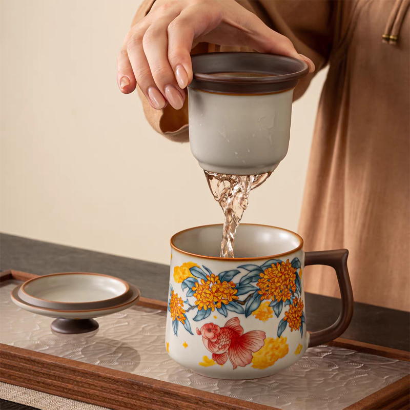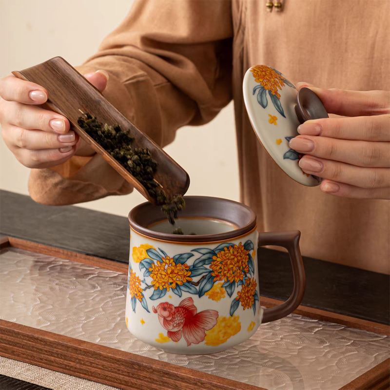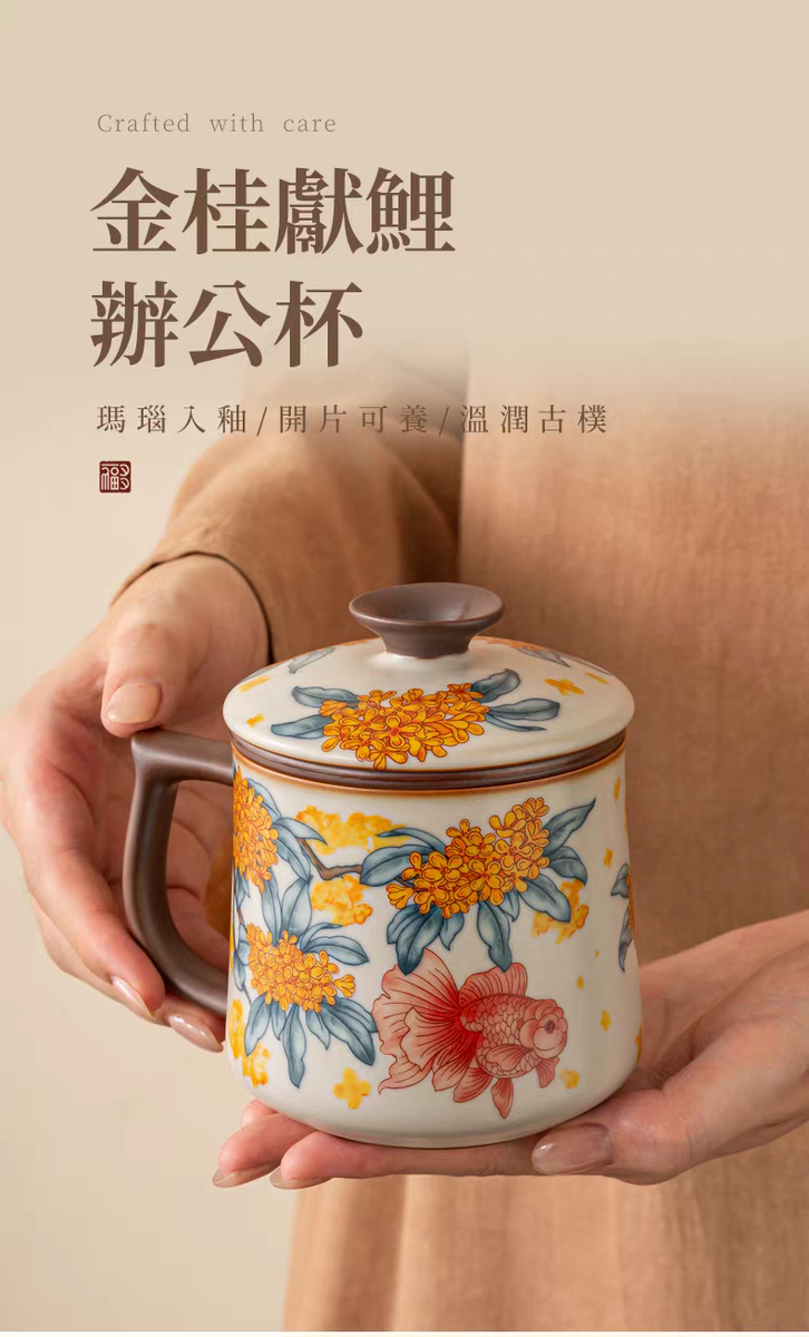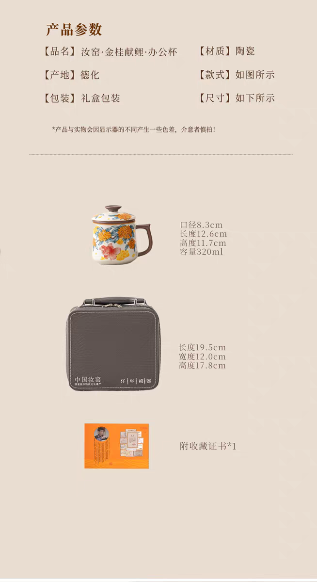 金鲤桂花,寓意金贵.亚黄汝瓷,玛瑙入釉,蝉翼开片;家有千财万贯,不如汝窑一片。独家专利技术新品;画面堆料技术,富有立体浮雕质感,真实感强。杯身开片