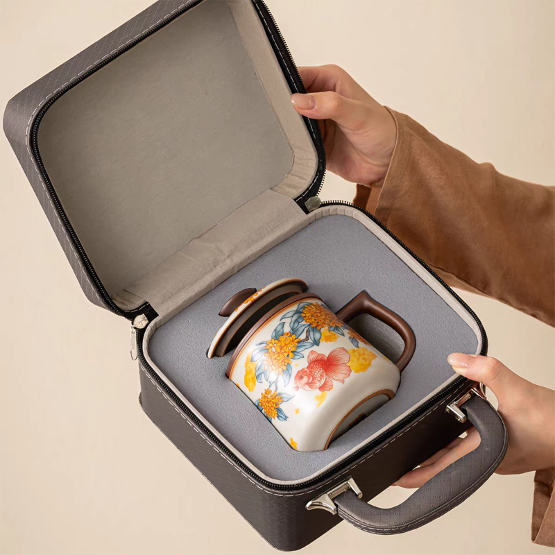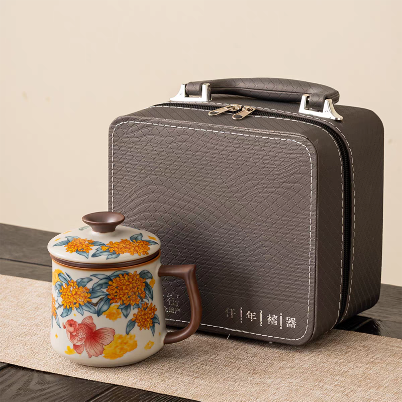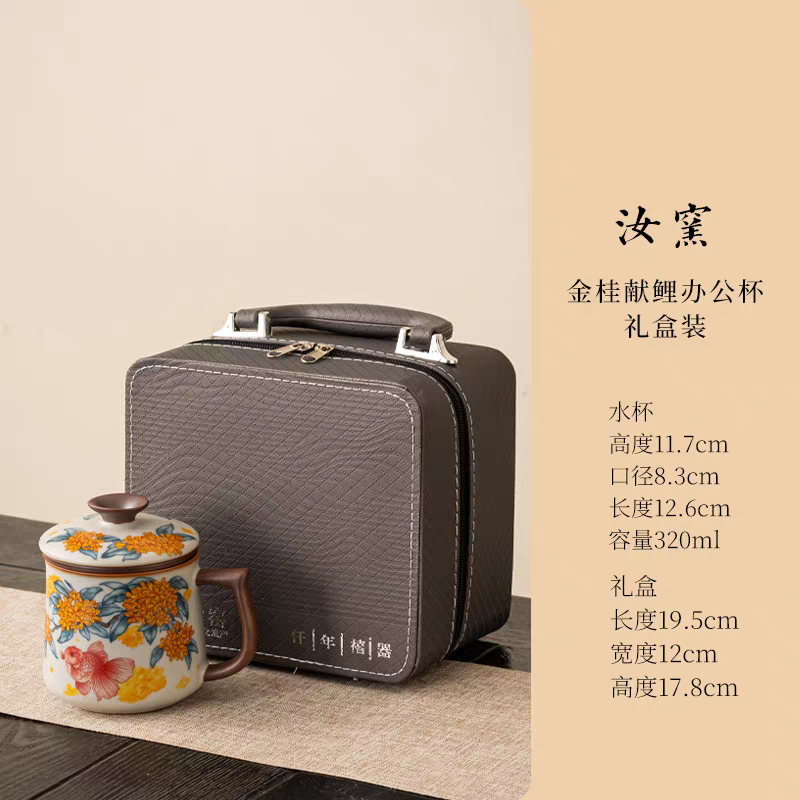 金桂献鲤亚黄汝窑办公杯皮盒装
