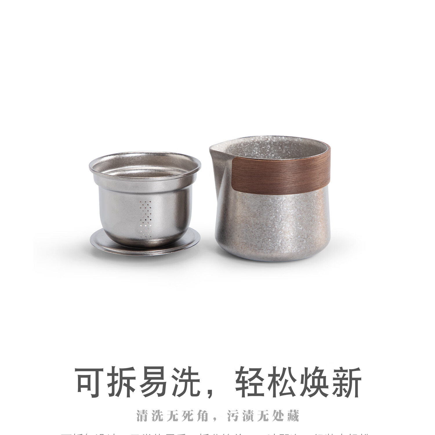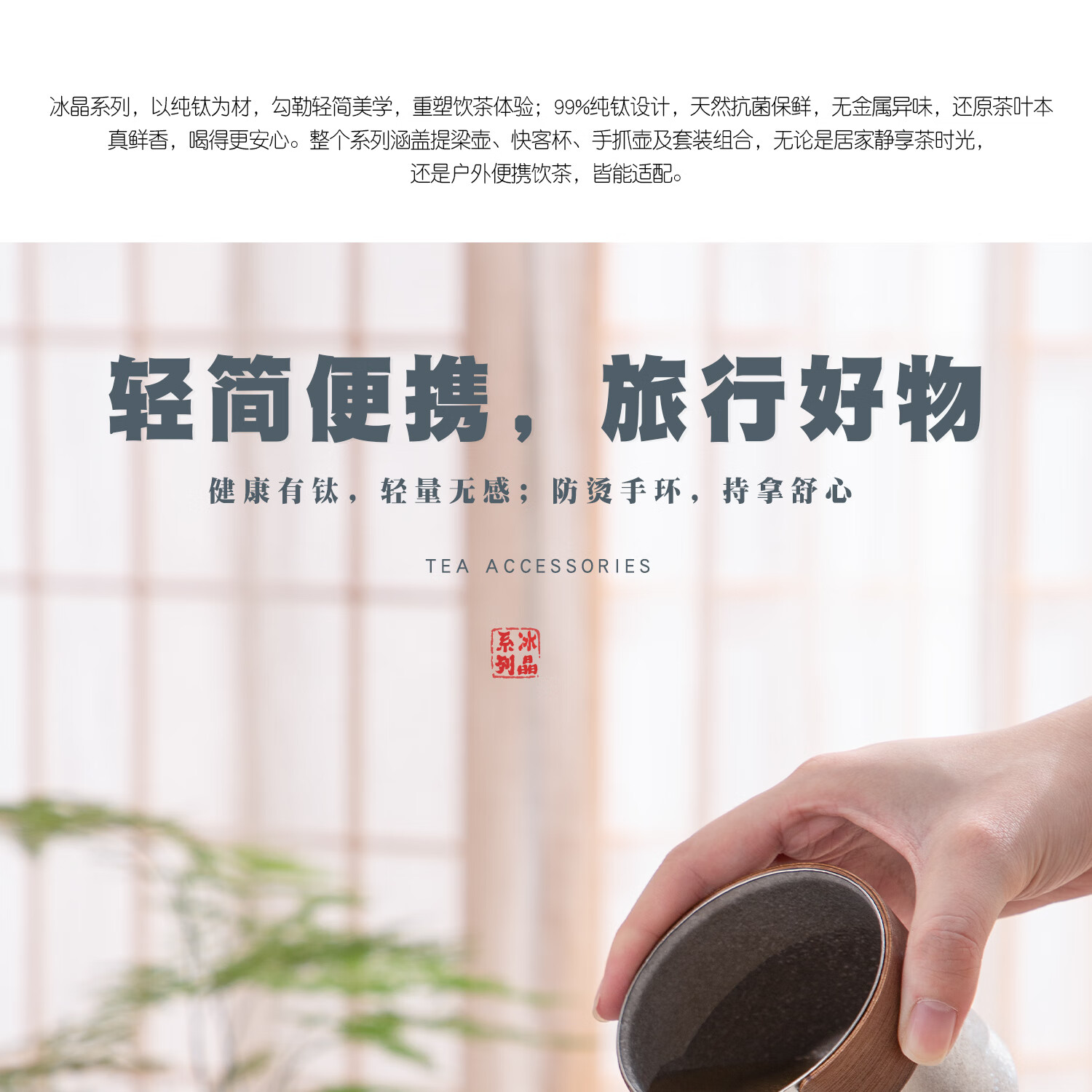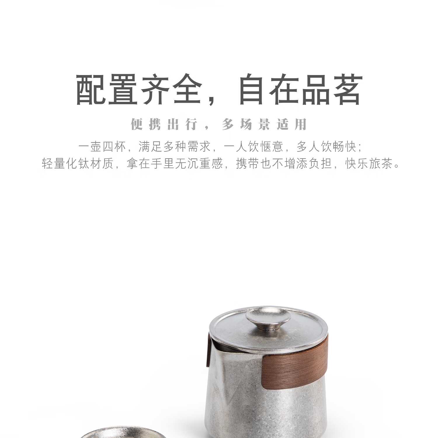 以纯钛为材,勾勒轻简美学,重塑饮茶体验;99%纯钛;天然抗菌保鲜,无金属异味;还原茶叶本真鲜香,喝得更安心