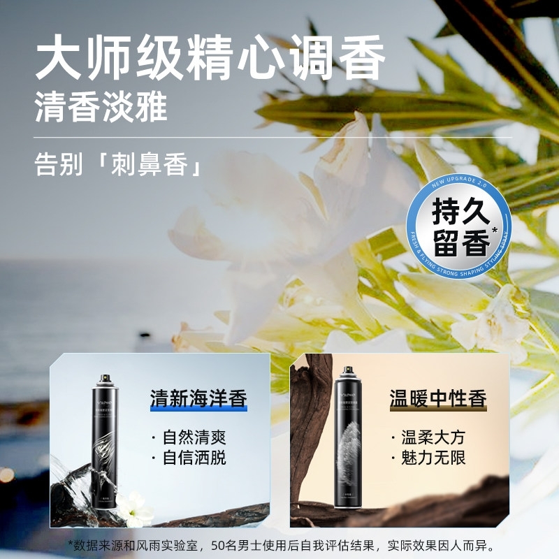 持久定型:这款喷雾具备出色的定型能力;喷雾细腻:喷雾细腻均匀,能够快速覆盖头发;两种香型,满足多样需求:海洋香型,中性香型