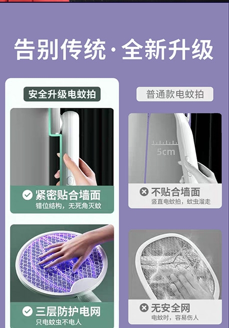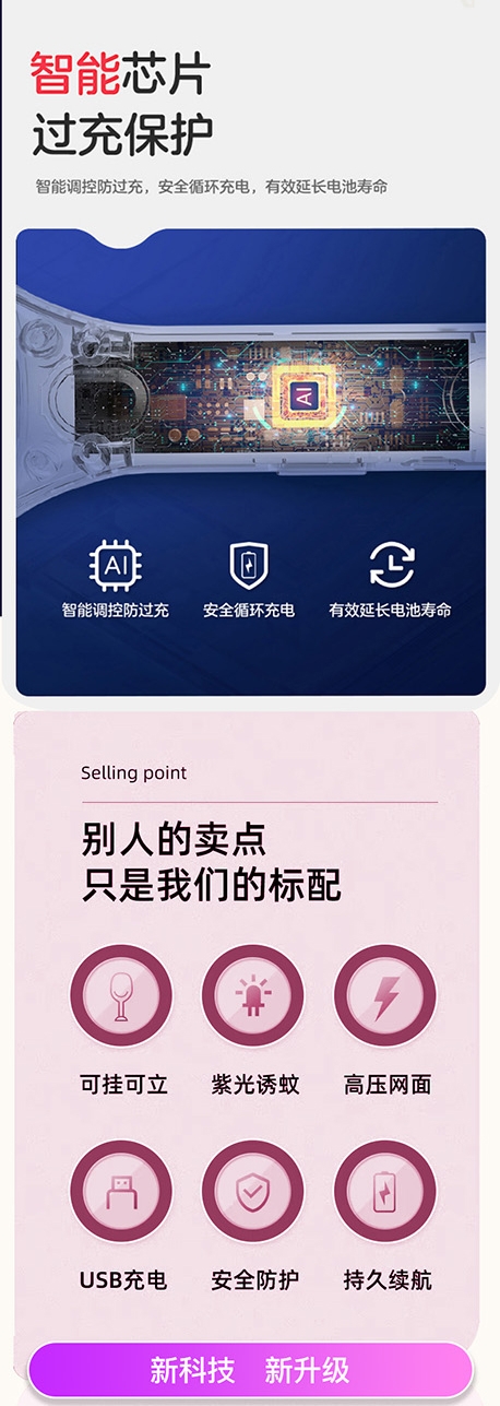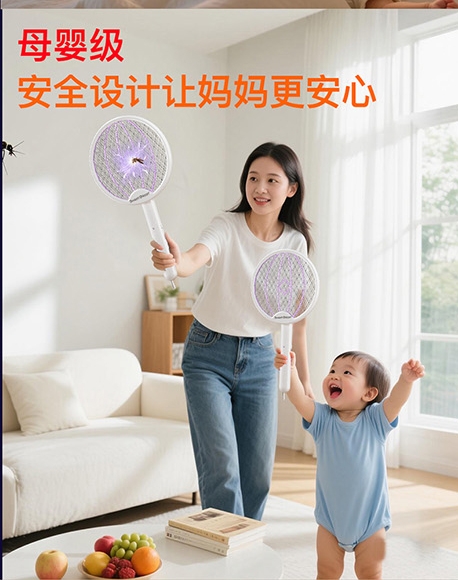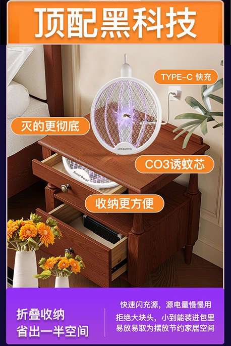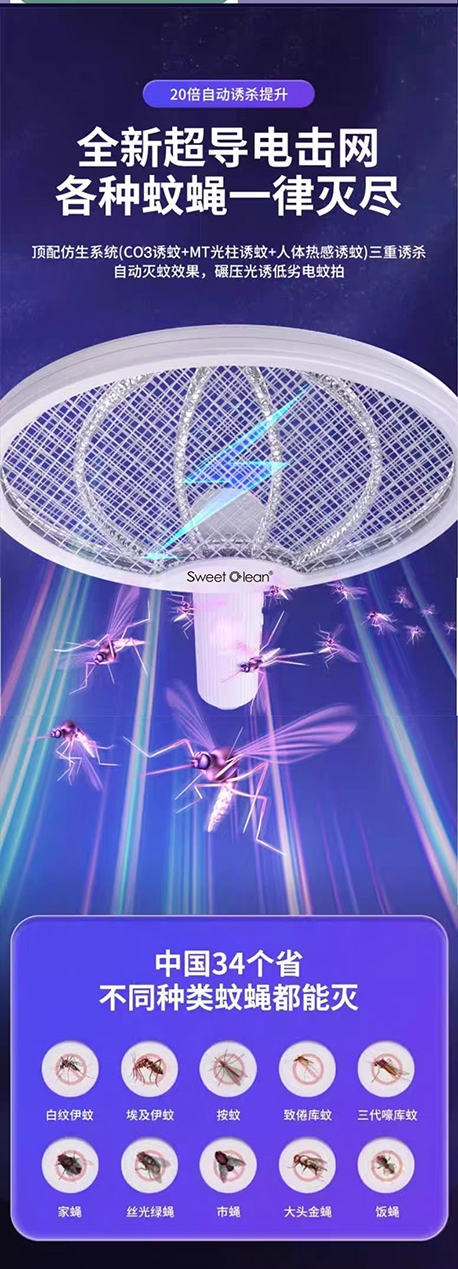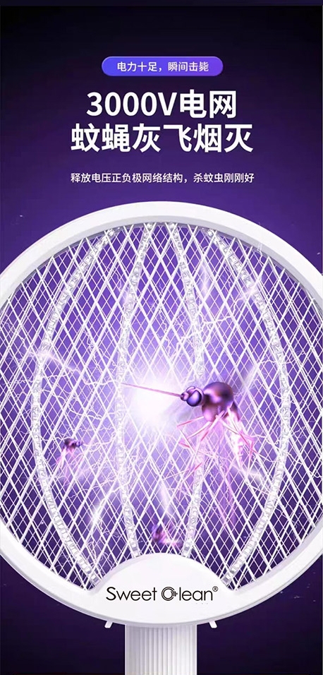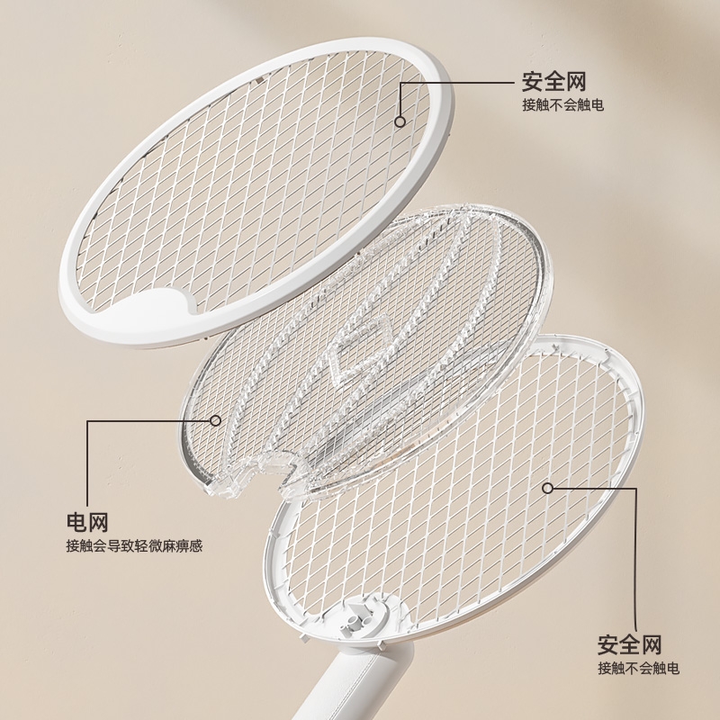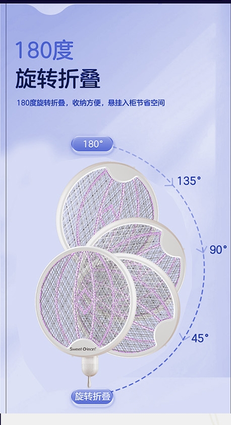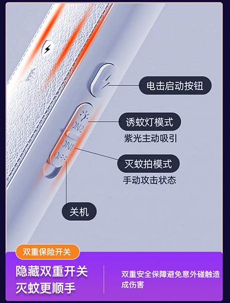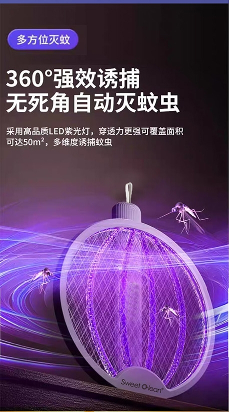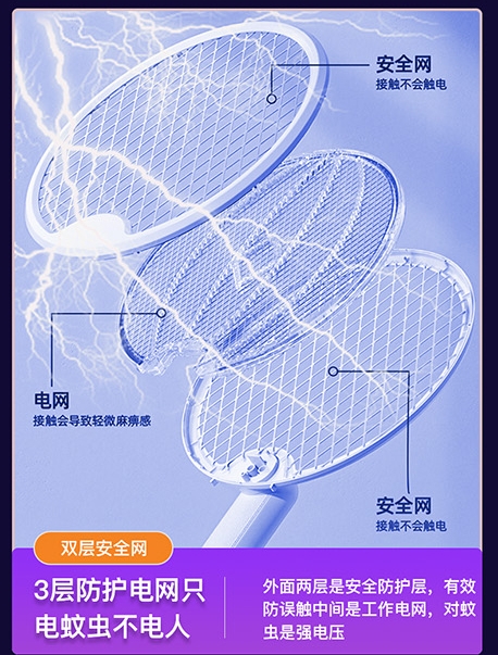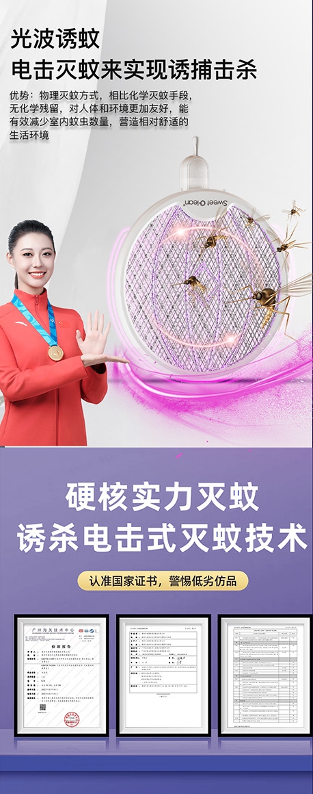 旋转折叠一拍双用多重保护;3000V高密度电网全新的塑网防护设计;365nm变频光波自动诱蚊;两种灭蚊模式即是电蚊拍也是灭蚊灯轻松转换;吸引蚊虫智能灭蚊省心省力