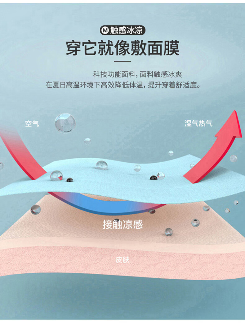 夏日凉皮、 冰感轻薄;柔软舒适、瞬间凉感透气不闷热;无痕冰丝快干