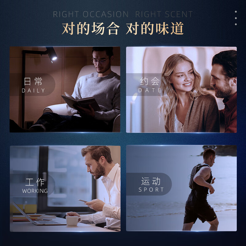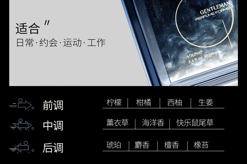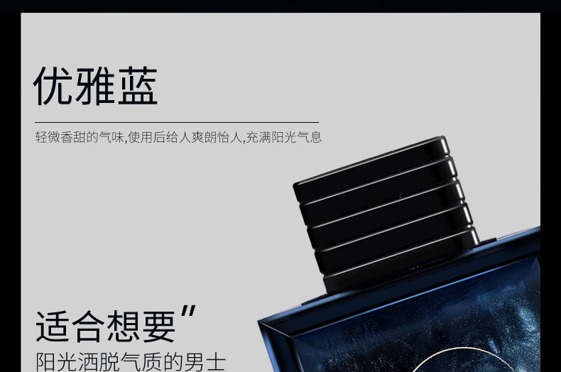 大容量实惠:100ml 的大容量设计,满足长期使用;鎏金版奢华包装:气质灰的瓶身搭配鎏金元素;多场景适用:在日常通勤时,清新的前调能提神醒脑