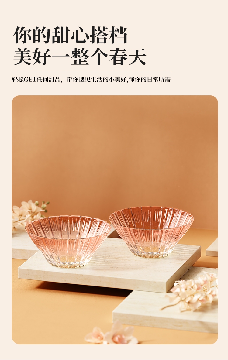 花影绽放,纹路汲取“樱花”与“花影”的灵感。;碗盘边缘呈现出宛如花瓣自然绽放的优雅波浪弧度。;采用温暖的高颜值渐变玻璃工艺,色彩从深到浅过渡自然