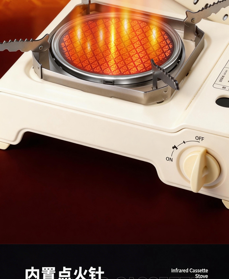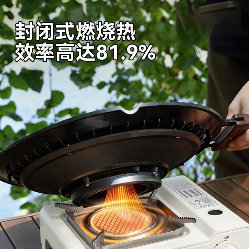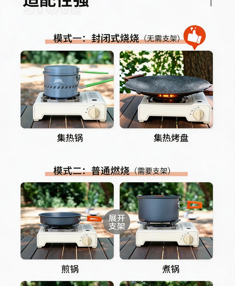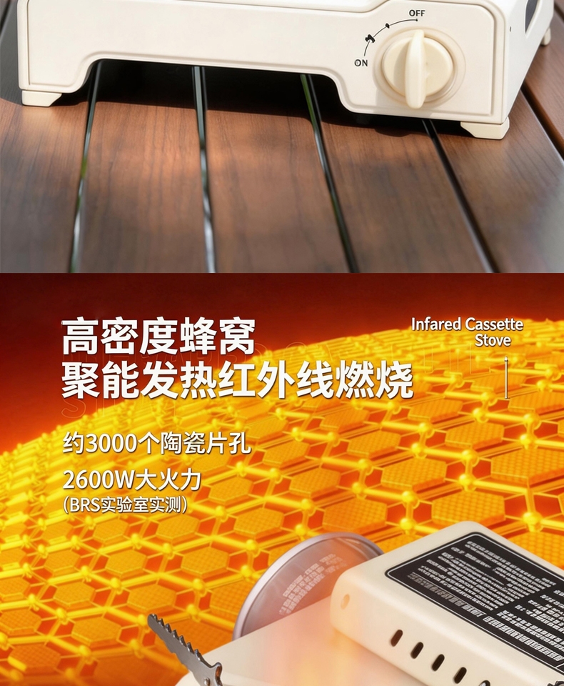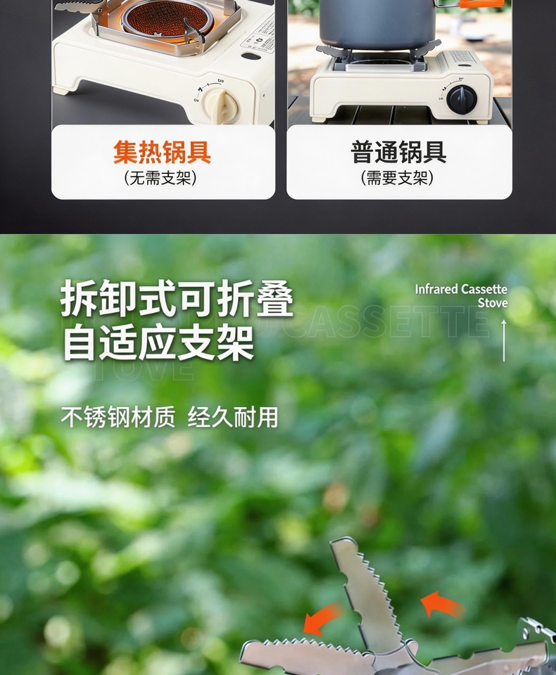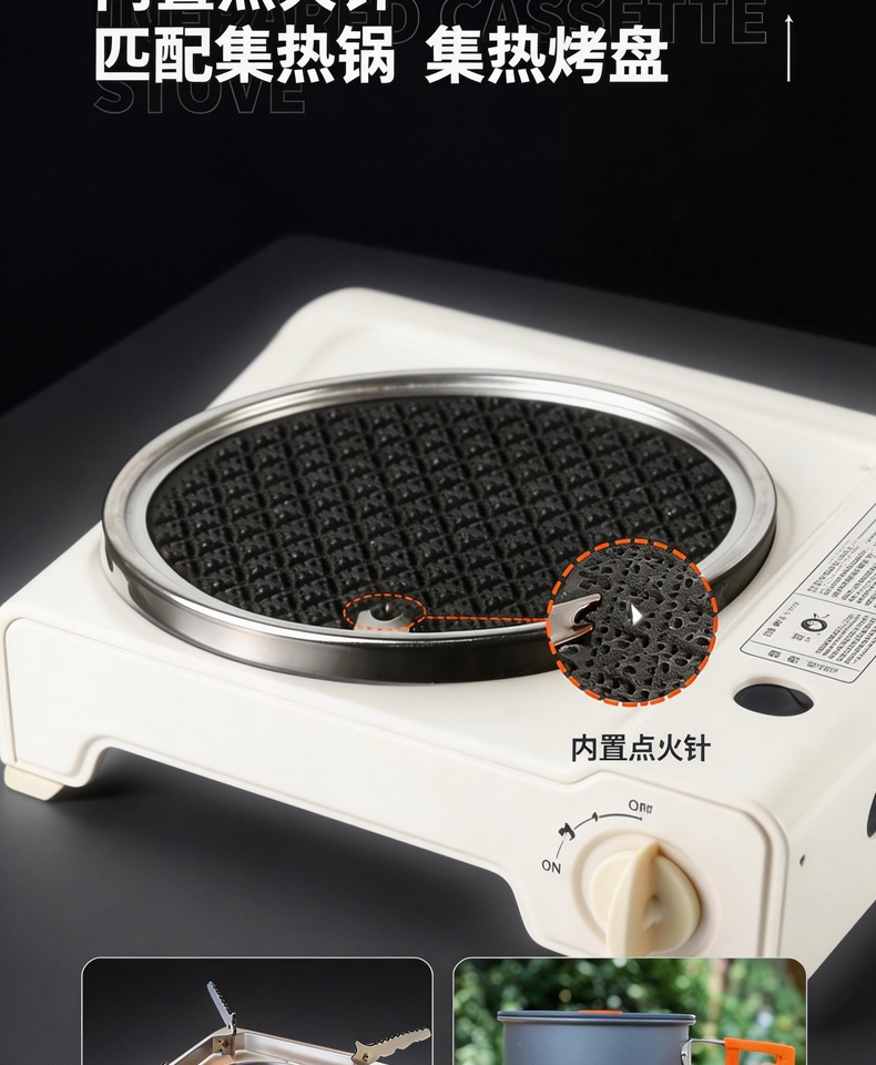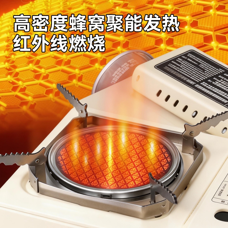拆卸式可折叠自适应支架;高密度蜂窝聚能发热红外线燃烧;内置点火针 匹配集热锅 集热烤盘