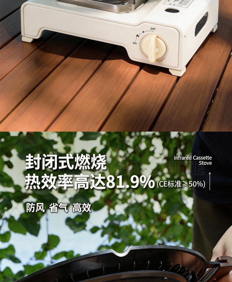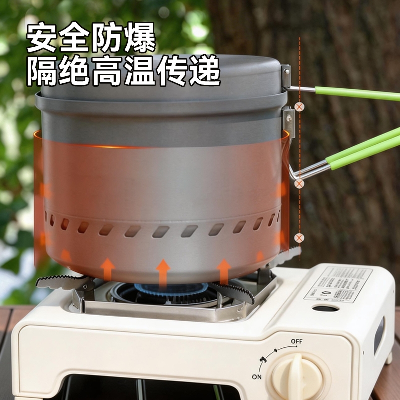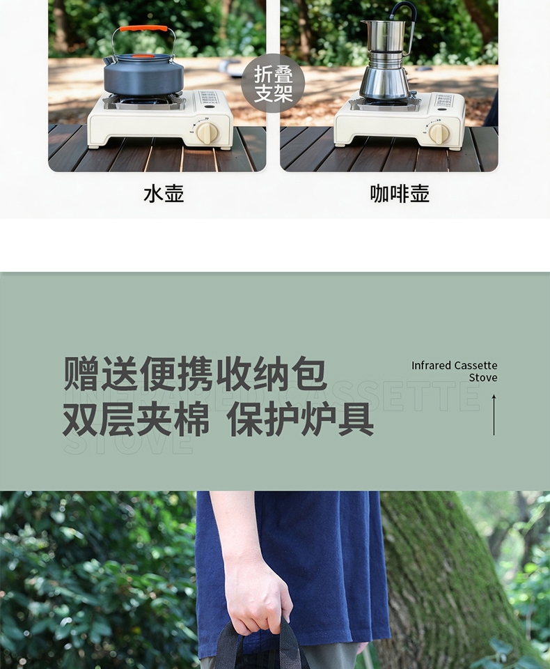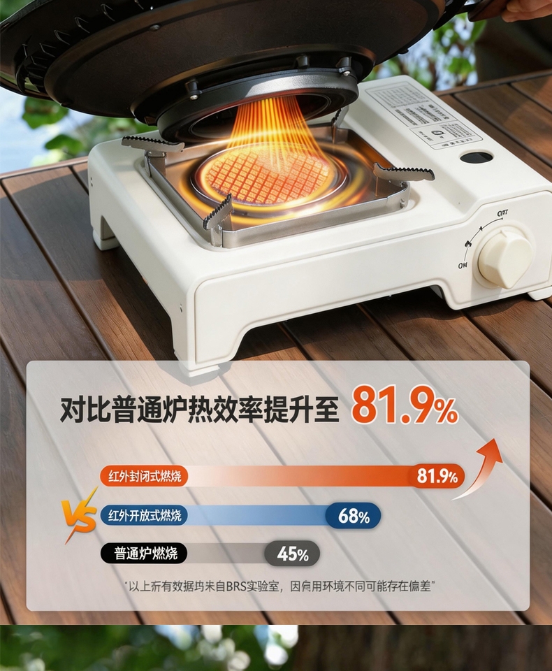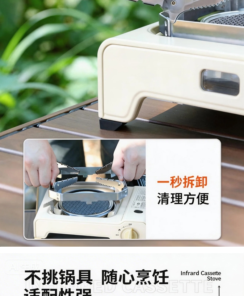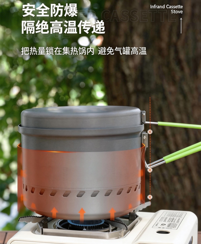 拆卸式可折叠自适应支架;高密度蜂窝聚能发热红外线燃烧;内置点火针 匹配集热锅 集热烤盘