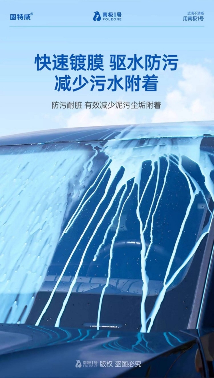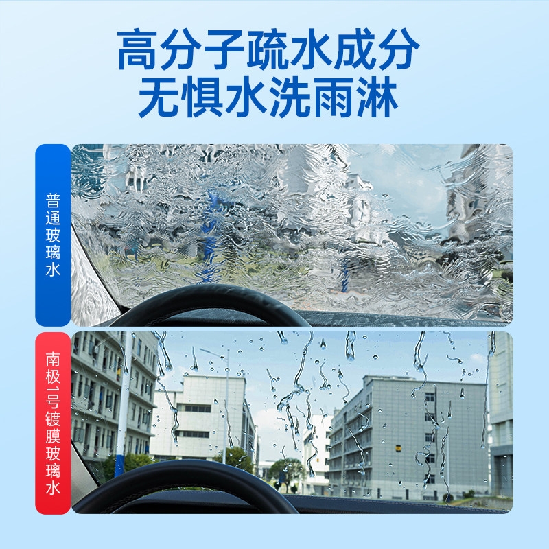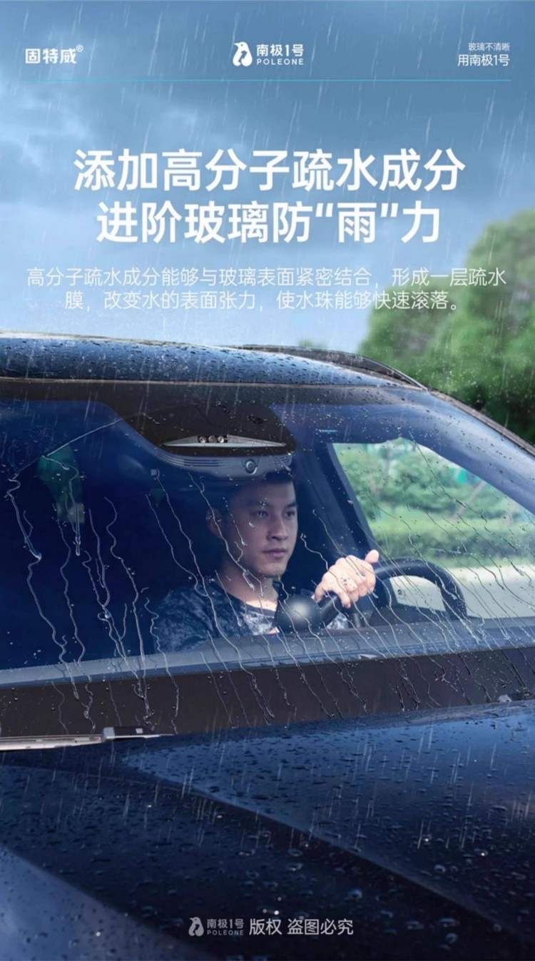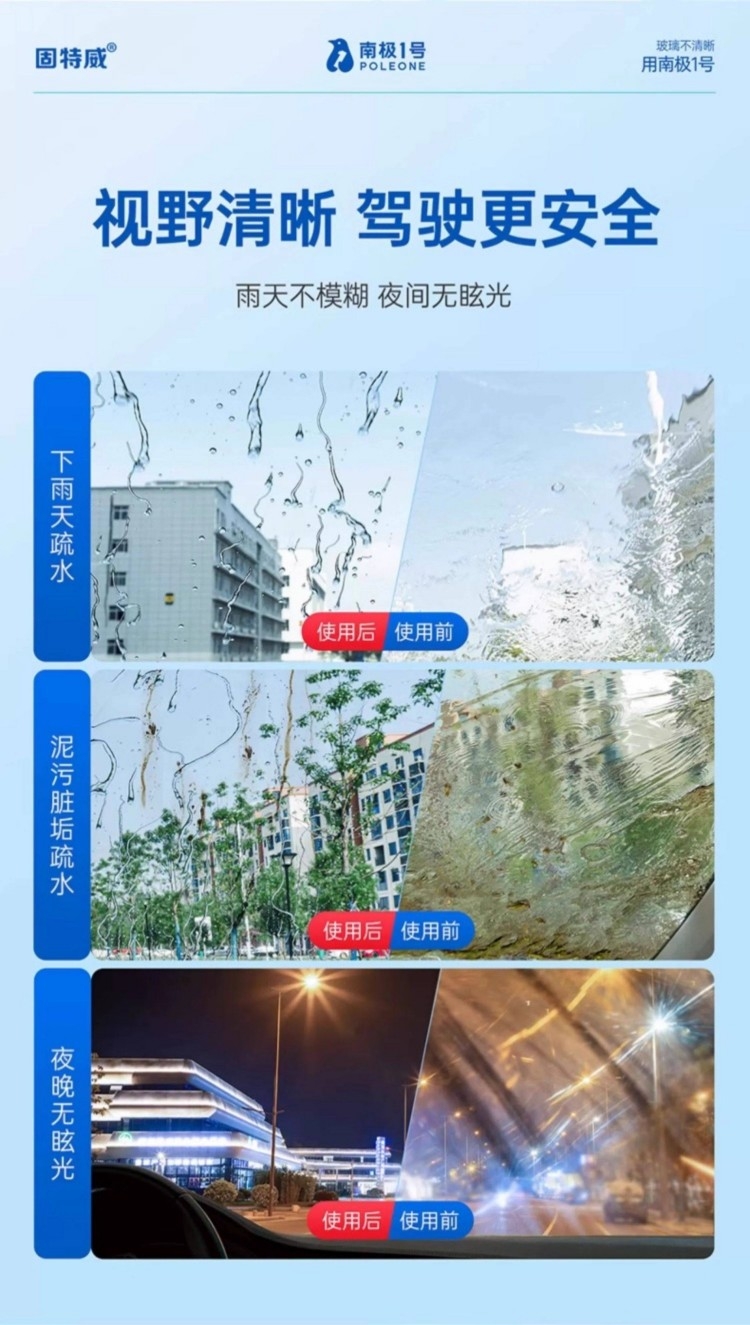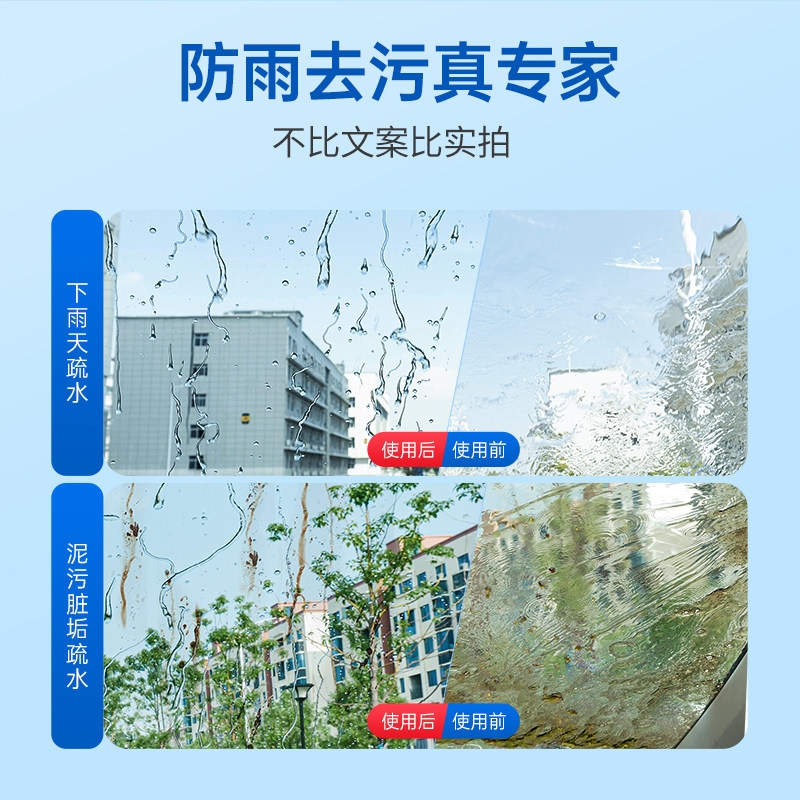 添加高分子疏水成分,进阶玻璃防“雨”力;快速镀膜 驱水防污 减少污水附着;一刮即净 不留水痕