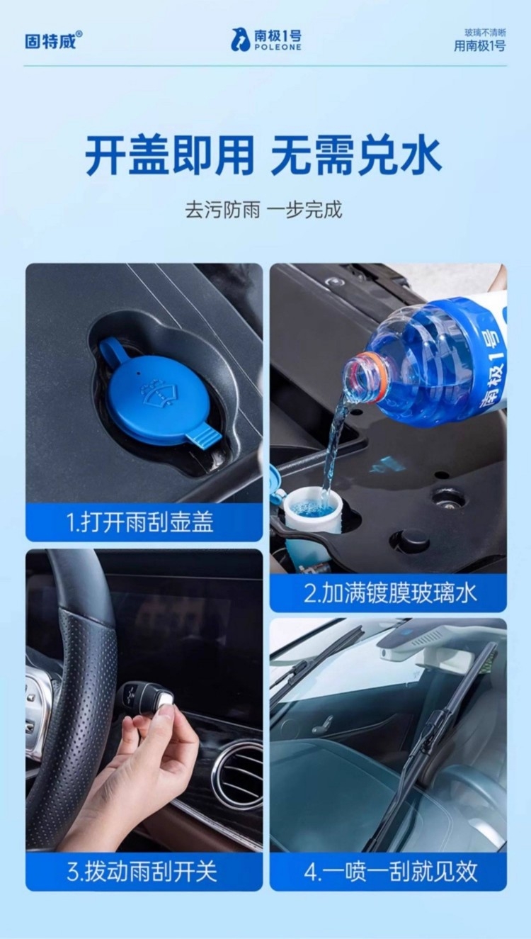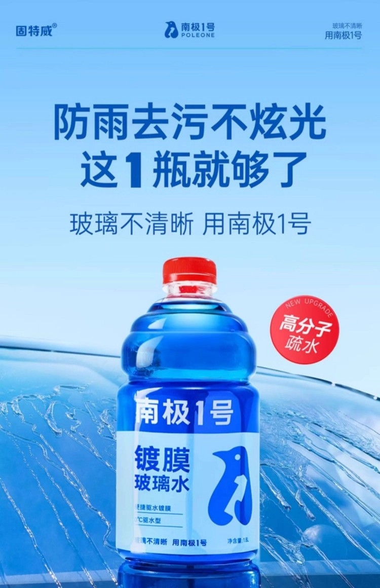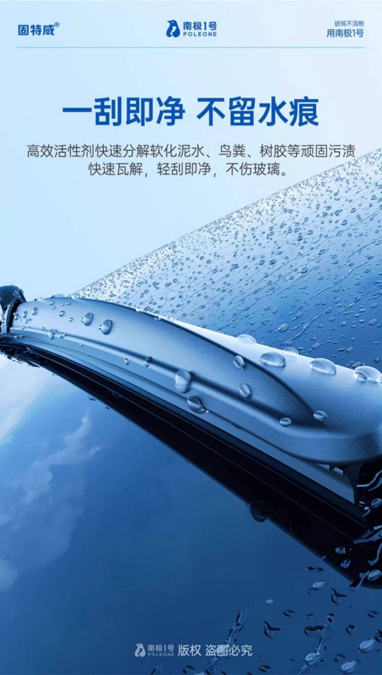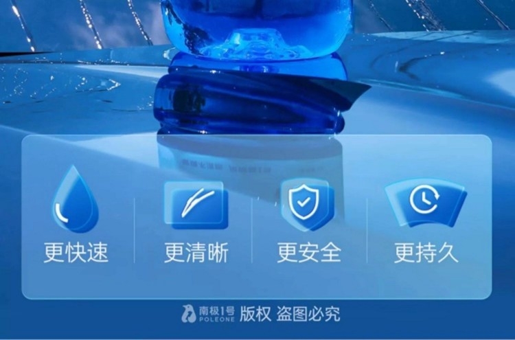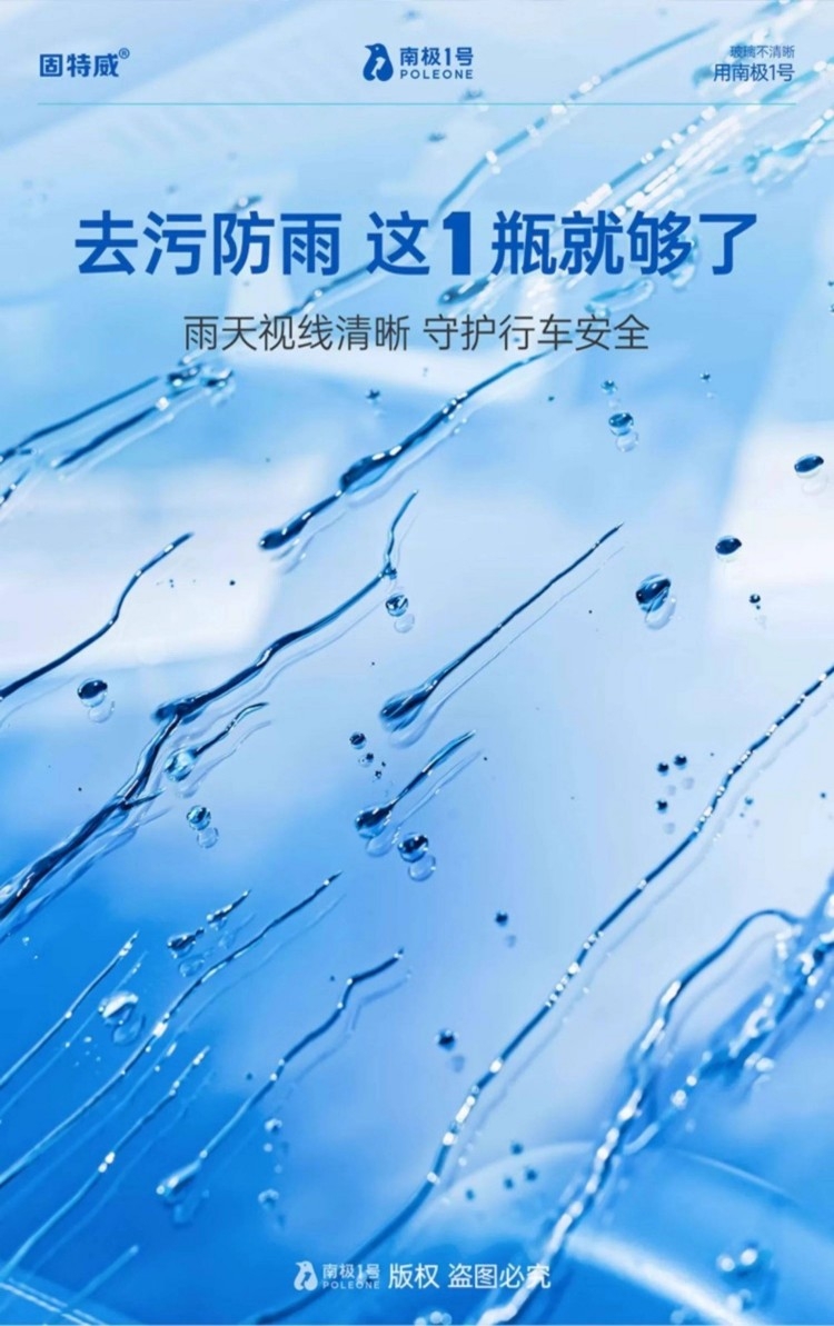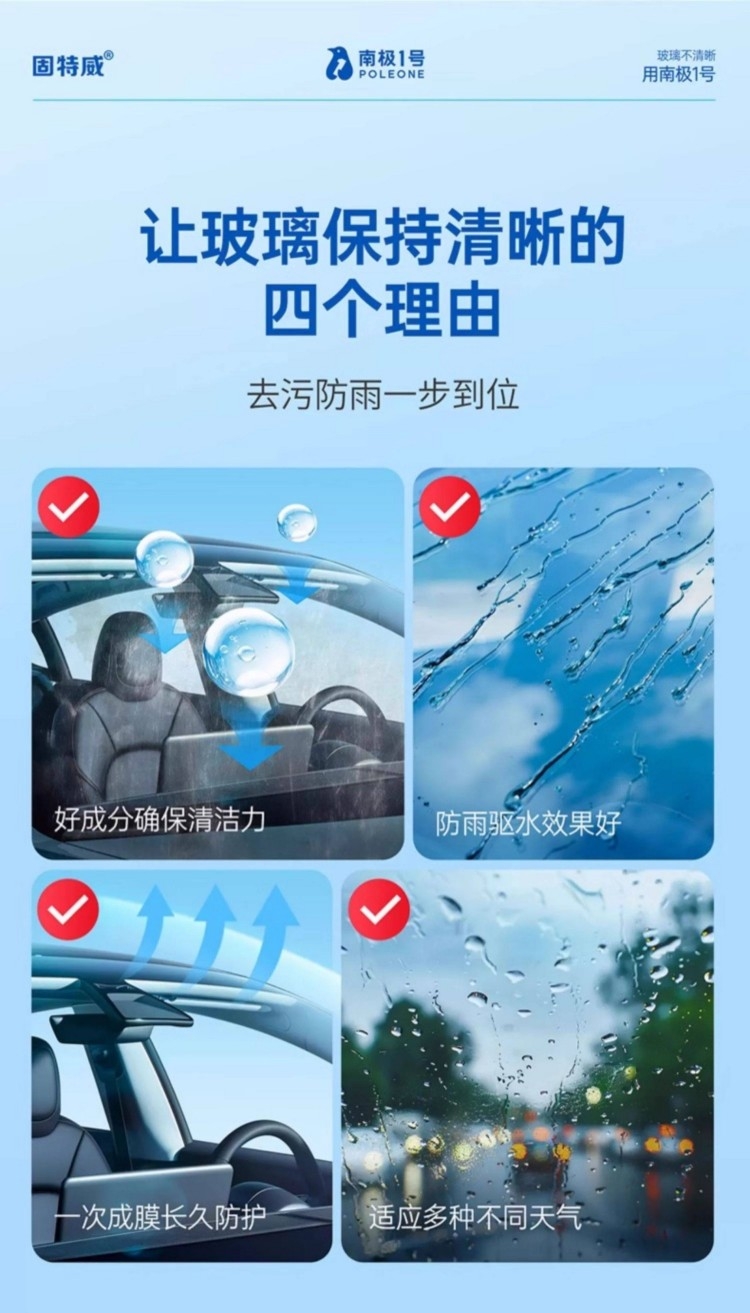添加高分子疏水成分,进阶玻璃防“雨”力;快速镀膜 驱水防污 减少污水附着;一刮即净 不留水痕