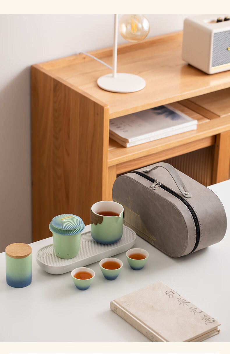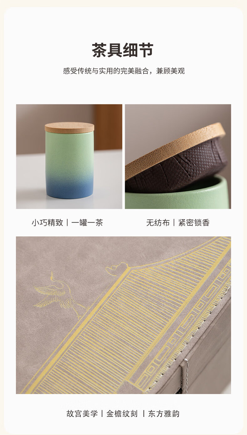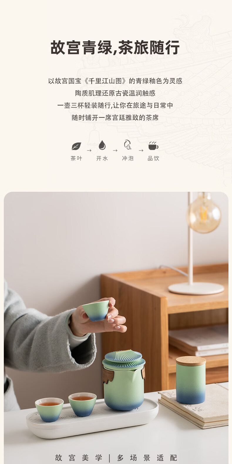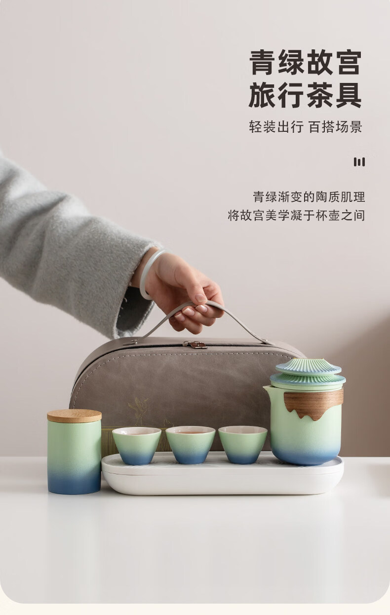 青绿渐变的陶质肌理,将故宫美学凝于杯壶之间。;方便携带;随时铺开一席宫廷雅致的茶席