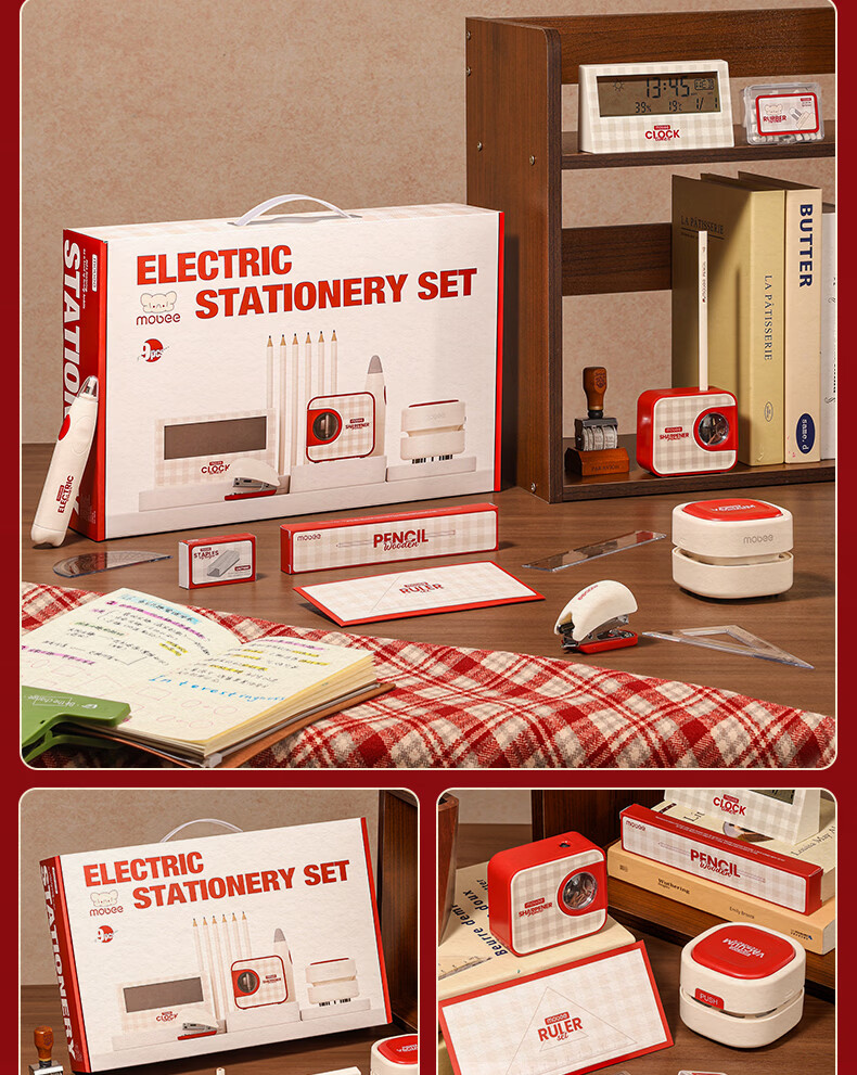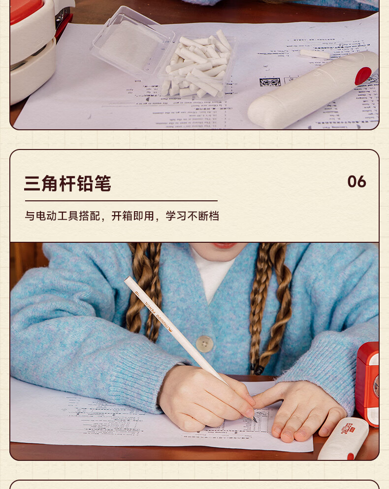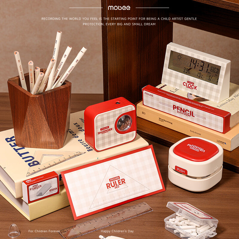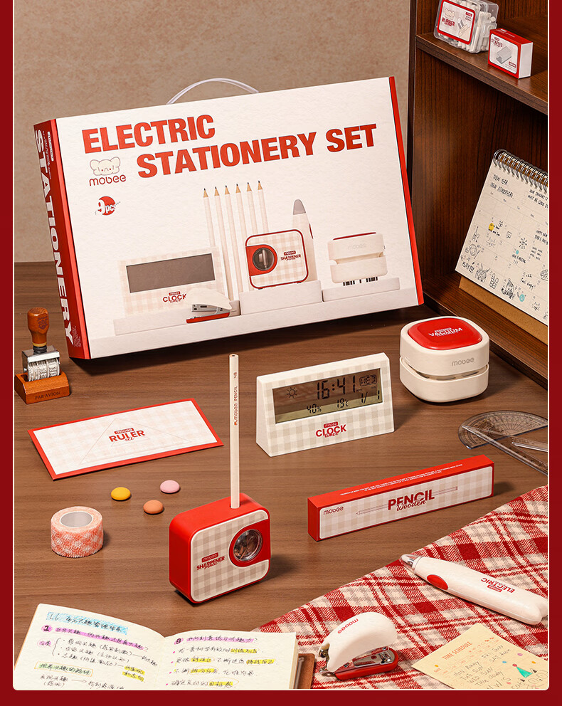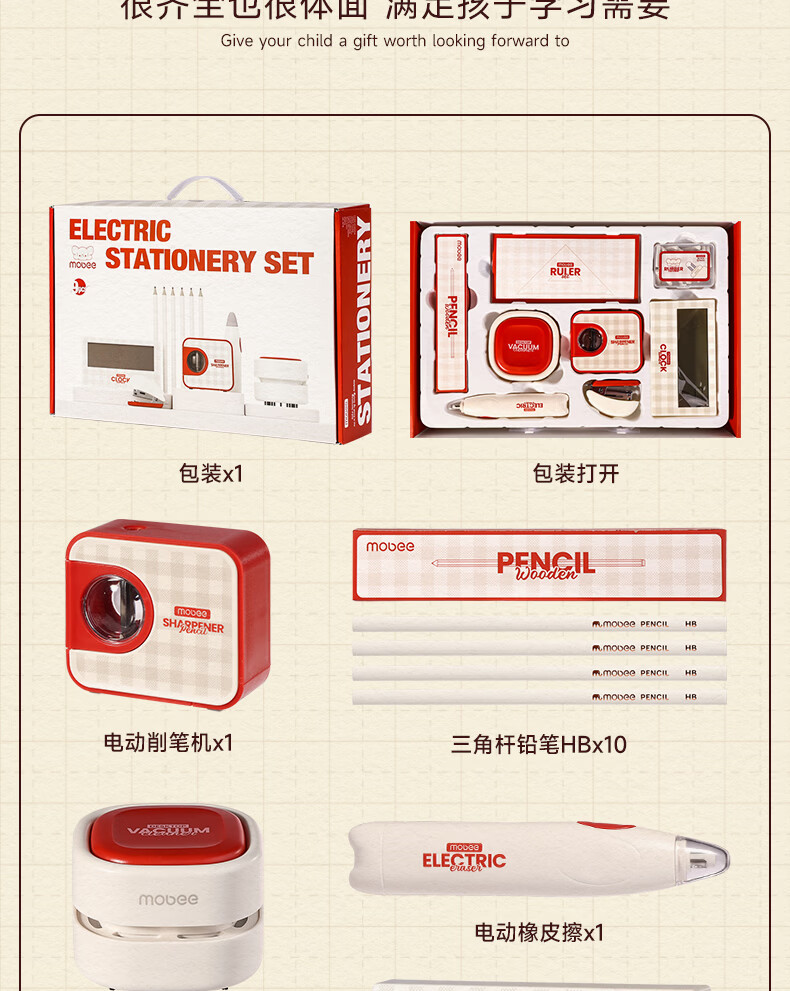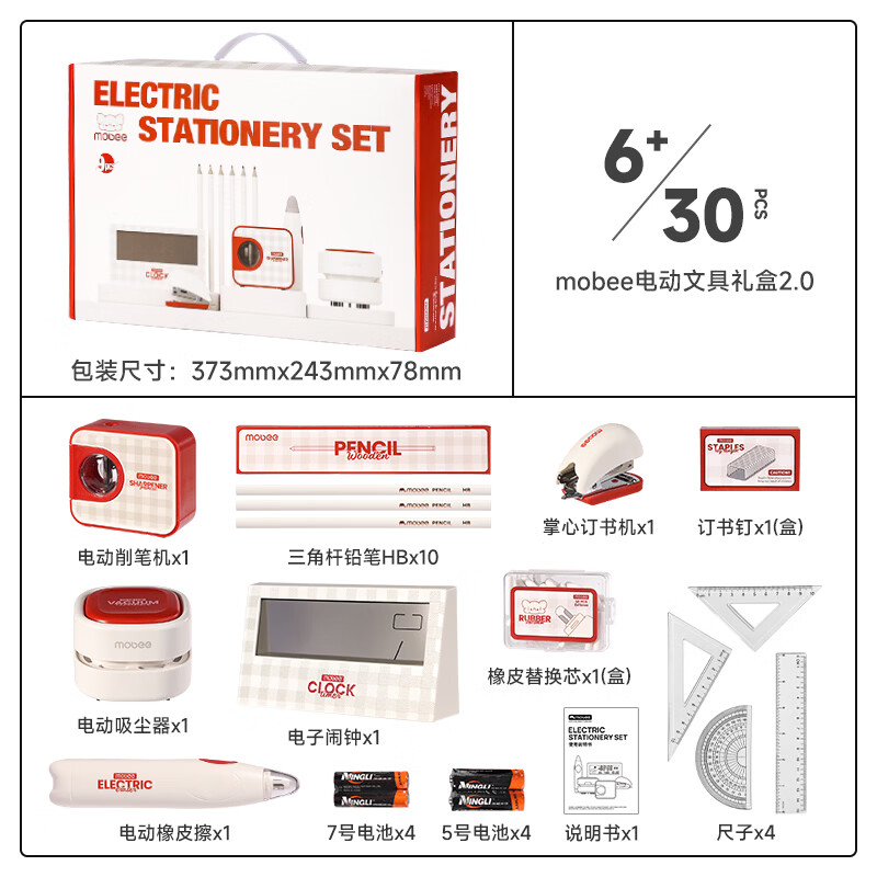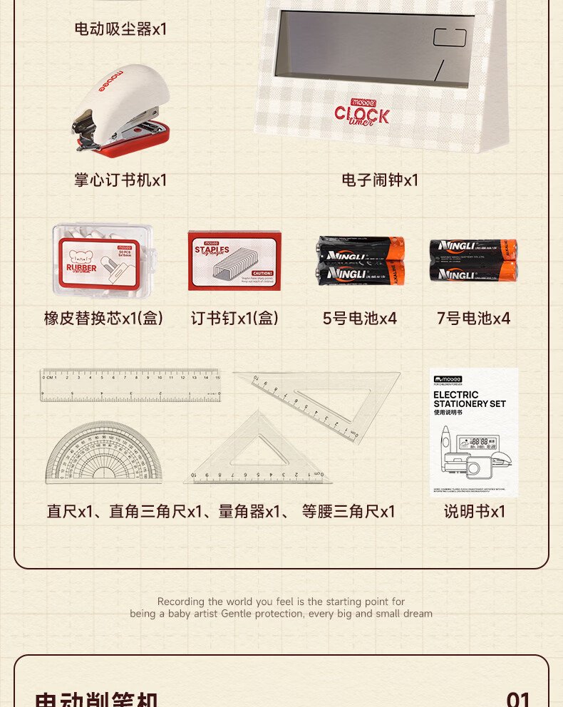 配件 :电动削笔机*1、电动吸尘器*1、电动橡皮擦*1、电子闹钟*1、掌心订书机*1、三角杆铅笔*10、尺子*4、橡皮替芯*1盒、订书钉*1盒、7号电池*4、5号电池*4、说明书*1