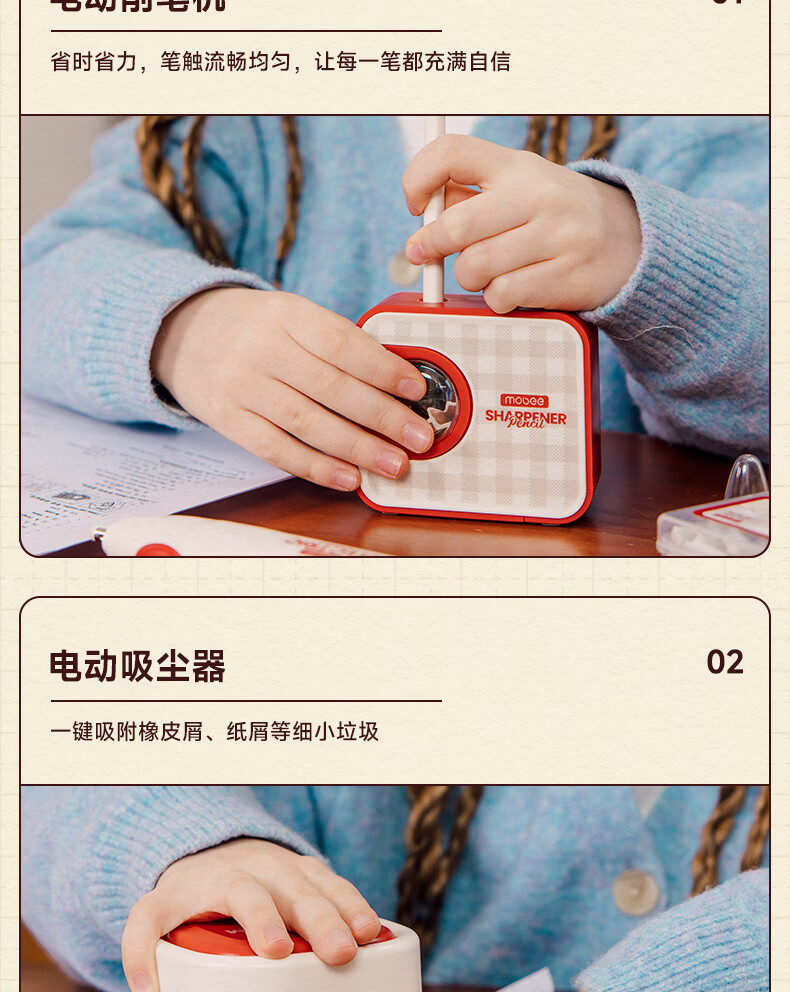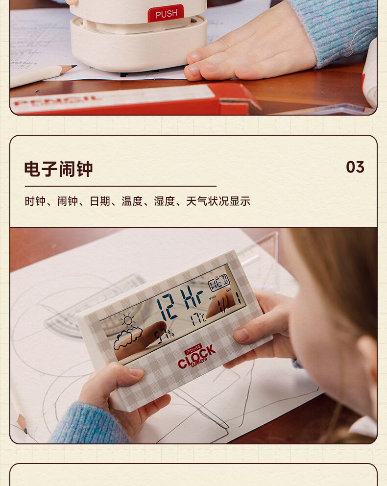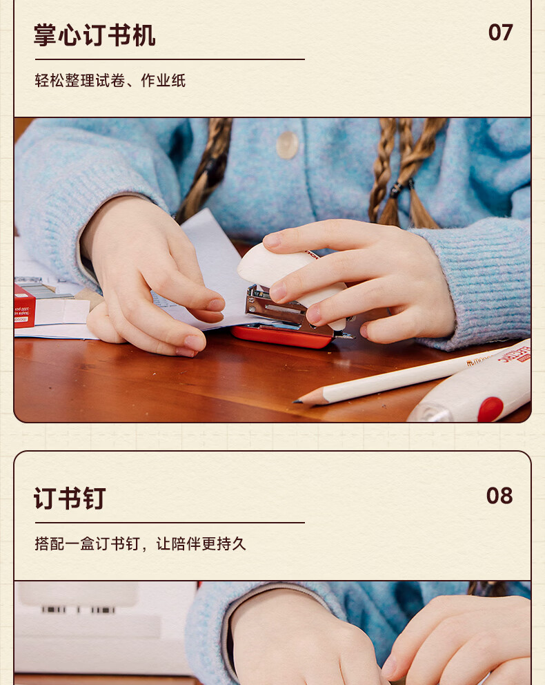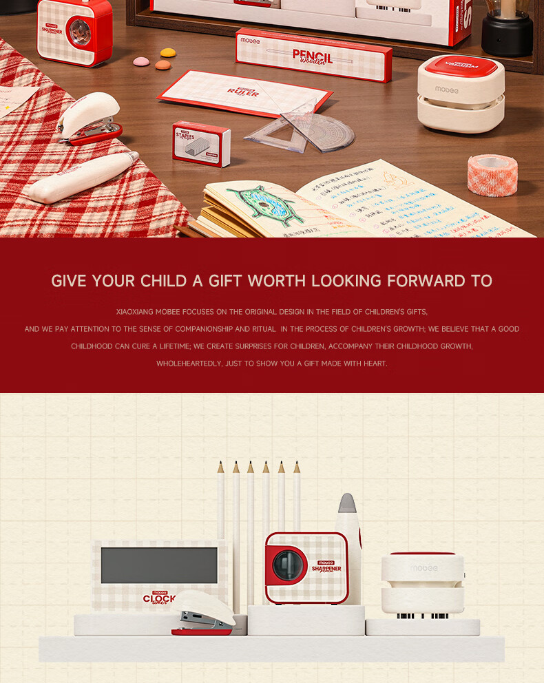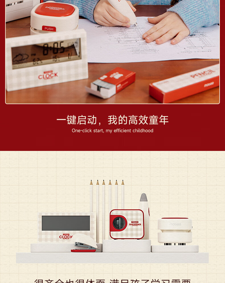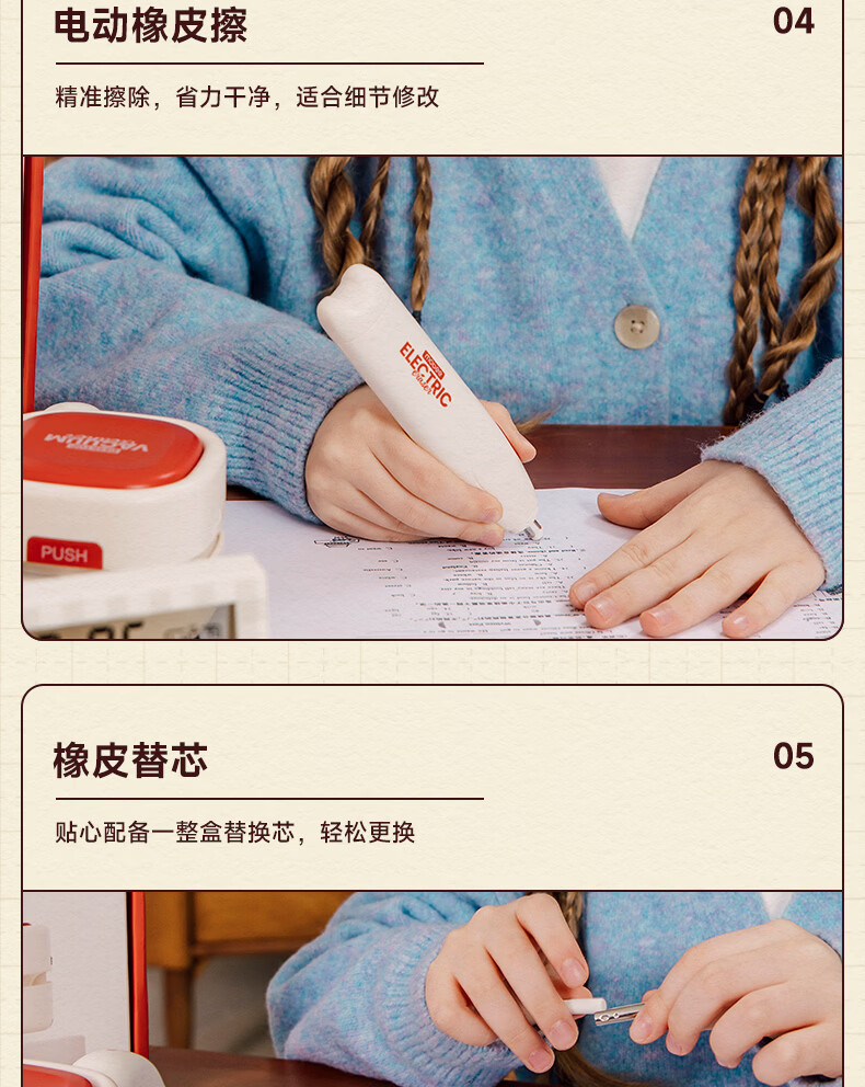 配件 :电动削笔机*1、电动吸尘器*1、电动橡皮擦*1、电子闹钟*1、掌心订书机*1、三角杆铅笔*10、尺子*4、橡皮替芯*1盒、订书钉*1盒、7号电池*4、5号电池*4、说明书*1