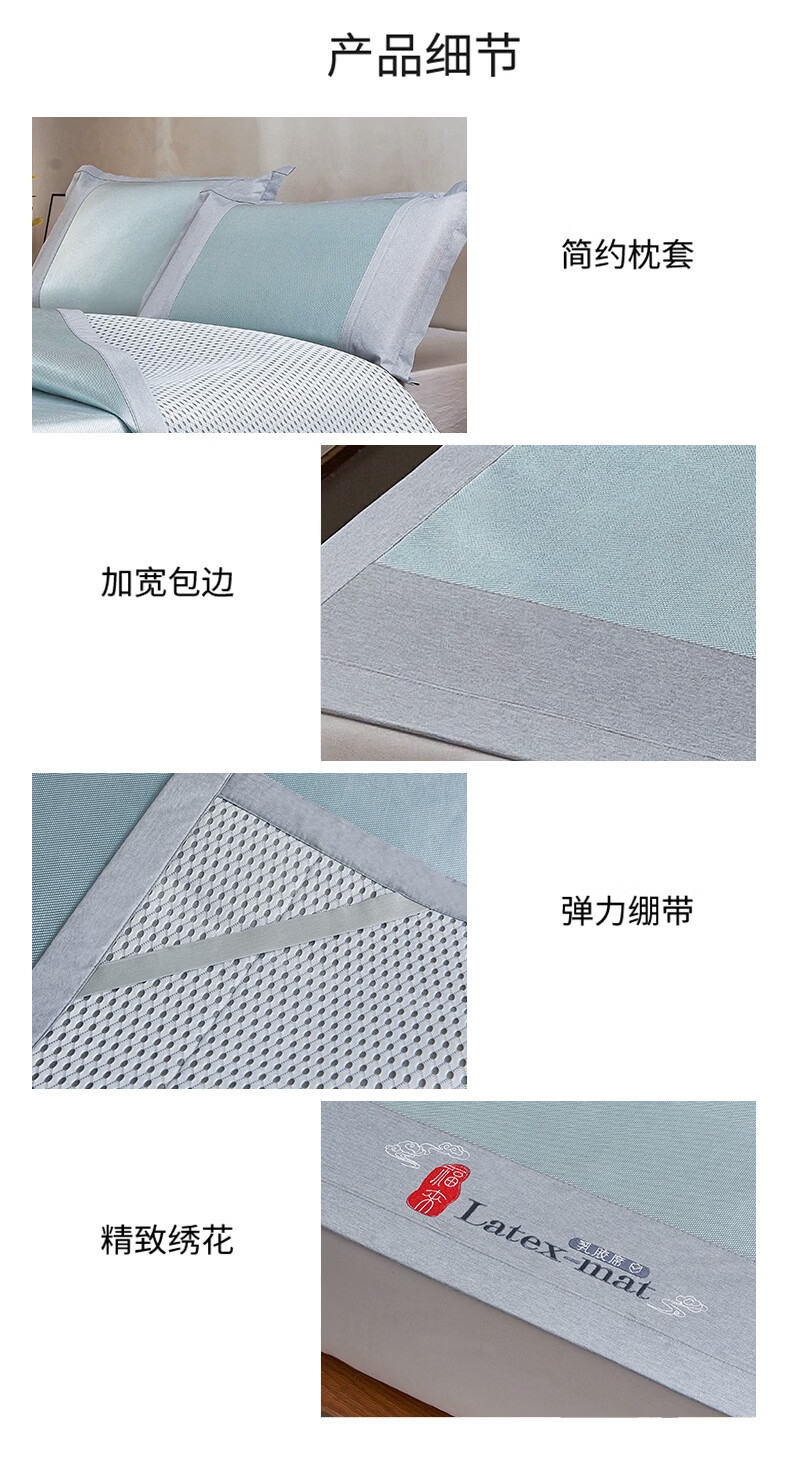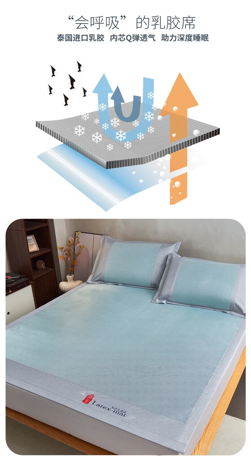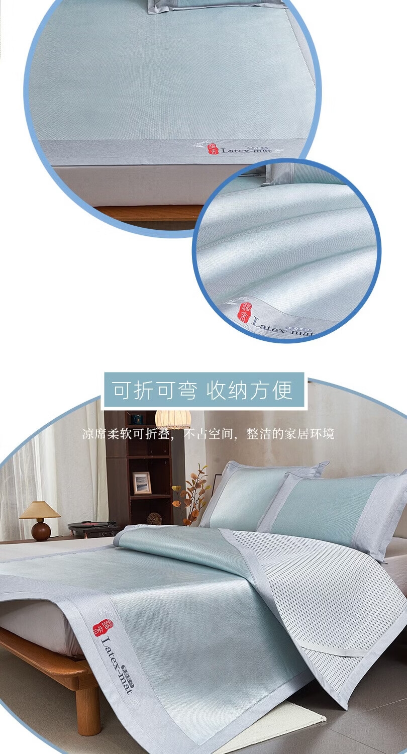 包边厚实耐用,四周强力绑带固定牢靠;轻松折叠,易于收纳;席面凉而不冰,适于在空调房中使用;整张乳胶填充,Q弹细腻柔软,持久耐用不易变形