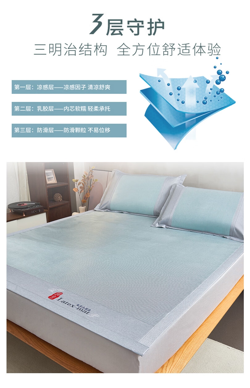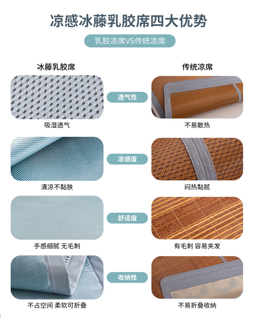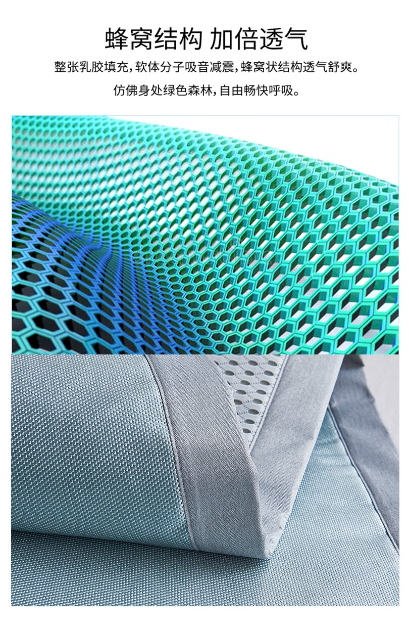 包边厚实耐用,四周强力绑带固定牢靠;轻松折叠,易于收纳;席面凉而不冰,适于在空调房中使用;整张乳胶填充,Q弹细腻柔软,持久耐用不易变形