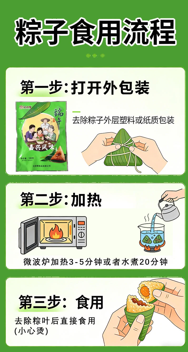 内馅丰富,粒粒饱满;高山箬叶,清香扑鼻;一蛋入馔·山海皆鲜 一级冷榨,天然营养