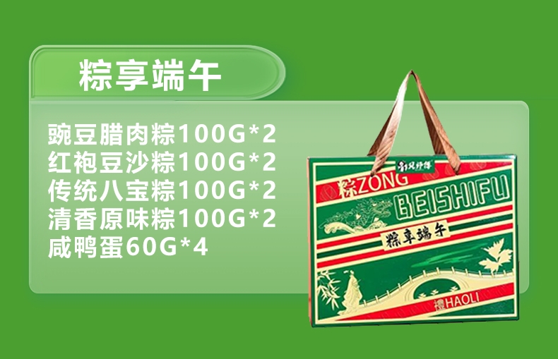 配置:豌豆腊肉粽100g*2 红袍豆沙粽100g*2 传统八宝粽100g*2 清香原味粽100g*2 高邮咸鸭蛋60g*4