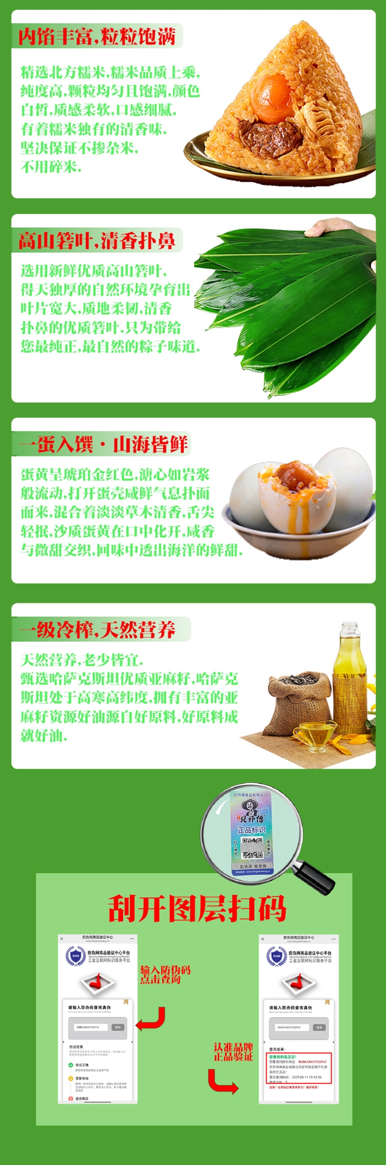 内馅丰富,粒粒饱满 ;高山箬叶,清香扑鼻;一蛋入馔·山海皆鲜 一级冷榨,天然营养