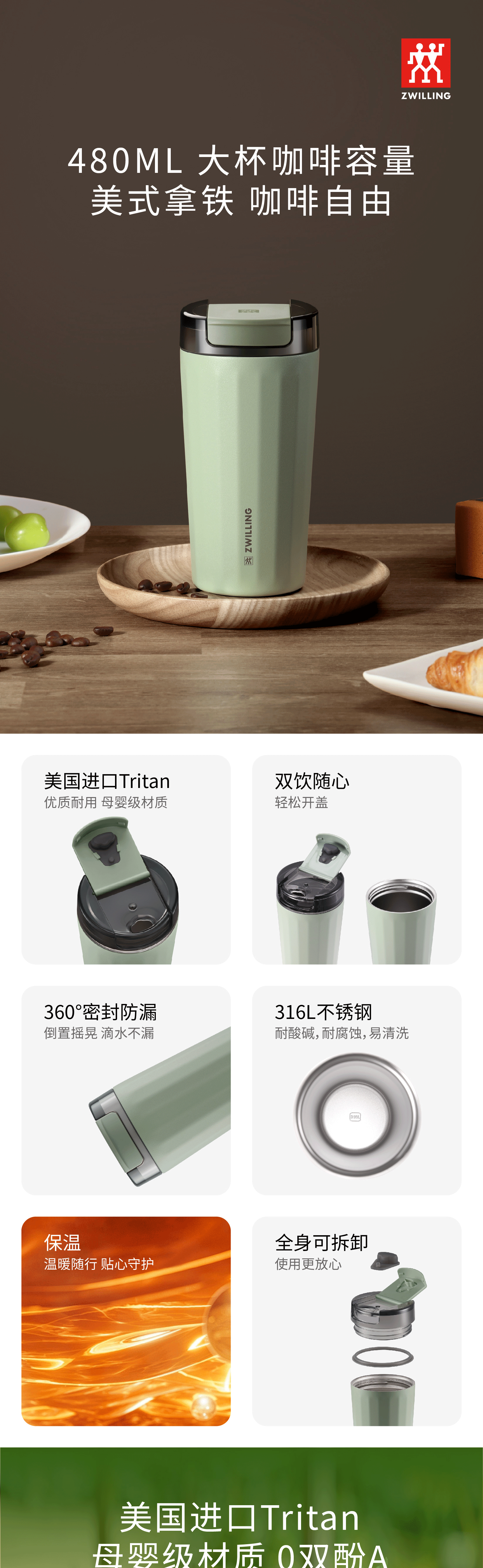 开票名称:金属制品*双立人真空保温咖啡杯薄荷绿480ml