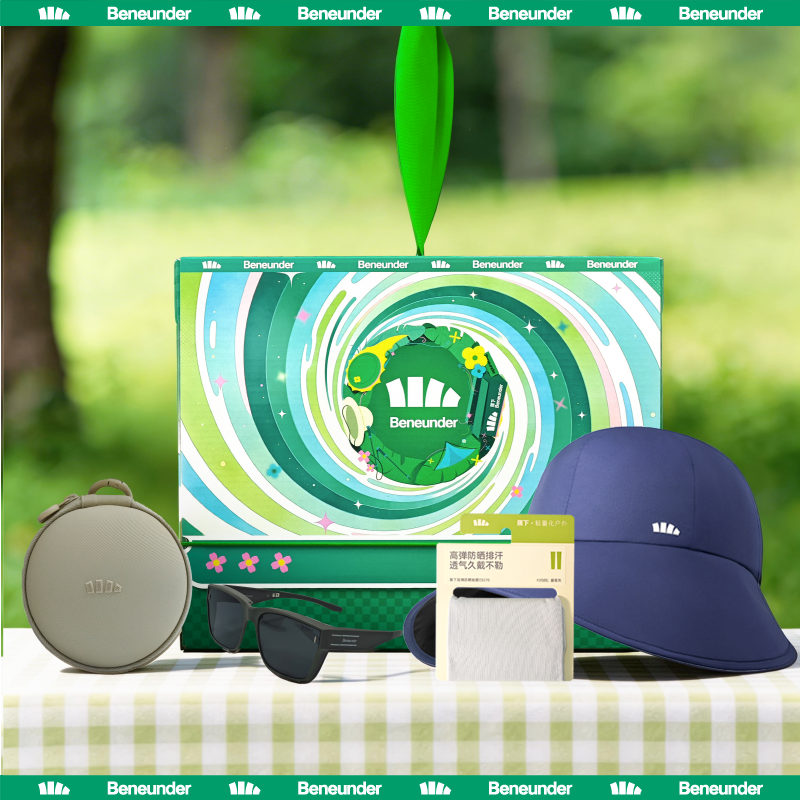 礼盒配置:飞机礼盒*1、蕉下方形中框折叠近视套镜(高桩头)FD498*1 蕉下侧脸防晒鸭舌帽*1 、 蕉下冰袖*1