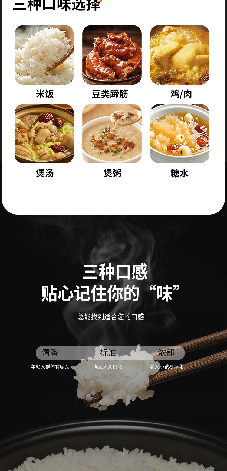 6大功能菜单,操作简单易上手;立体循环加热,热量更均匀;加厚内胆,煮饭煲汤更美味;可开盖烹饪,大火收汁更入味;一键排气,排气安全方便