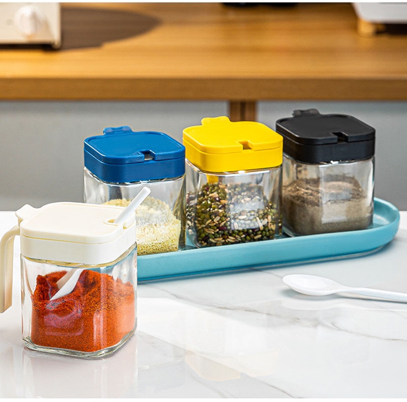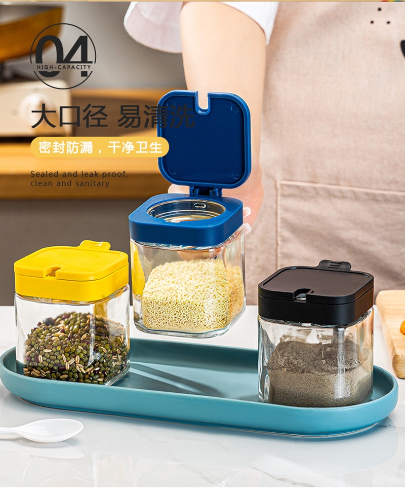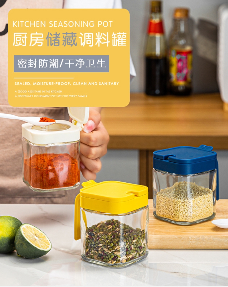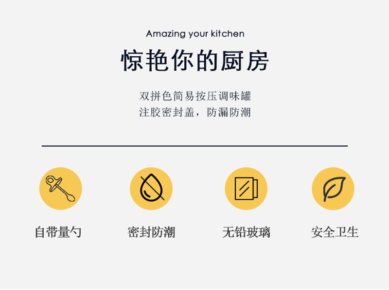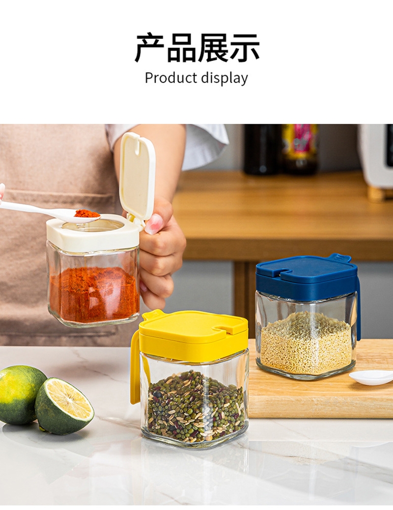 厨房储藏调料罐,密封防潮,干净卫生。;健康无铅钠钙玻璃,大口径手柄按压,防滑设计。;轻松盛放各种调味料,台面收纳更整洁。