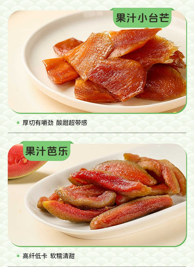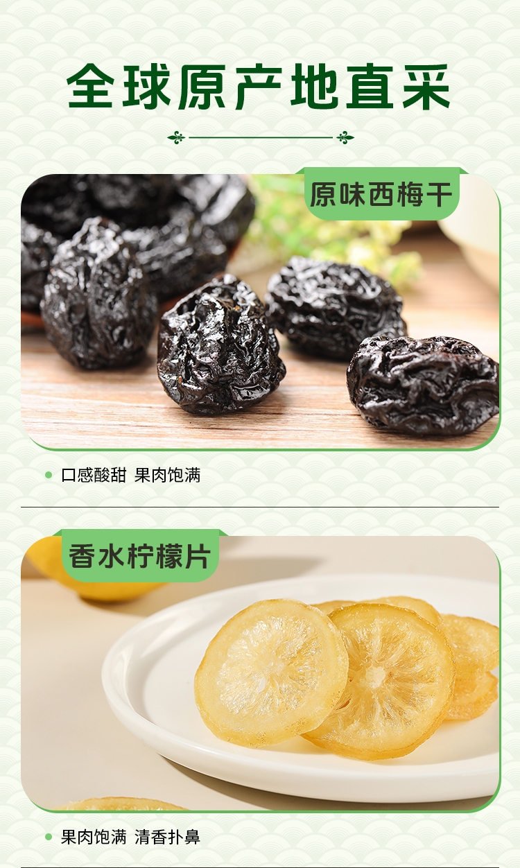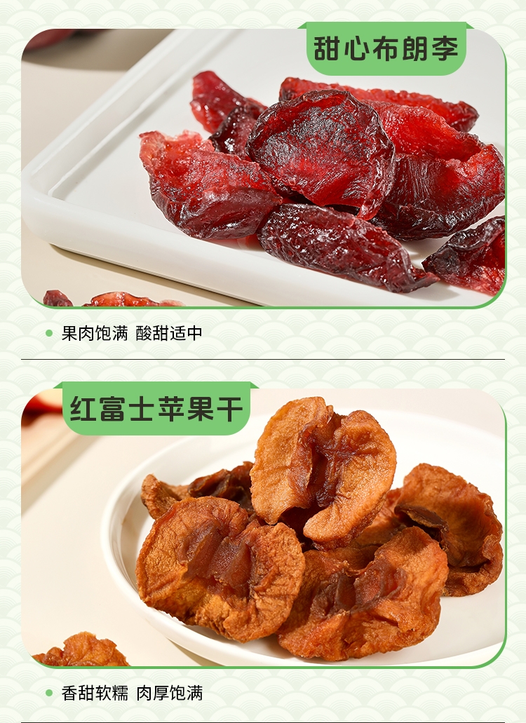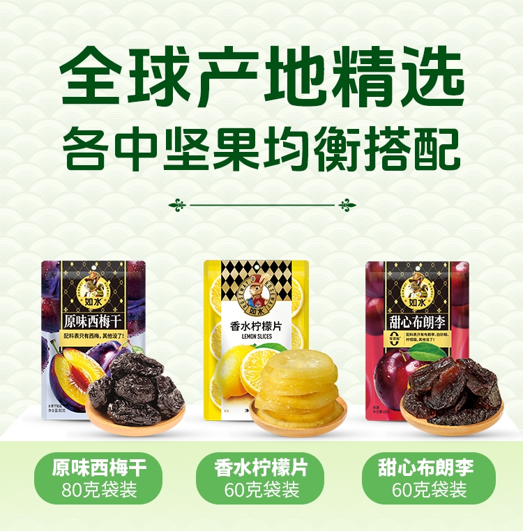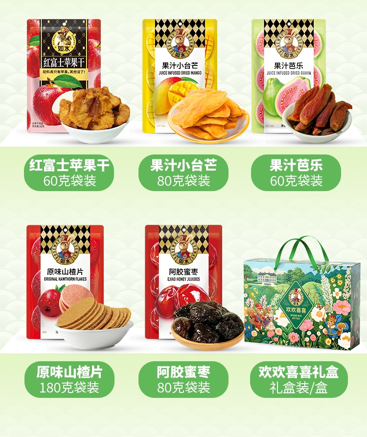 内容物:如水原味西梅干80g 如水香水柠檬片60g 如水甜心布朗李60g 如水红富士苹果干60g 如水果汁小台芒80g 如水果汁芭乐60g 如水原味山楂片180g 如水阿胶蜜枣80g