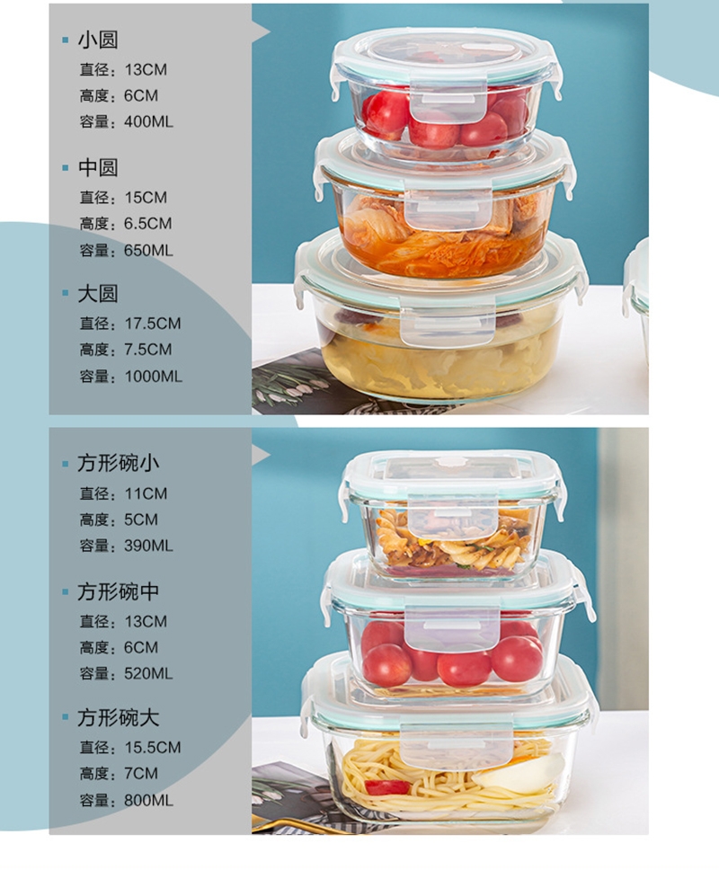 高硼硅玻璃400度冷热皆宜,冰箱保鲜,微波加热;一体卡扣 硅胶排气阀,排气孔更方便开合。;高硼硅玻璃,耐高温,食品存放更安心。