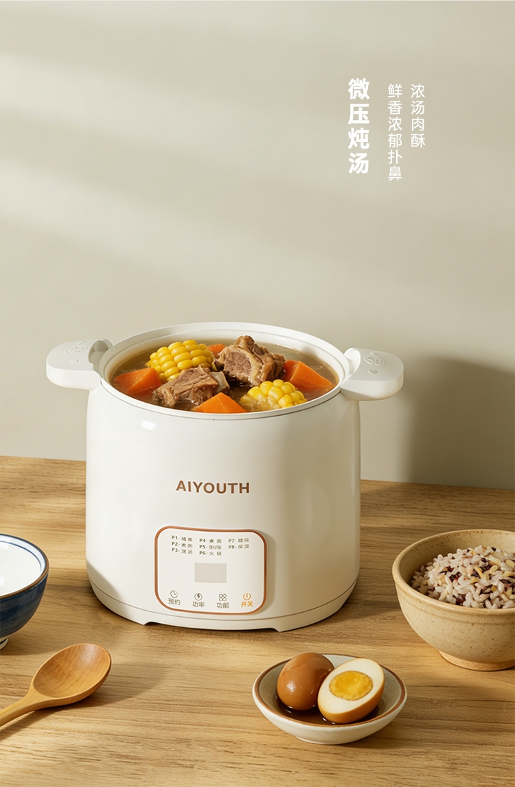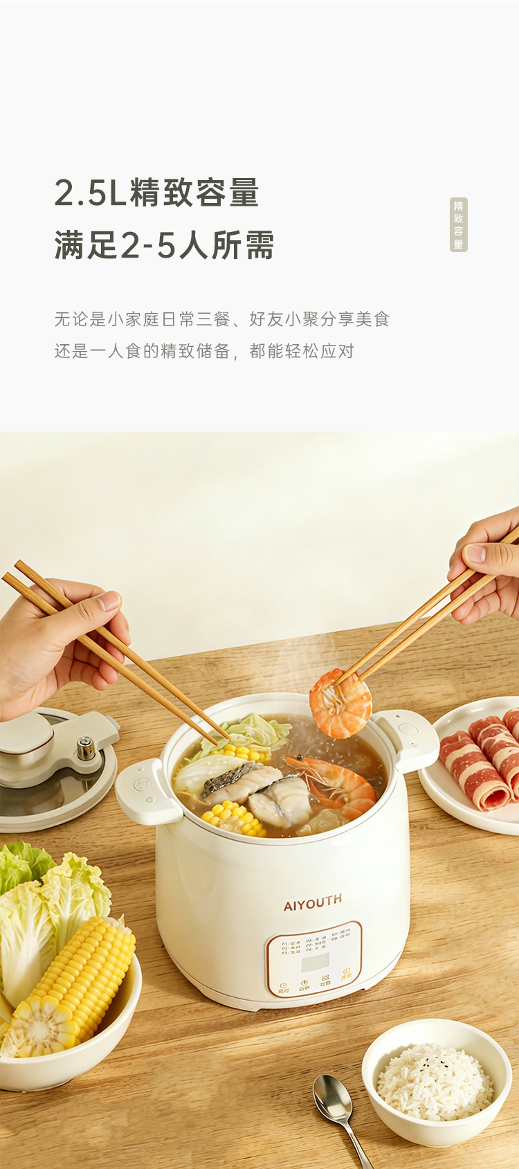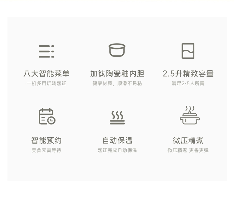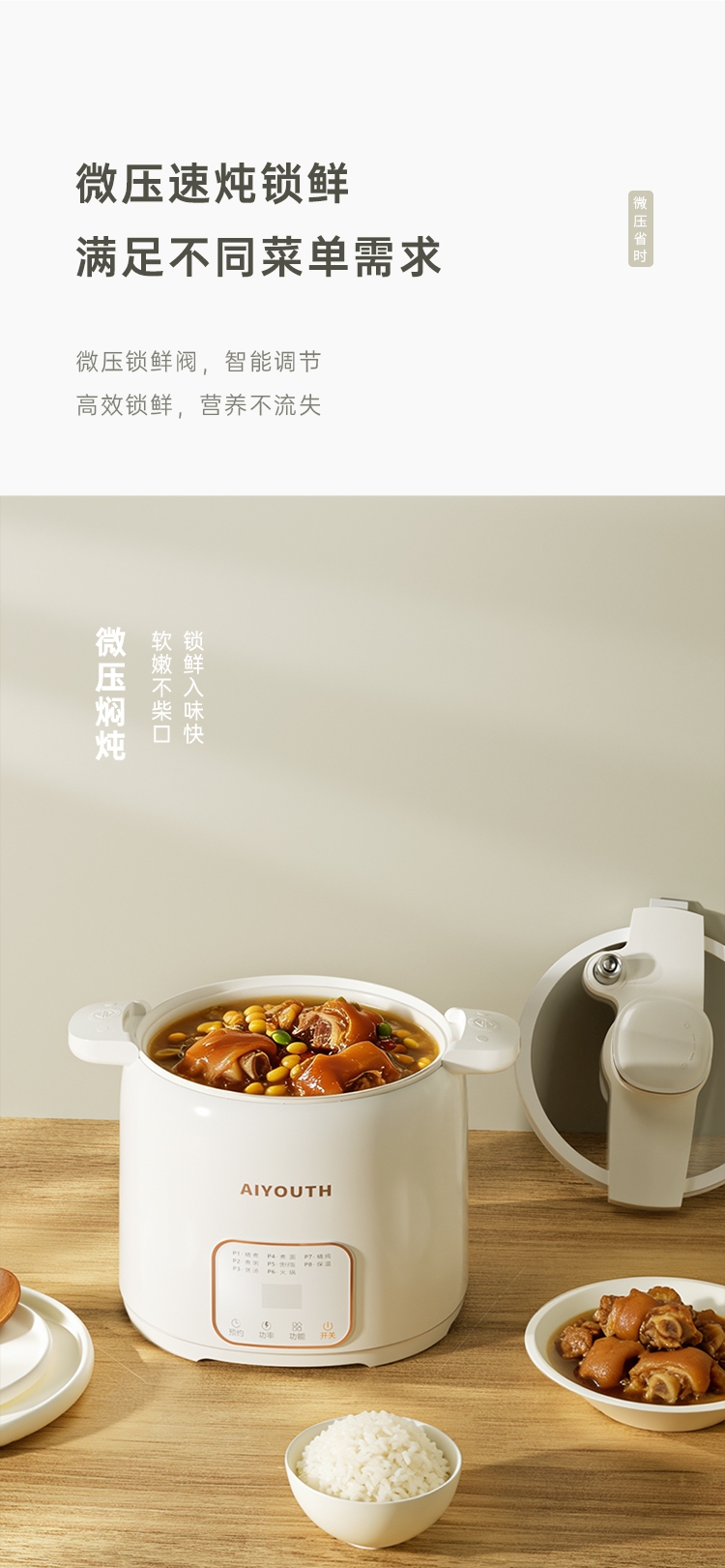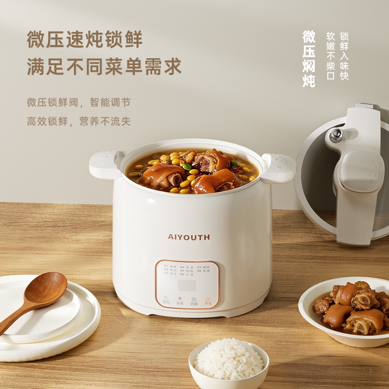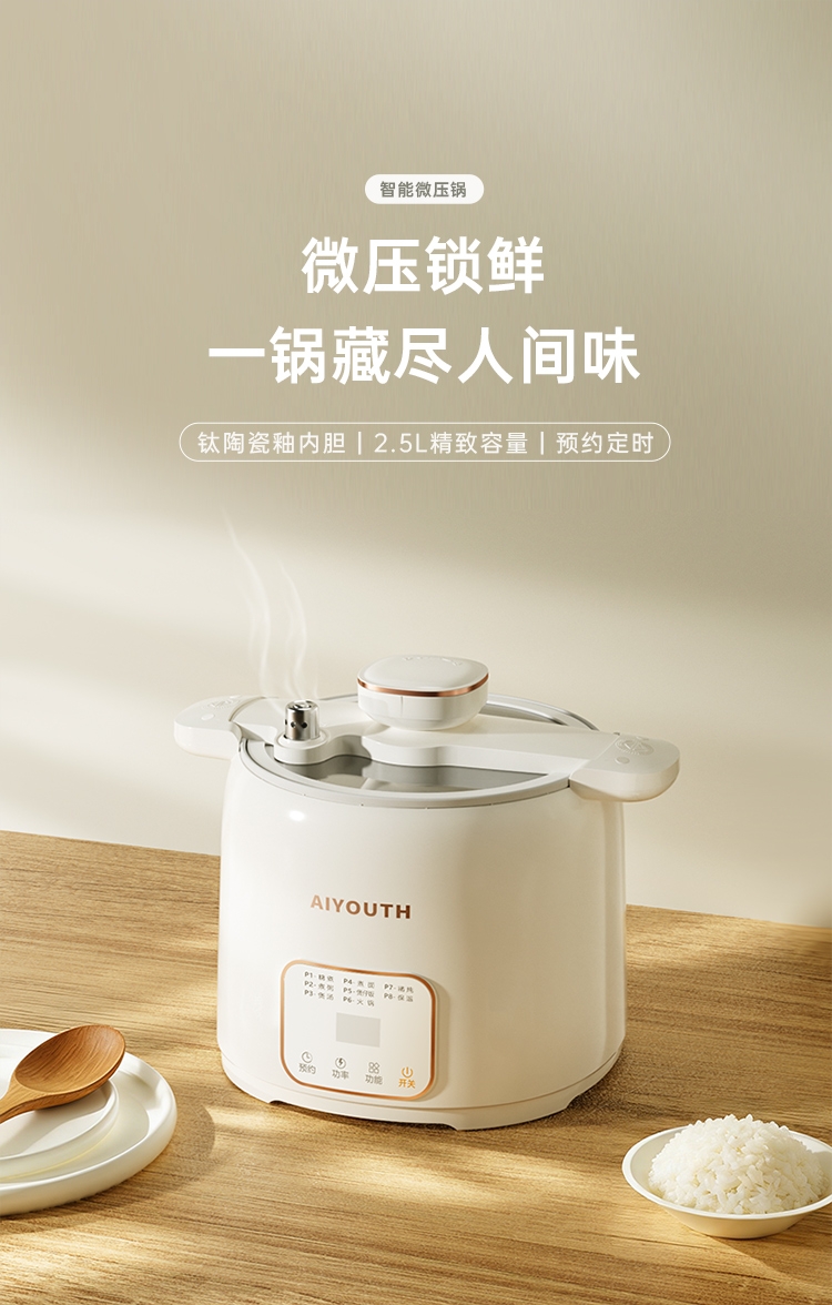 七大预设菜谱,家常美味一键即成;智能触控面板,分区清晰,操作简单直观;微压快炖技术,多种菜单,适配不同食材;镀钛陶瓷釉内胆,食品级材质,使用更安心;2.5L黄金容量,小巧精致,满足2-5人日常使用