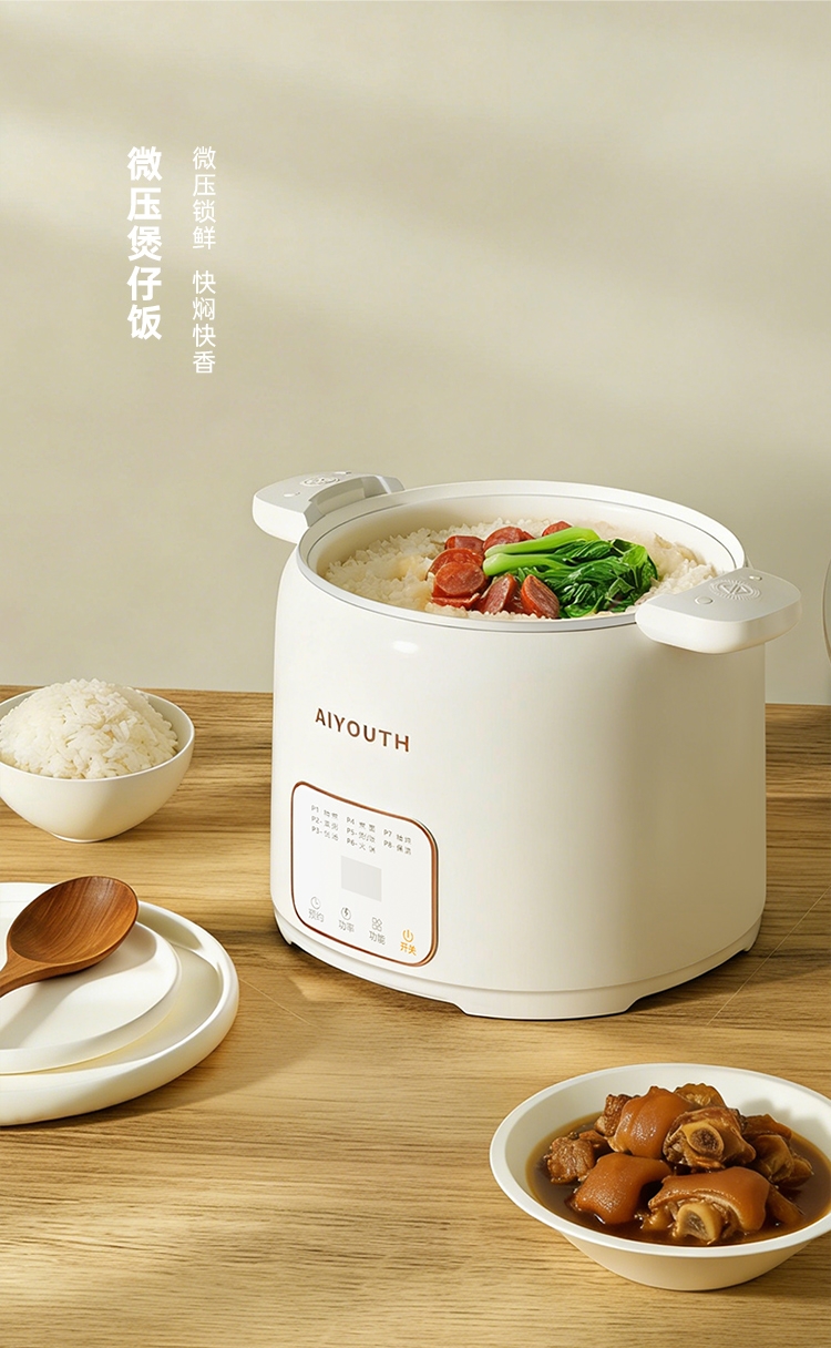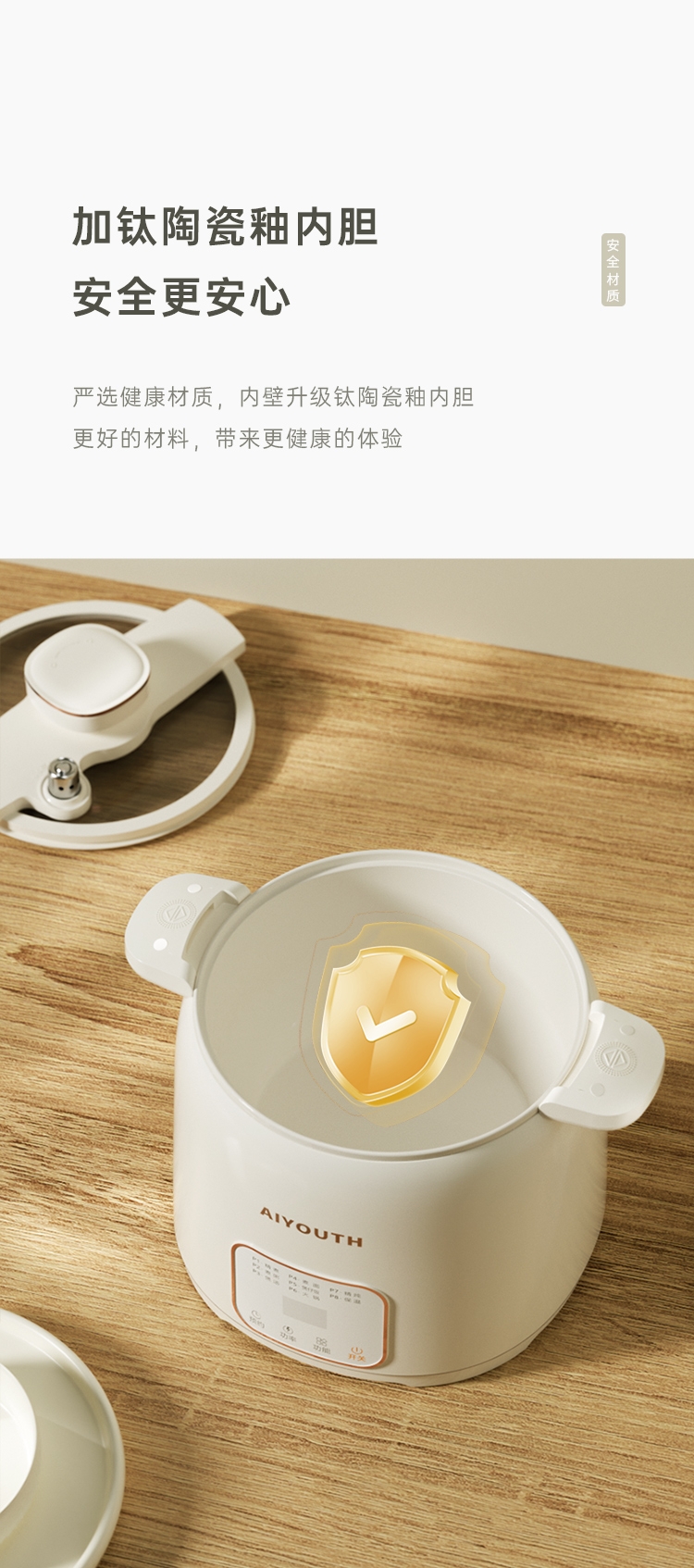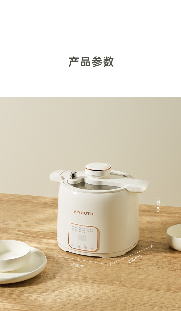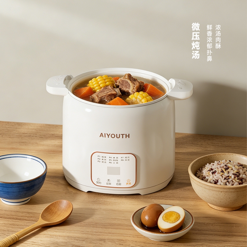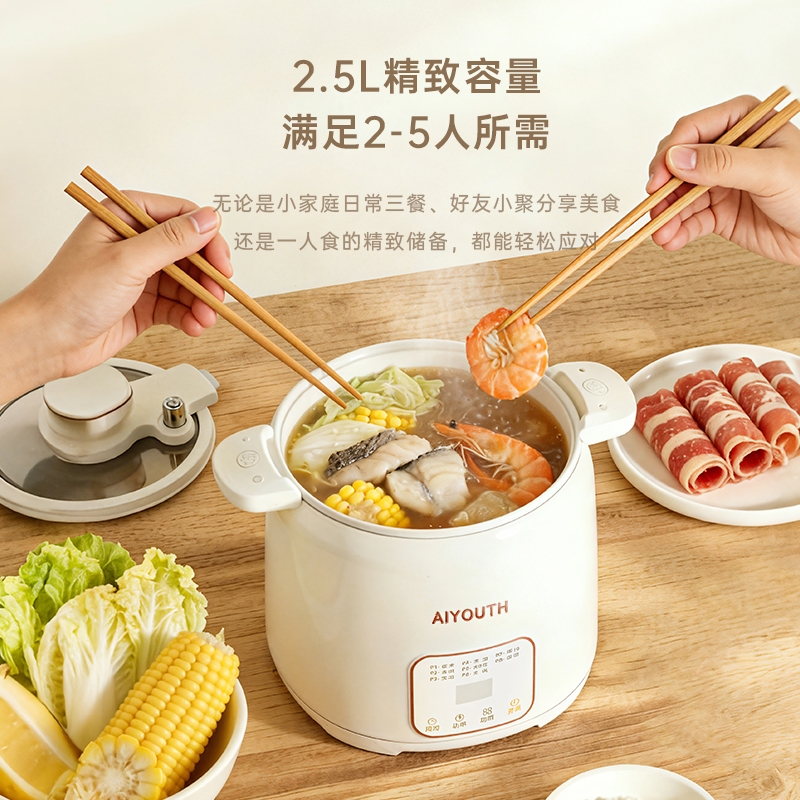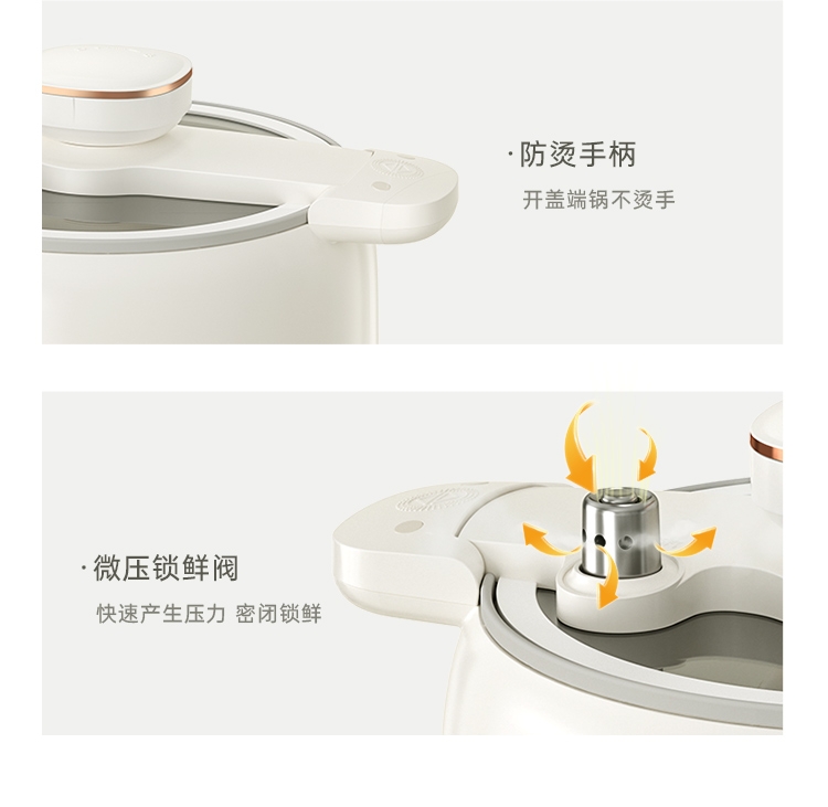 七大预设菜谱,家常美味一键即成;智能触控面板,分区清晰,操作简单直观;微压快炖技术,多种菜单,适配不同食材;镀钛陶瓷釉内胆,食品级材质,使用更安心;2.5L黄金容量,小巧精致,满足2-5人日常使用