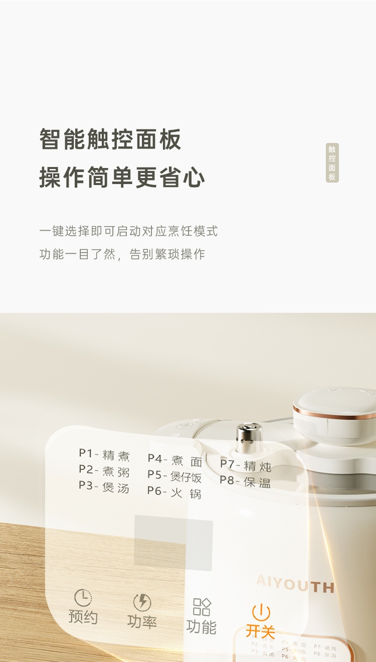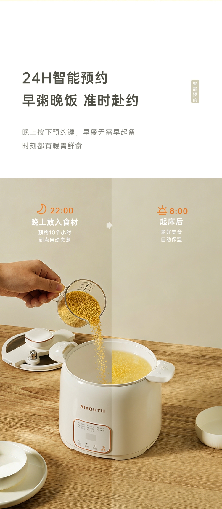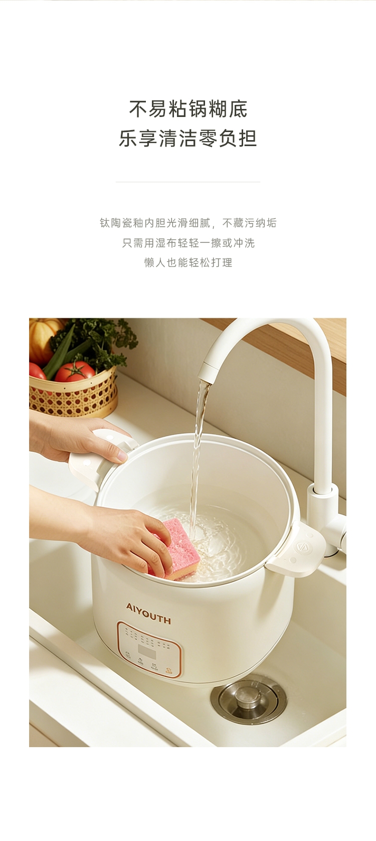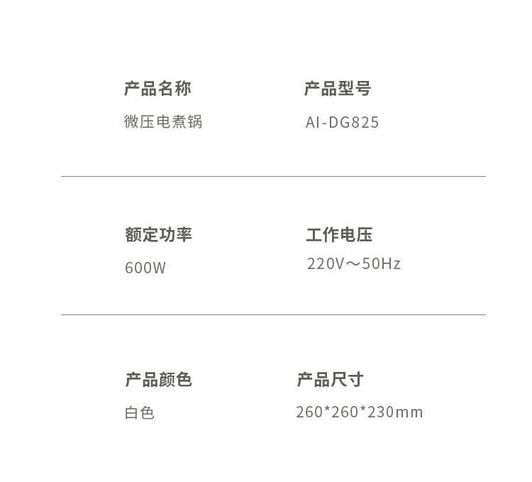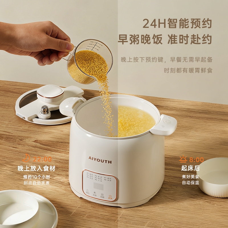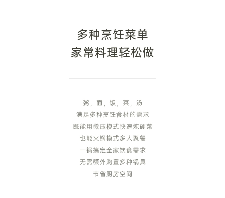 七大预设菜谱,家常美味一键即成;智能触控面板,分区清晰,操作简单直观;微压快炖技术,多种菜单,适配不同食材;镀钛陶瓷釉内胆,食品级材质,使用更安心;2.5L黄金容量,小巧精致,满足2-5人日常使用