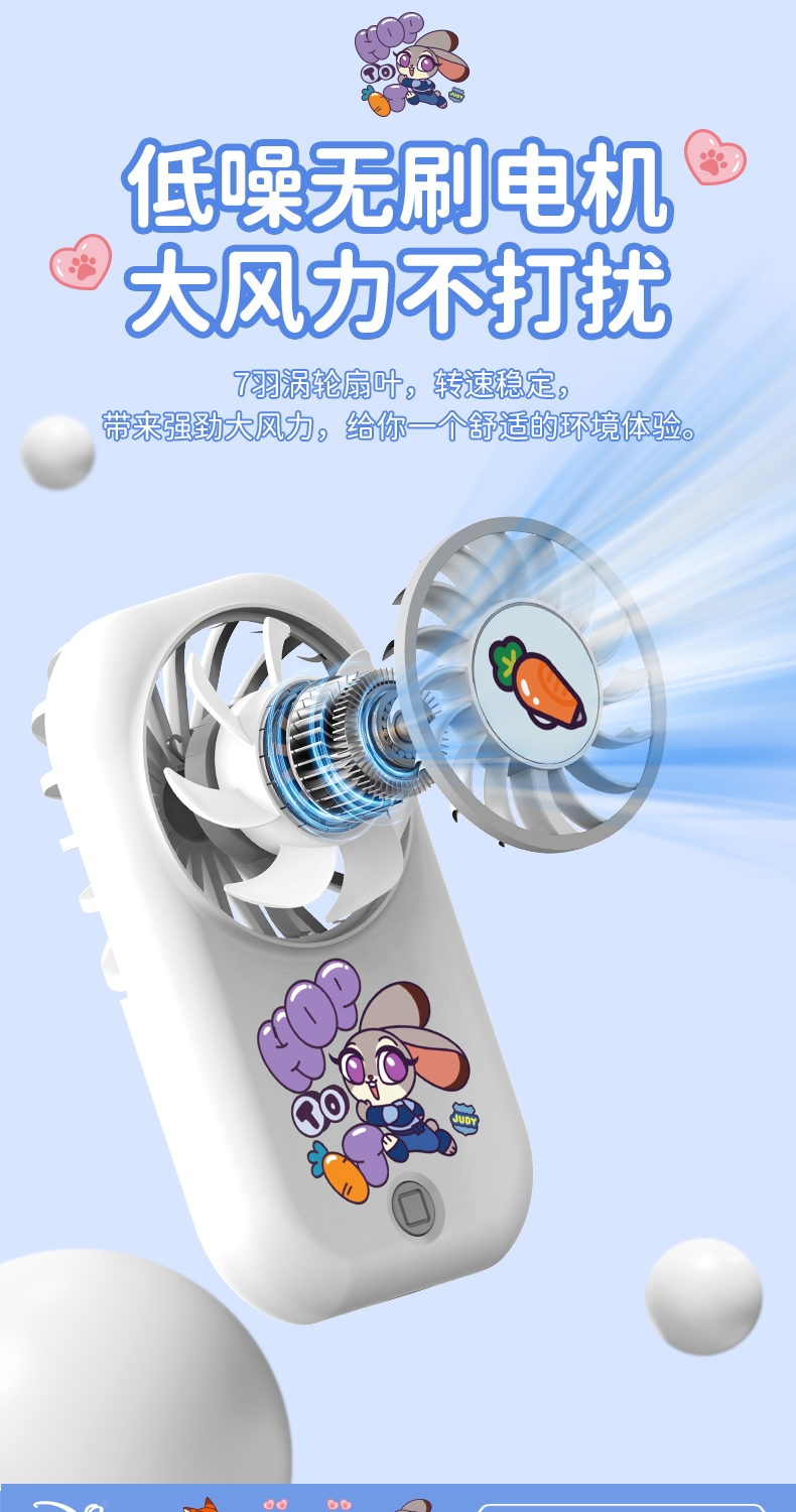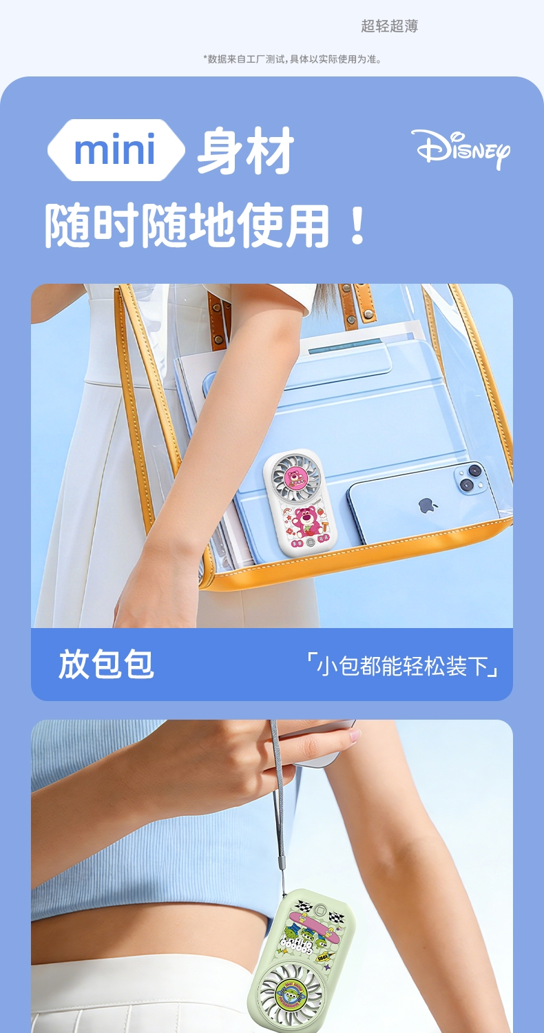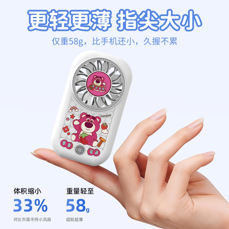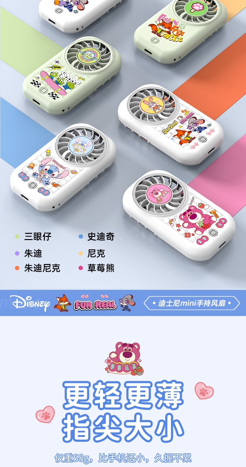 迪士尼正版IP,迷你便捷,仅重58g随身带便捷式。;强劲大风力,5挡位调节,夏日清凉不闷热,;卡通高颜值造型,静音低噪,久用舒适不扰人,