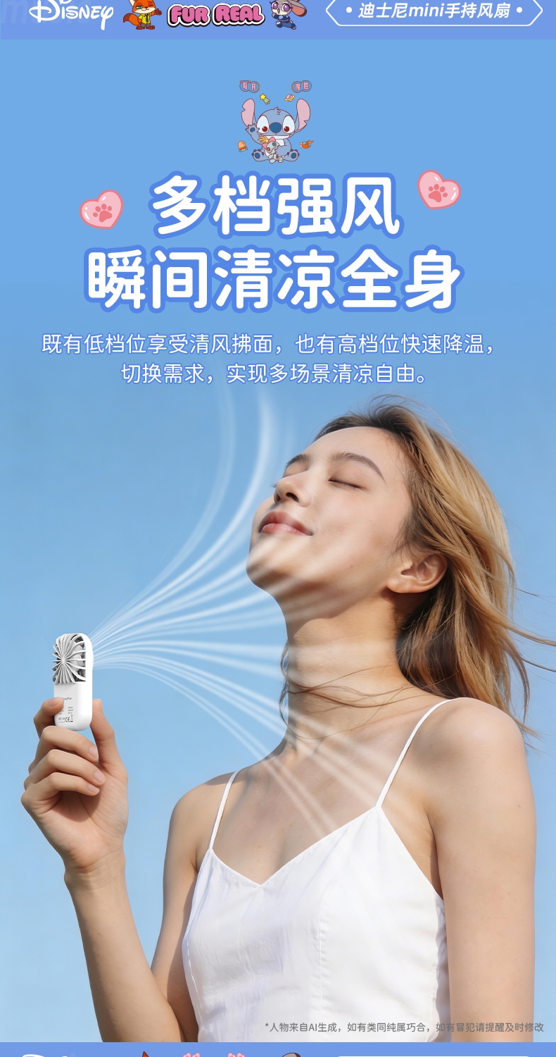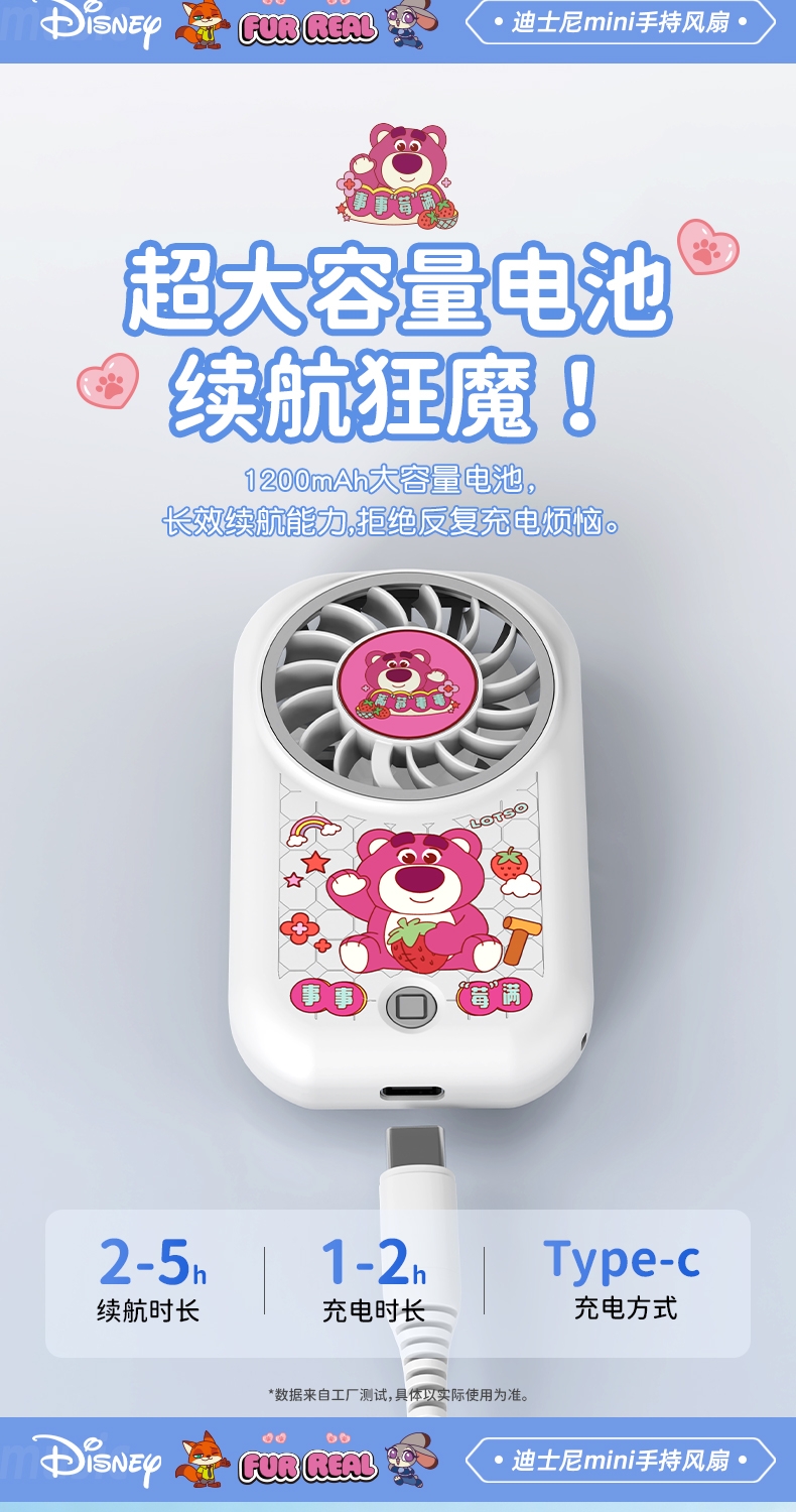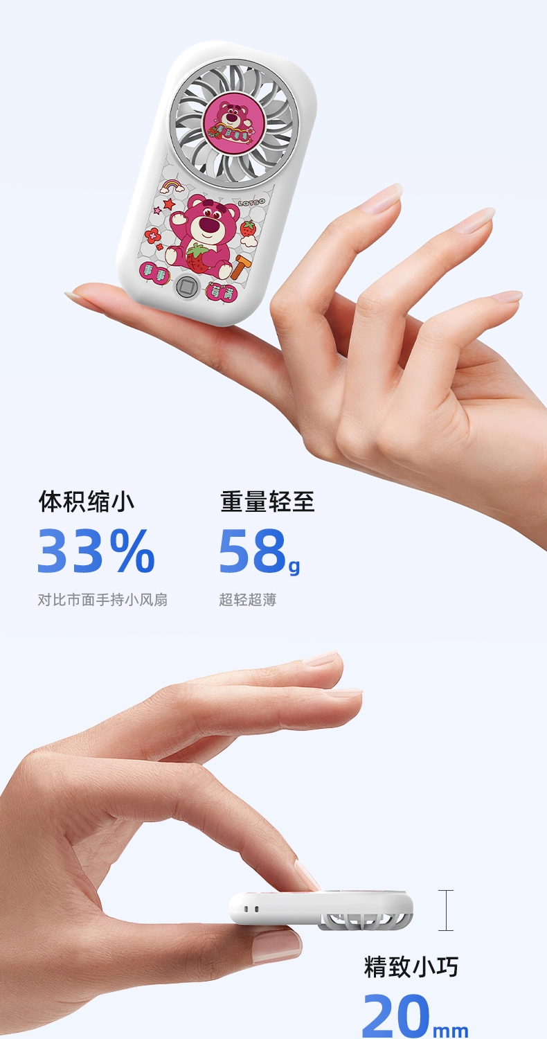 迪士尼正版IP,迷你便捷,仅重58g随身带便捷式。;强劲大风力,5挡位调节,夏日清凉不闷热,;卡通高颜值造型,静音低噪,久用舒适不扰人,
