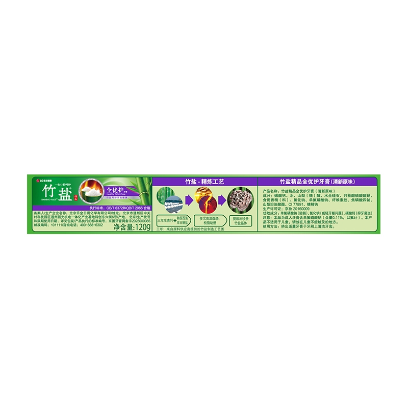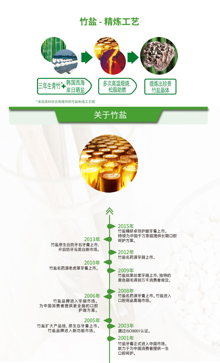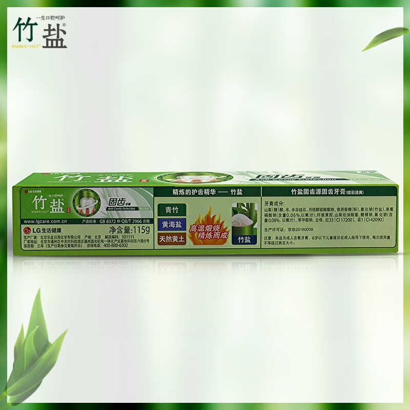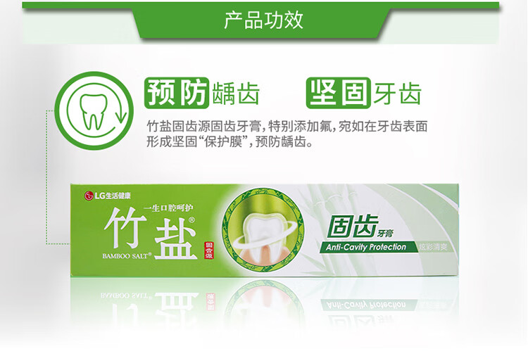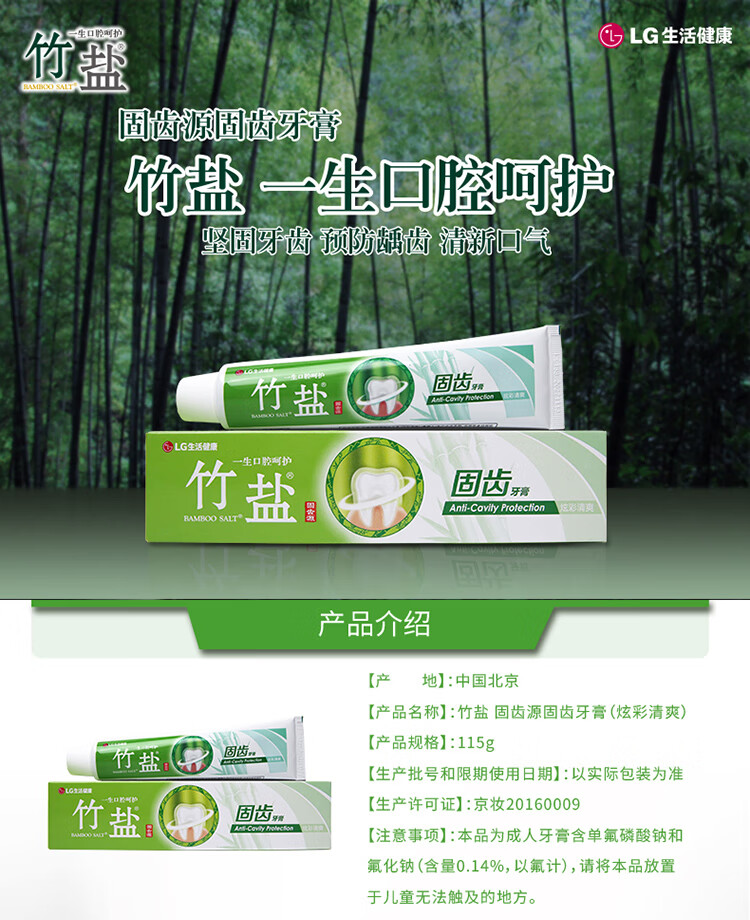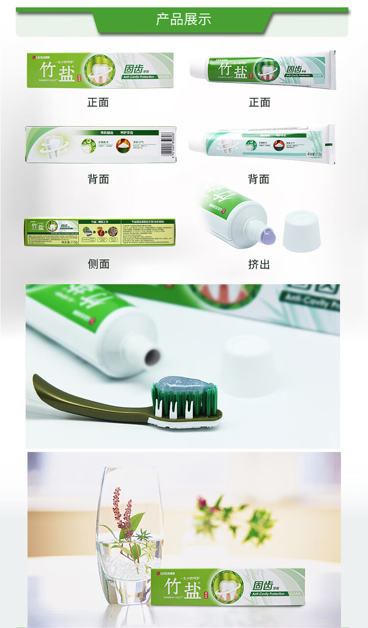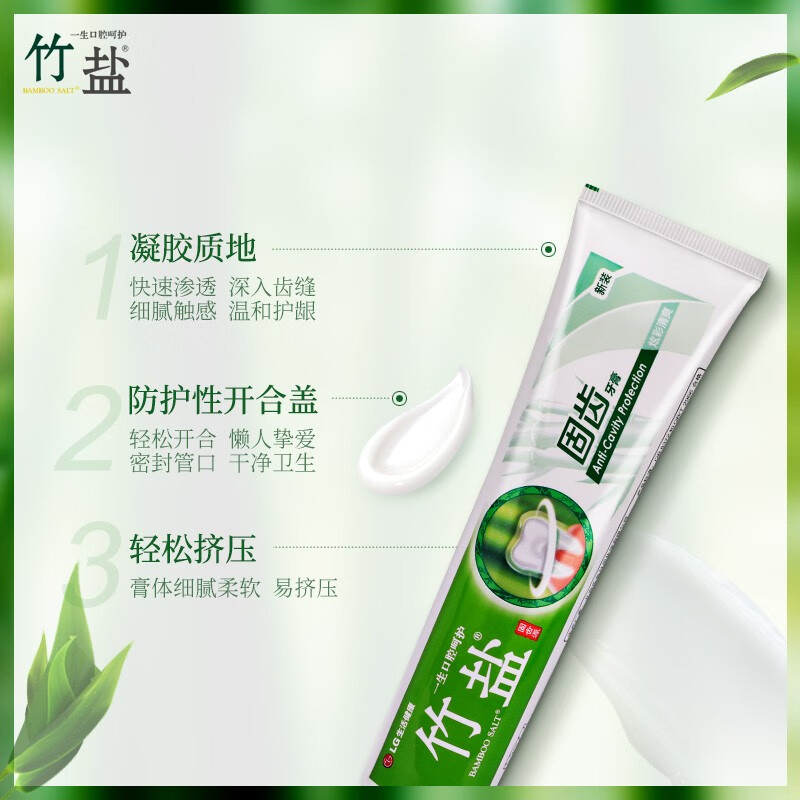 竹盐成分,呵护牙龈、洁白牙齿、清洁口腔、清新口气;特有含氟配方在牙齿表面形成坚固保护膜,预防锯齿;天然竹盐成分含有丰富的矿物质,温和呵护牙齿和牙龈