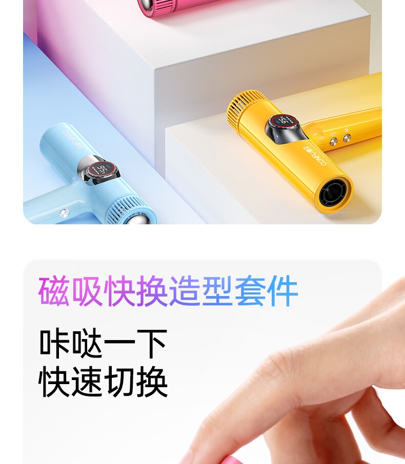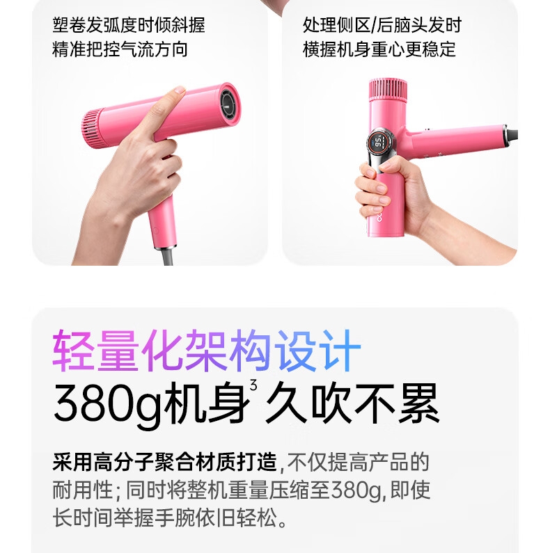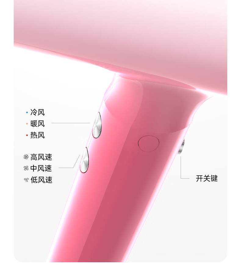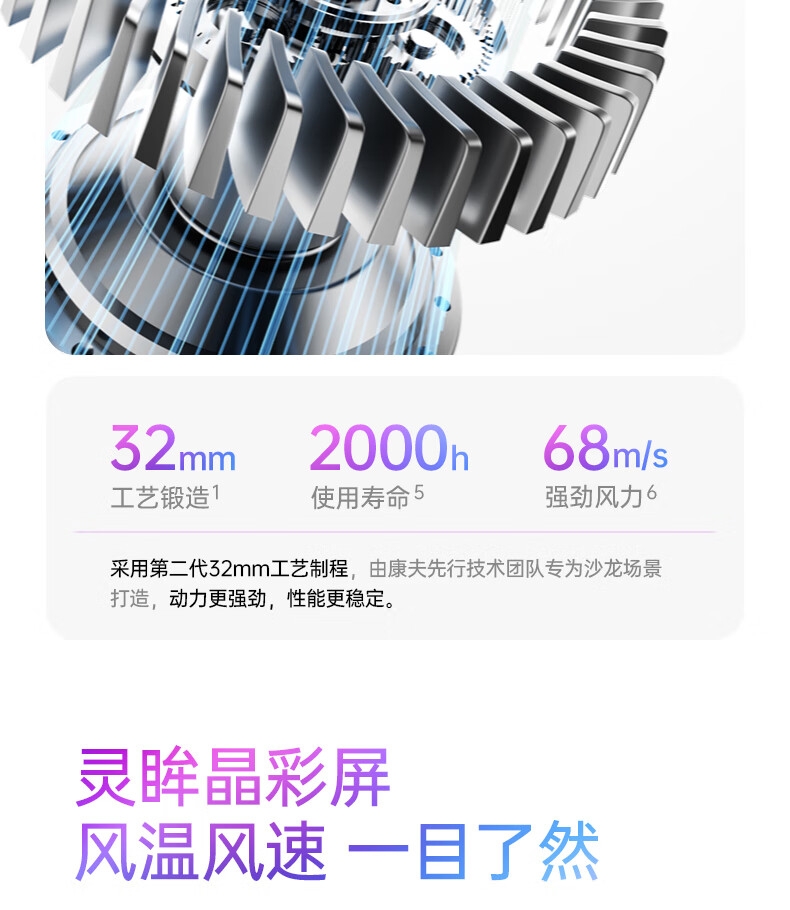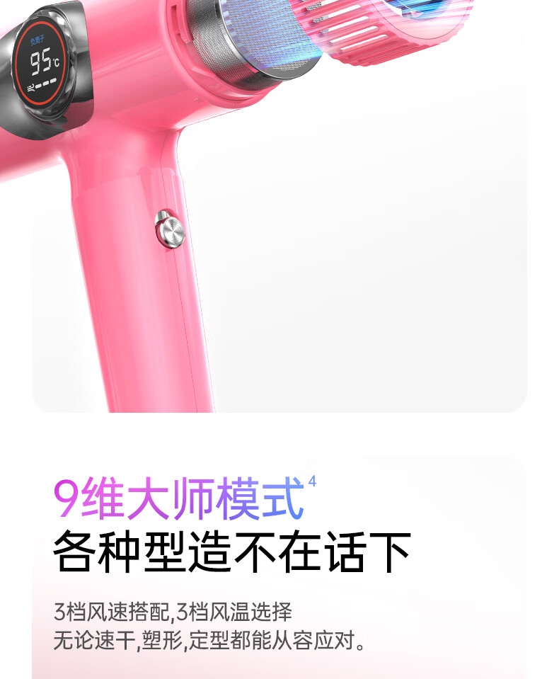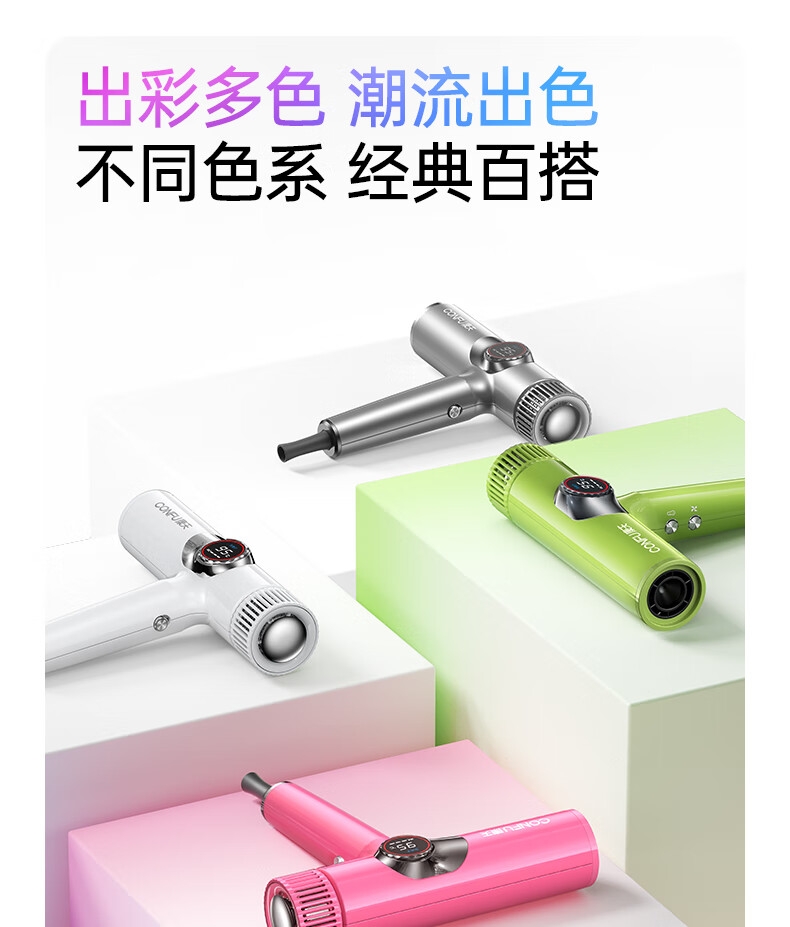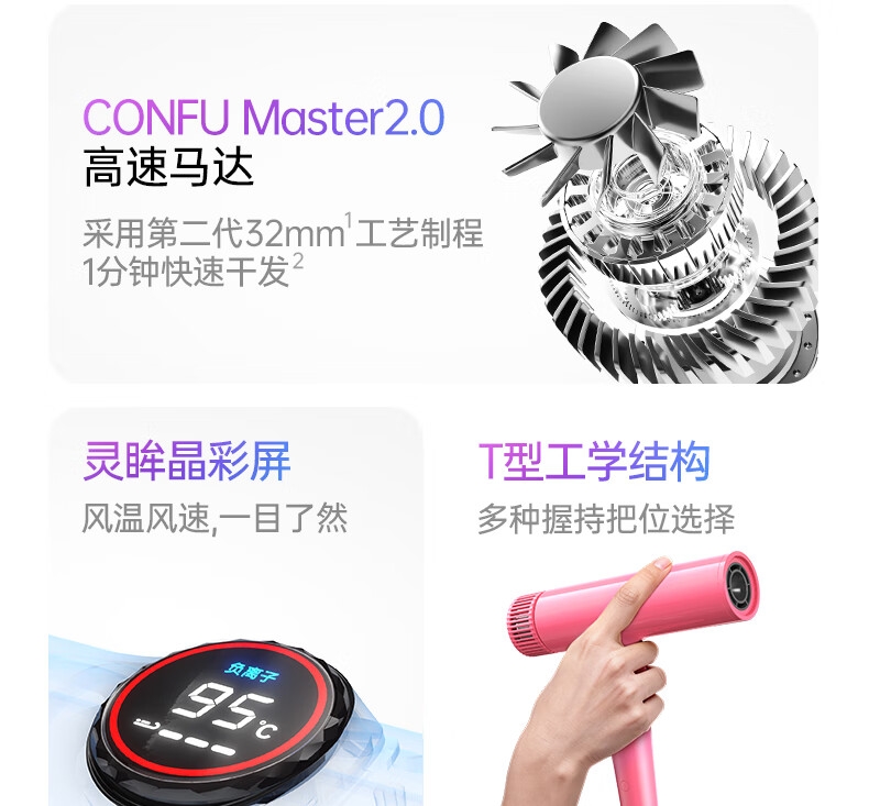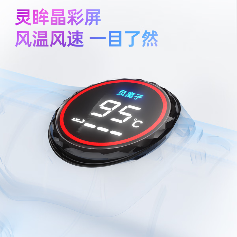 多色可选;灵眸晶彩屏 ,风温风速,一目了然;T型工学结构, 多种握持把位选择
