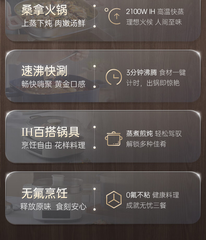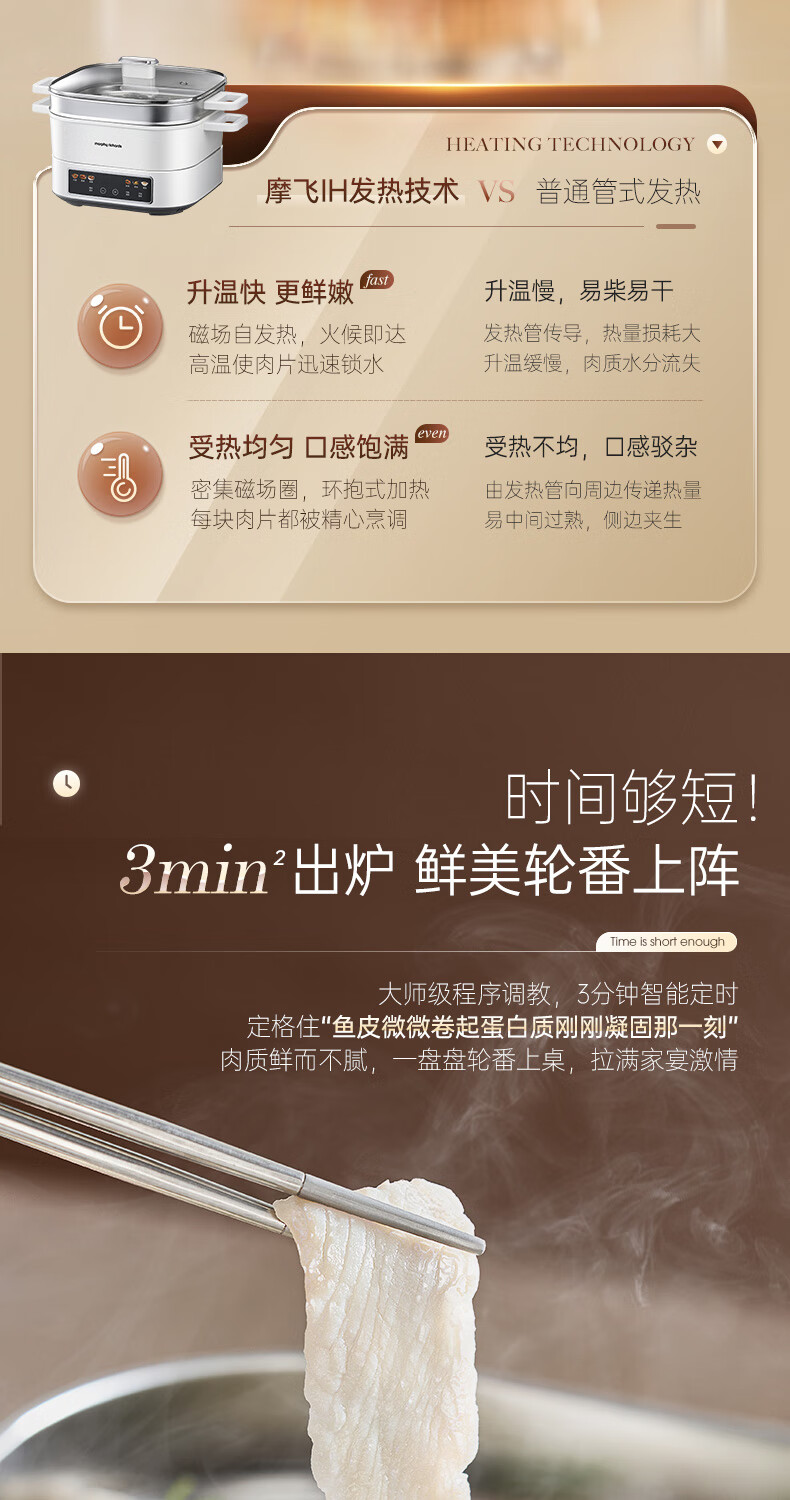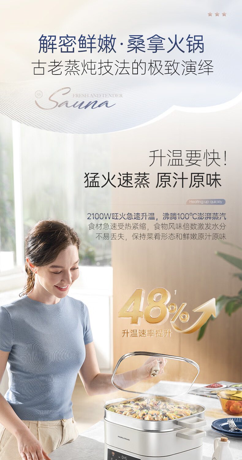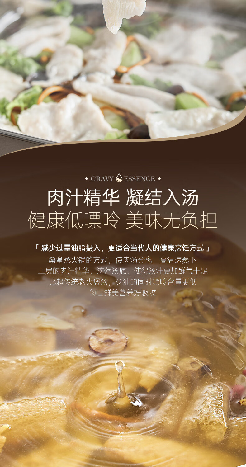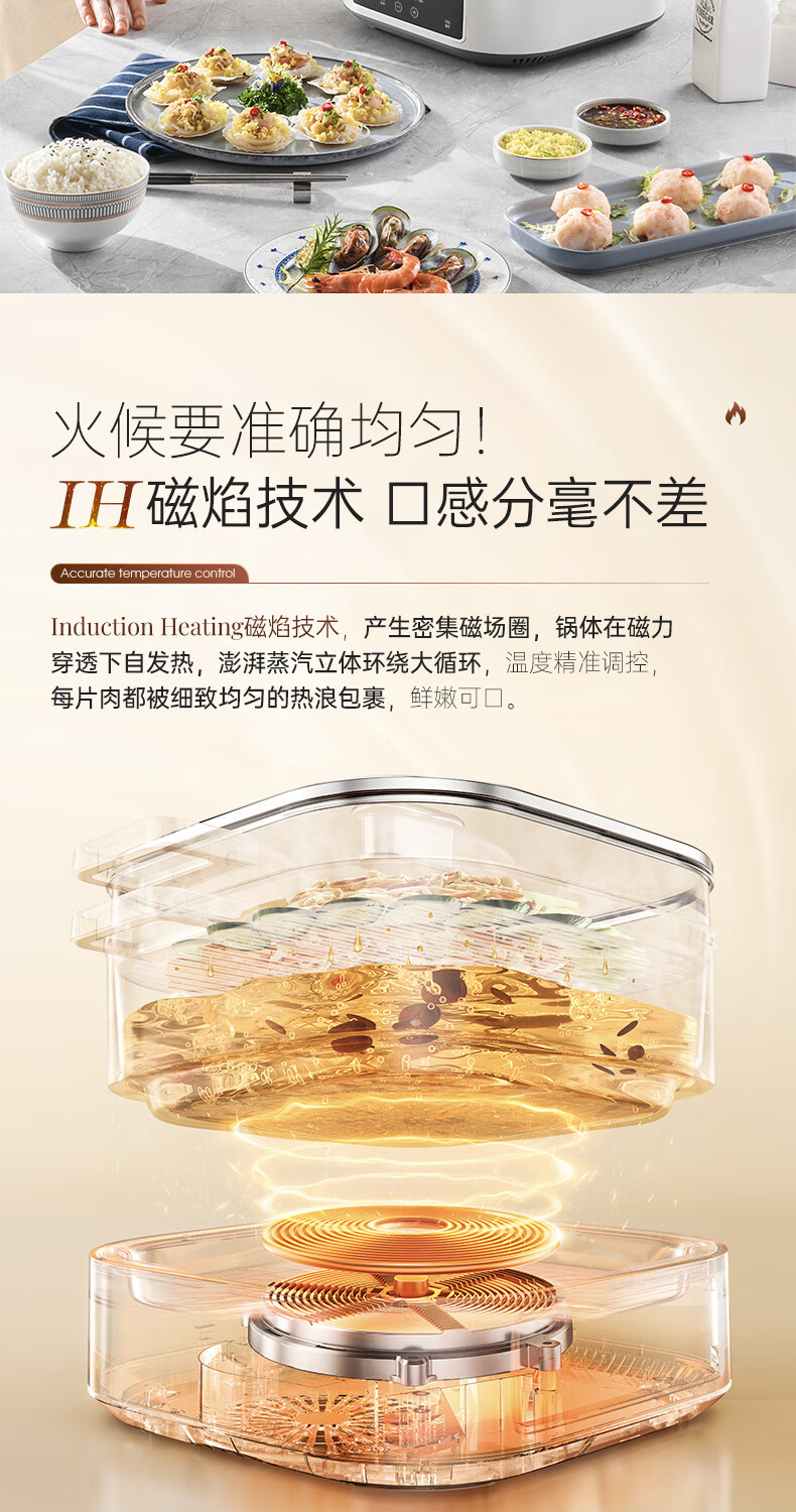 桑拿火锅上蒸下炖 肉嫩汤鲜;;速沸快涮畅快嗨聚 黄金口感:;IH百搭锅具烹饪自由 花样料理;