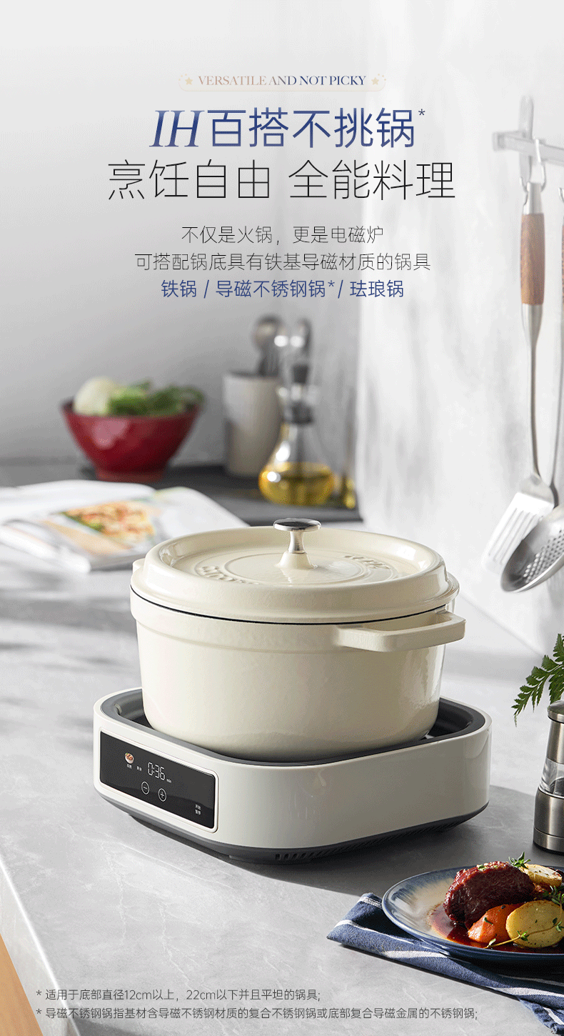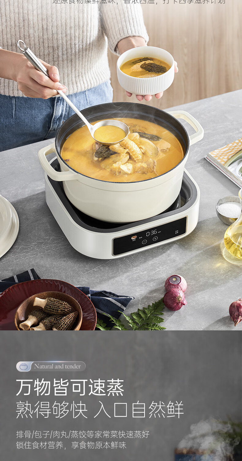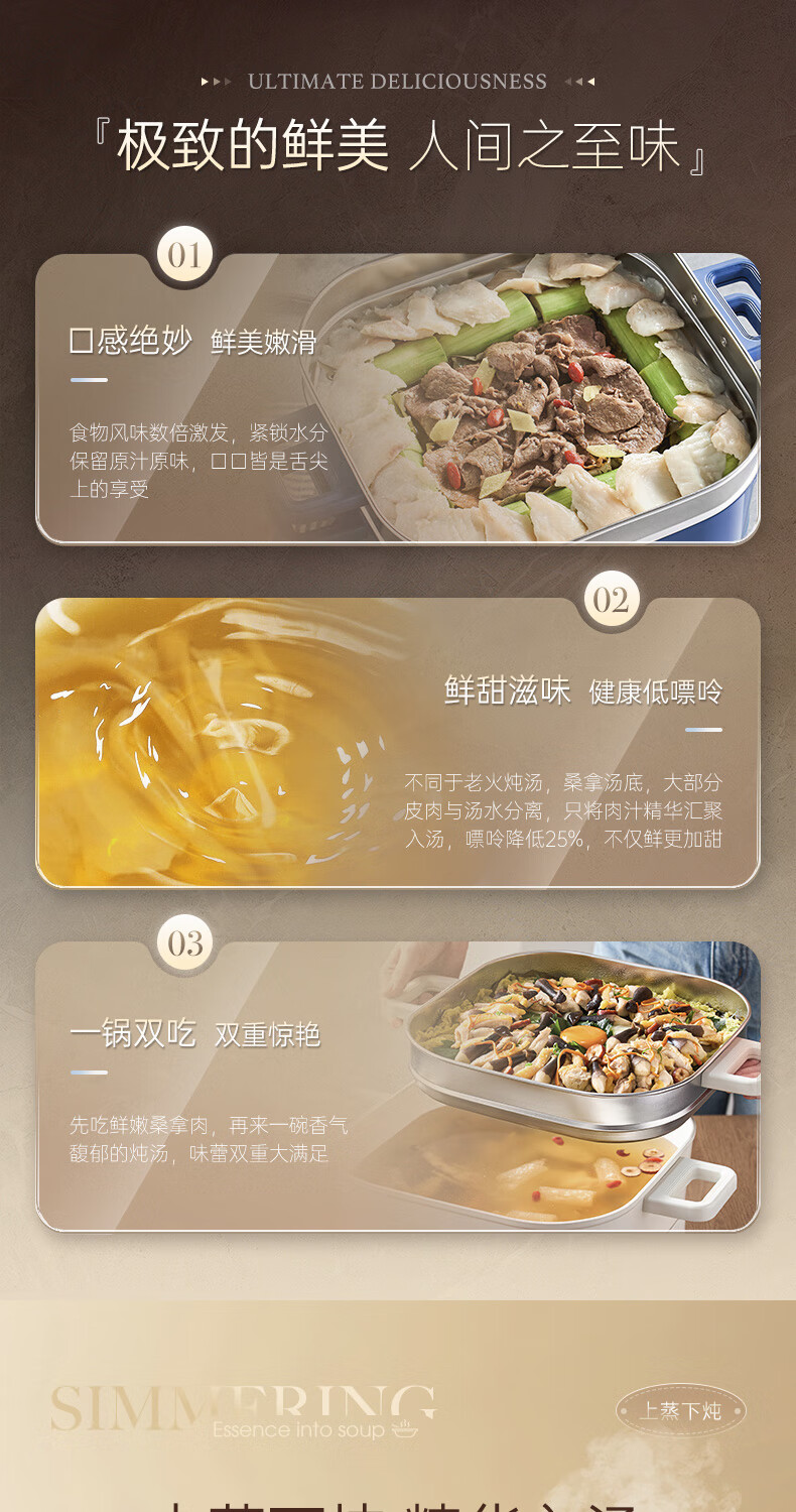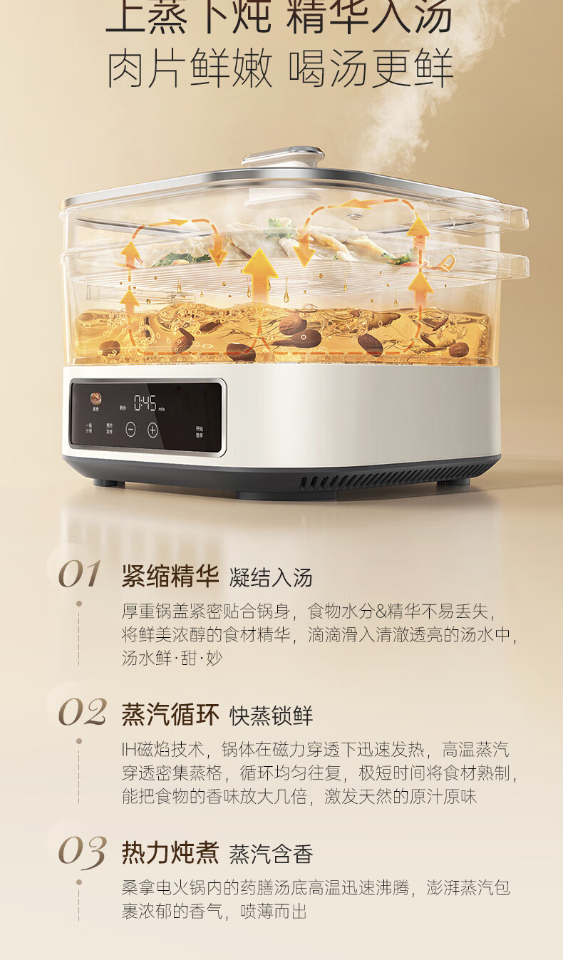 桑拿火锅上蒸下炖 肉嫩汤鲜;;速沸快涮畅快嗨聚 黄金口感:;IH百搭锅具烹饪自由 花样料理;