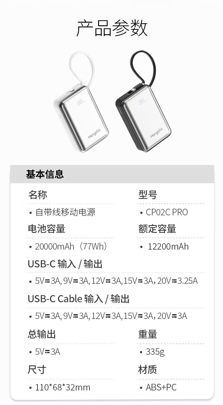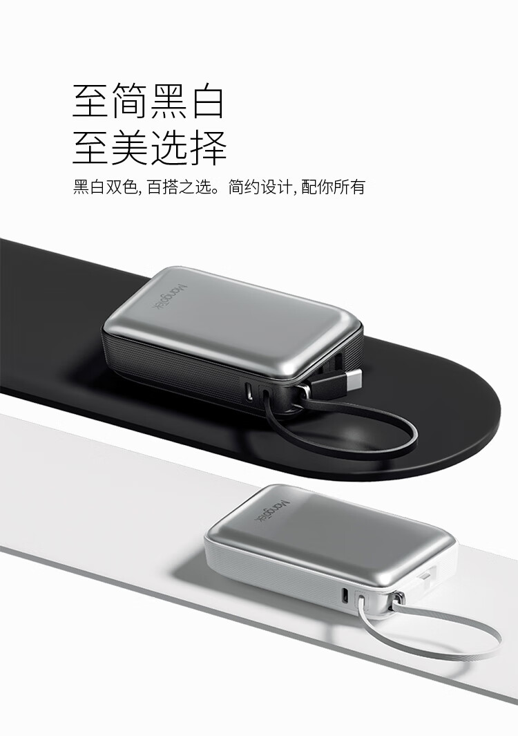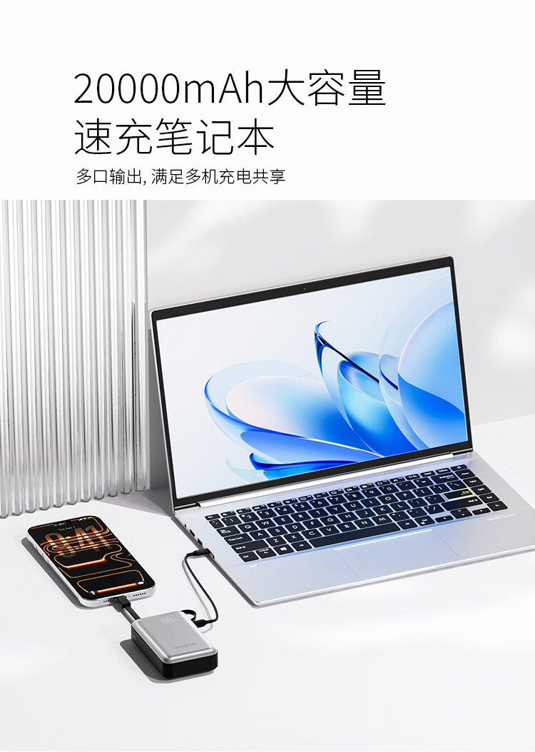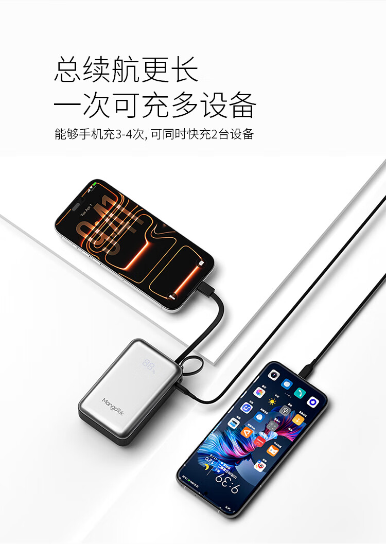 20000mAh大容量自带65W快充线;自带USB-C线,支持PD/QC等主流快充协议;按键开关,智能屏显