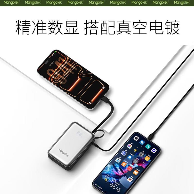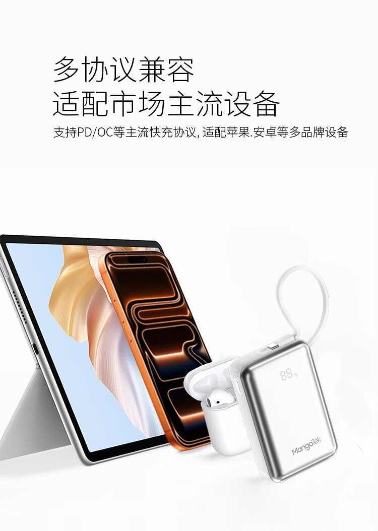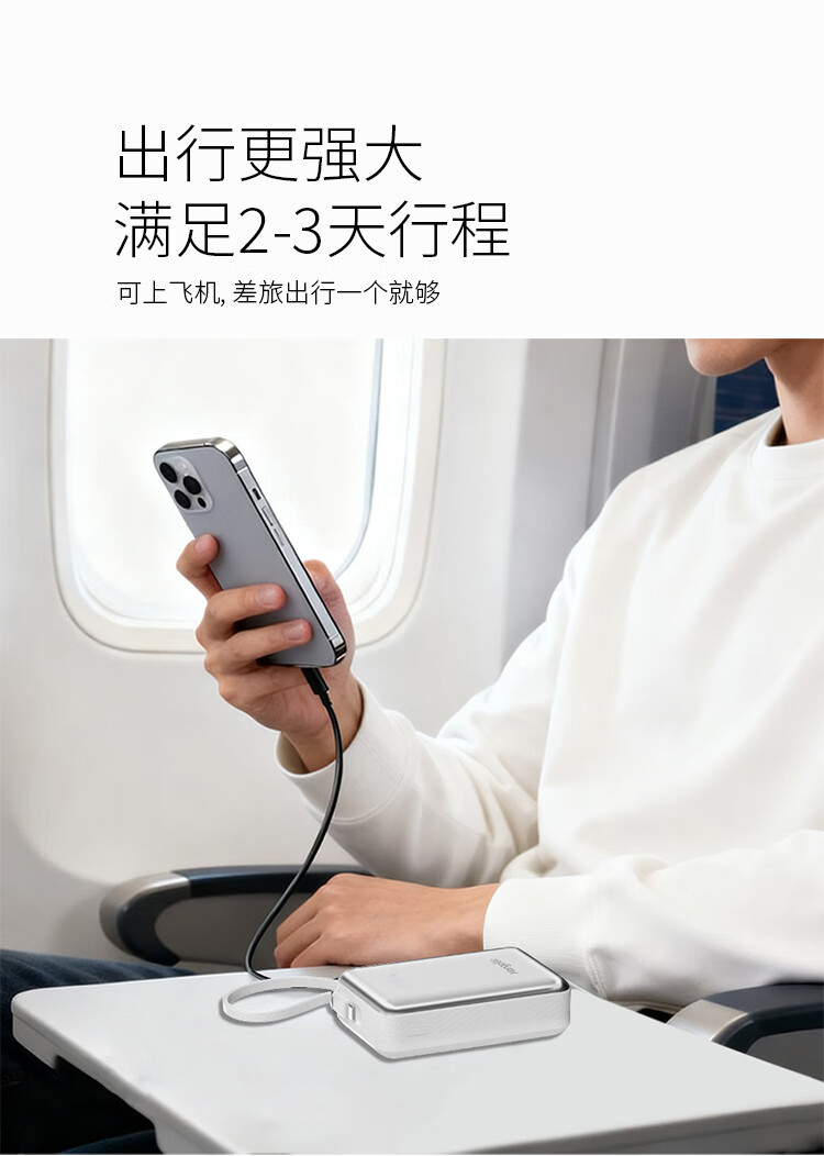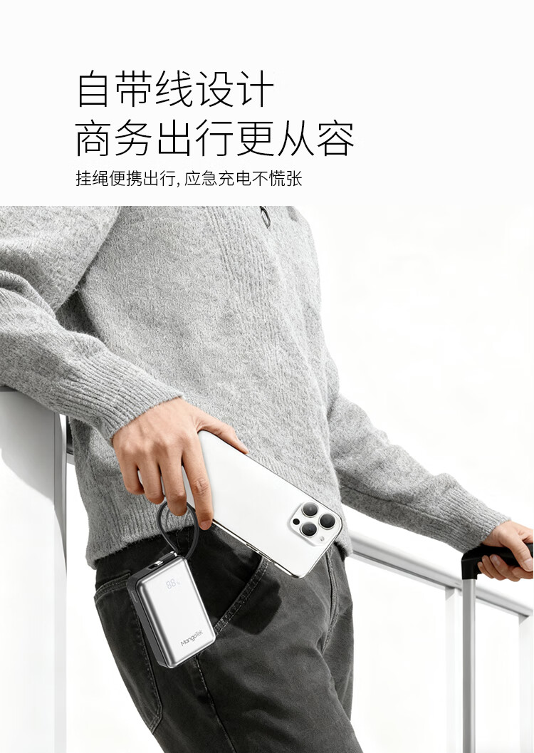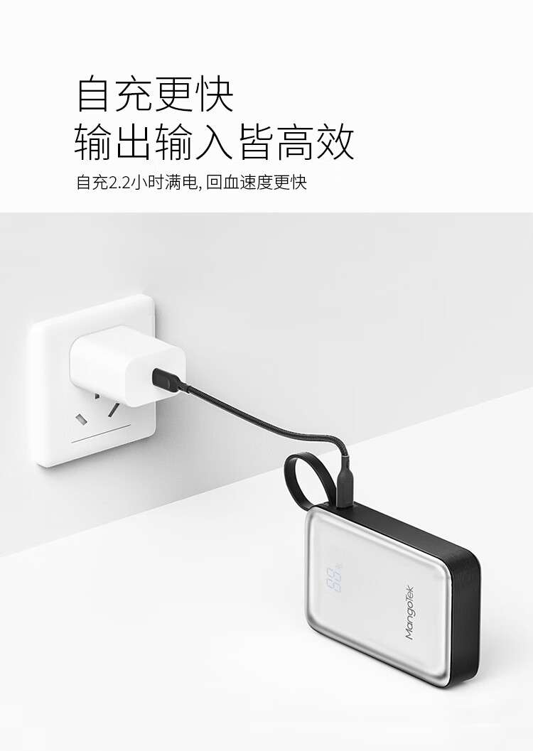 20000mAh大容量自带65W快充线;自带USB-C线,支持PD/QC等主流快充协议;按键开关,智能屏显