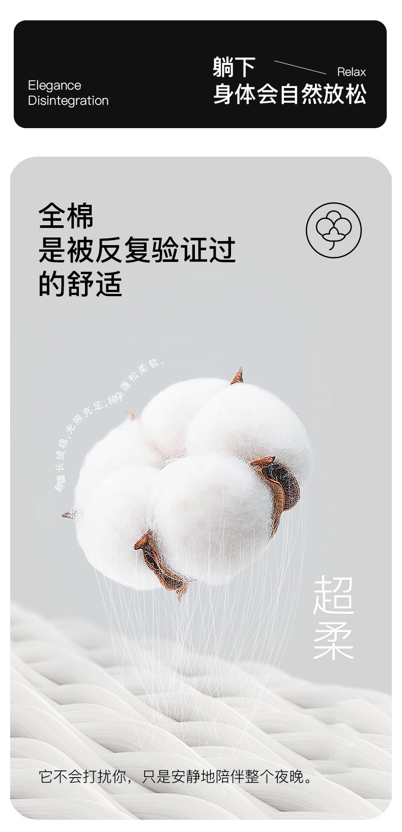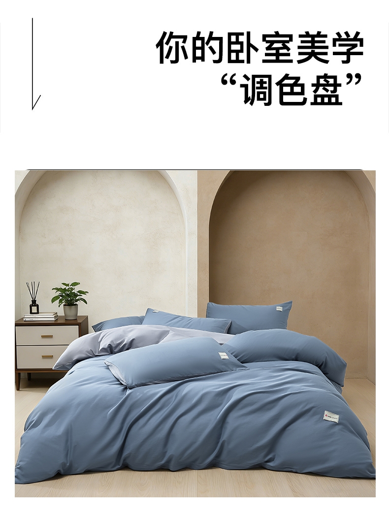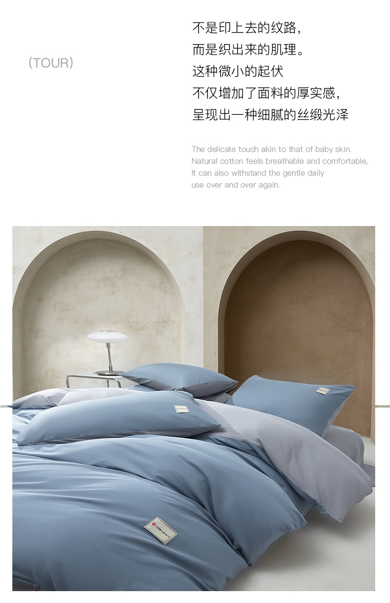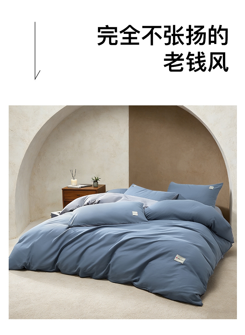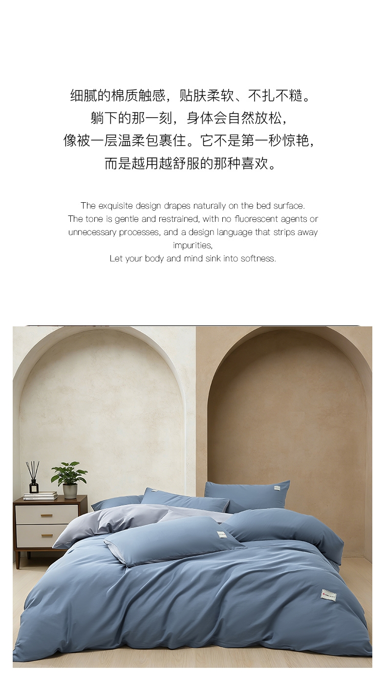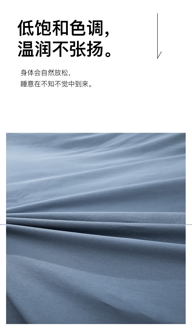 甄选全棉为原料,以高密缎纹工艺织就简约而不简单;面料通过双面精梳处理,触感如细腻沙粒般柔滑;能消除异味、避免细菌繁殖,降低细菌传播风险,耐水洗