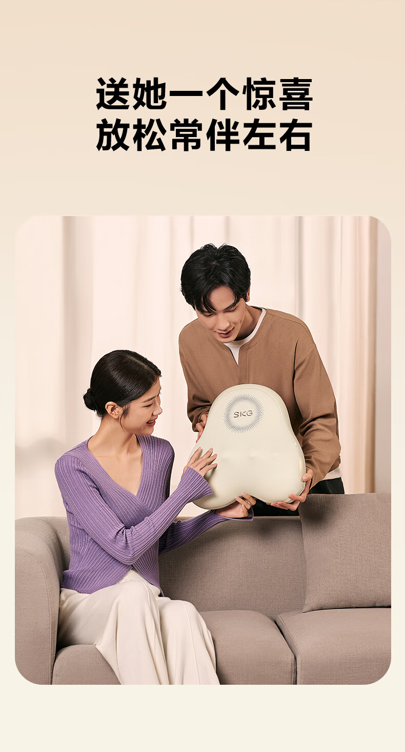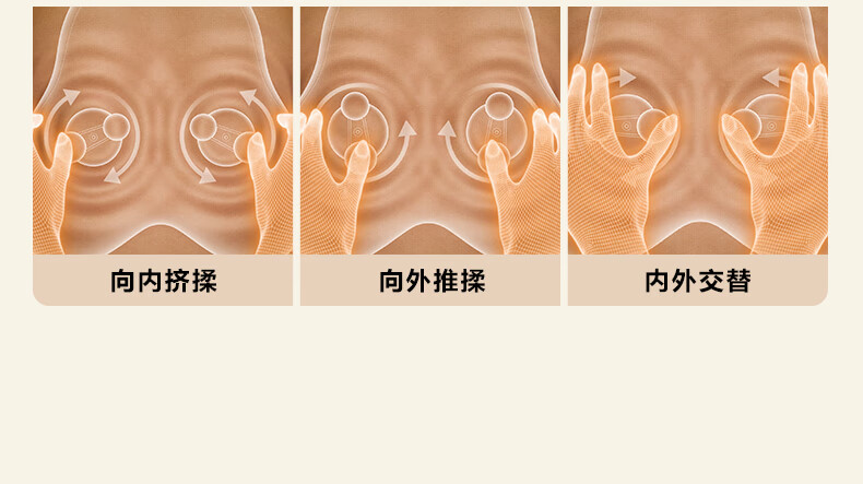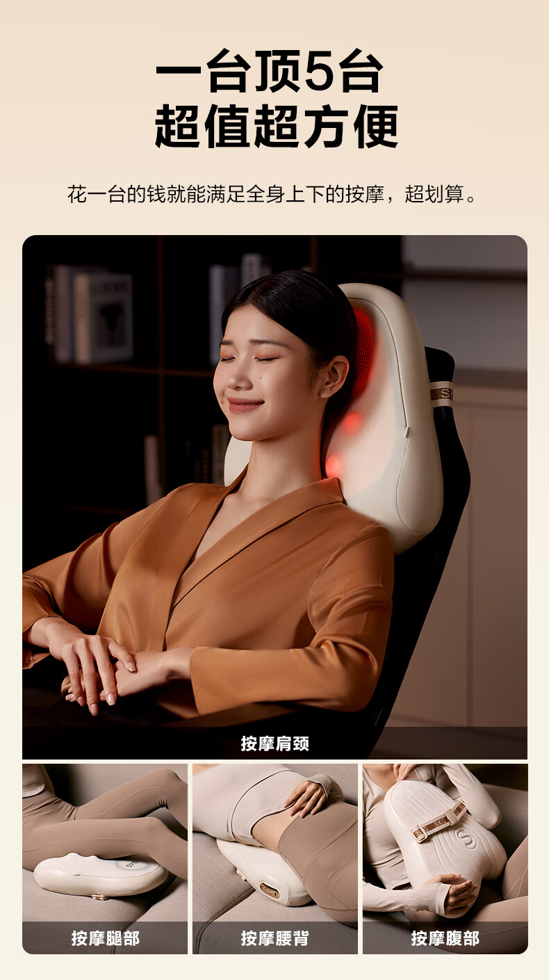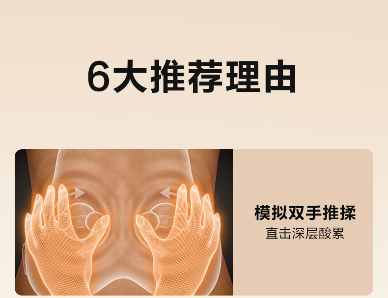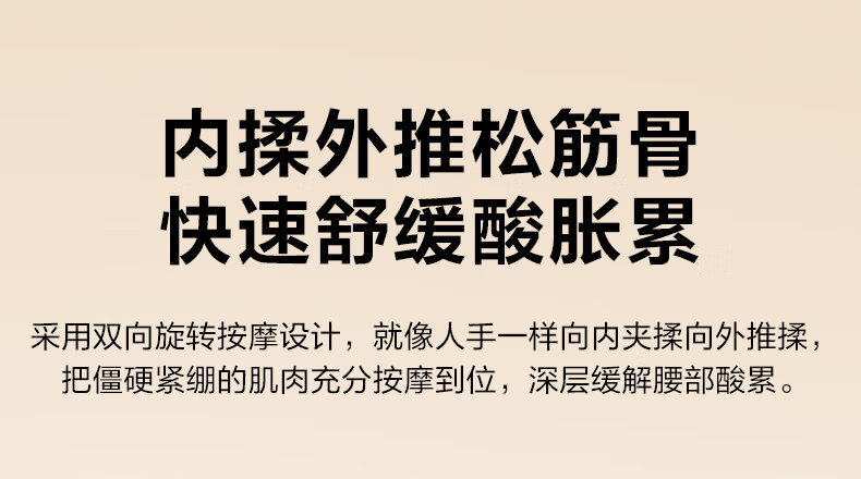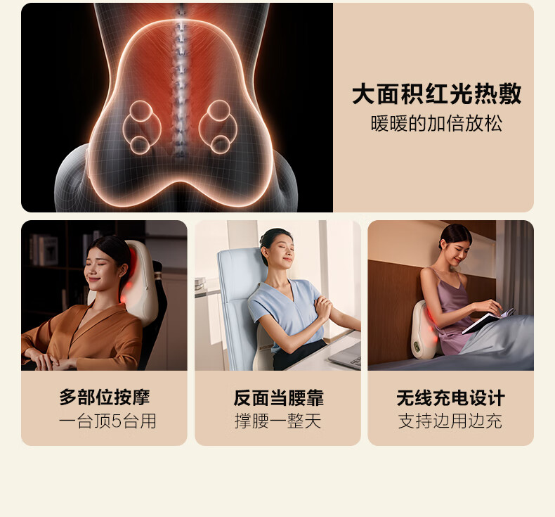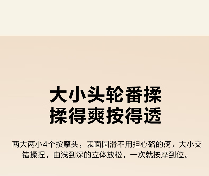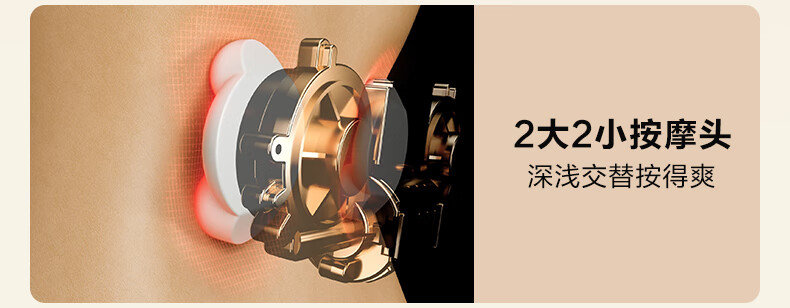 模拟双手推揉,直击深层酸累;2大2小按摩头,深浅交替按得爽;大面积红光热敷,暖暖的加倍放松