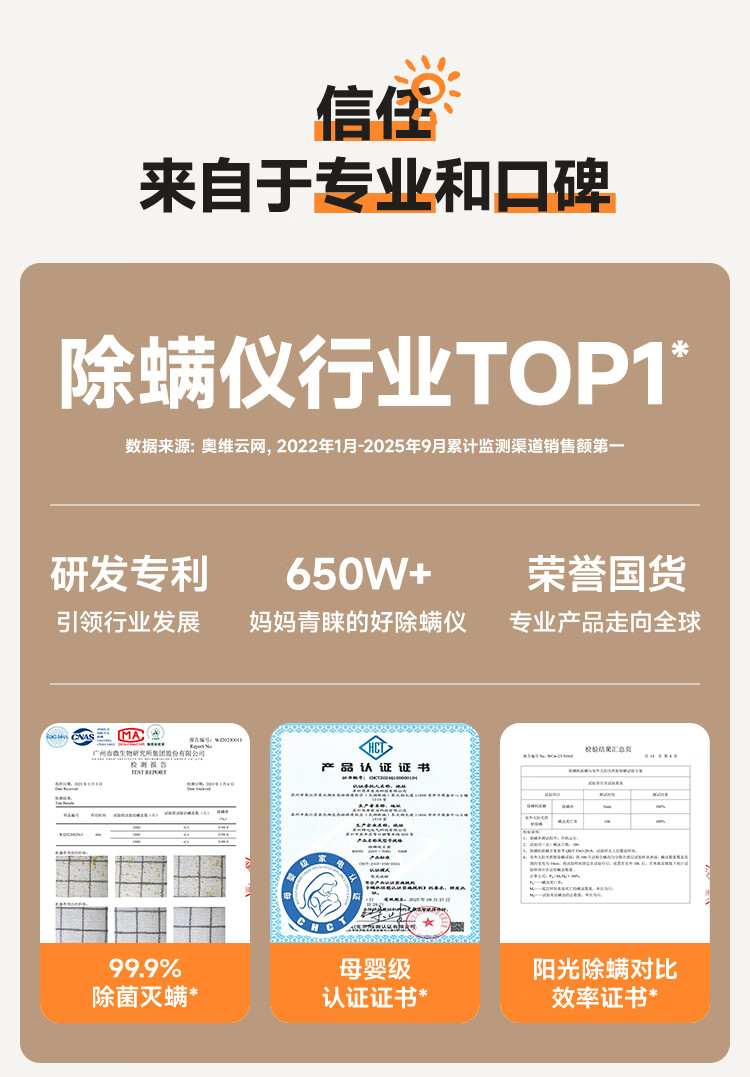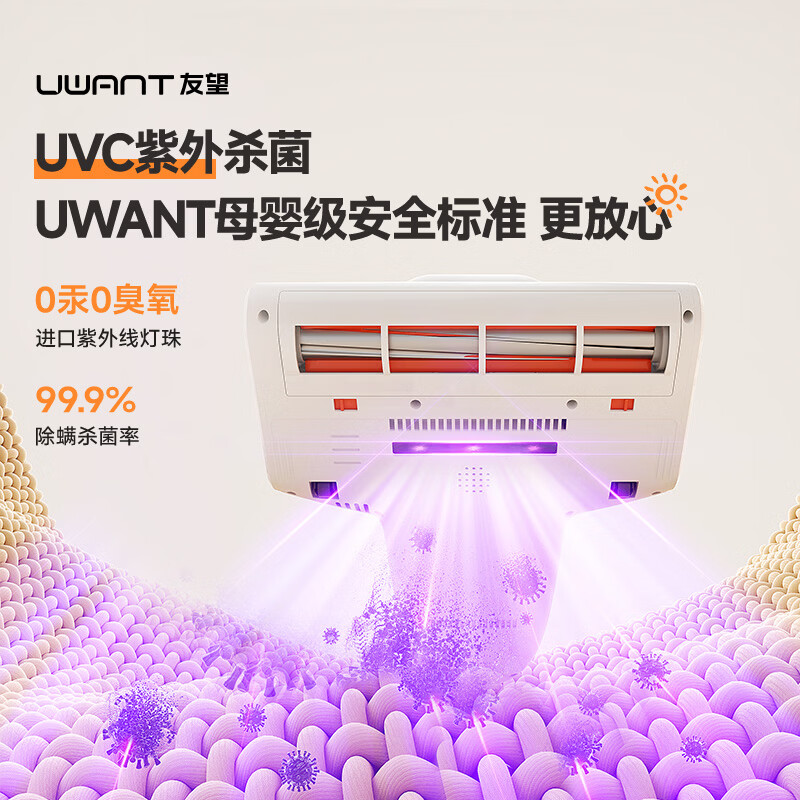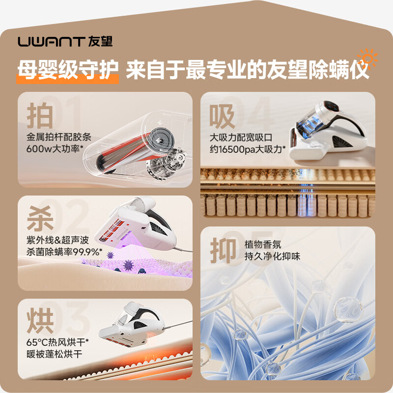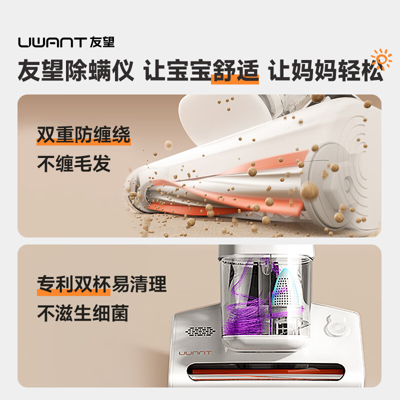 母婴级除螨仪;太阳光增强版植物香氛65℃高温杀菌;双杯床上吸尘器除螨一体机