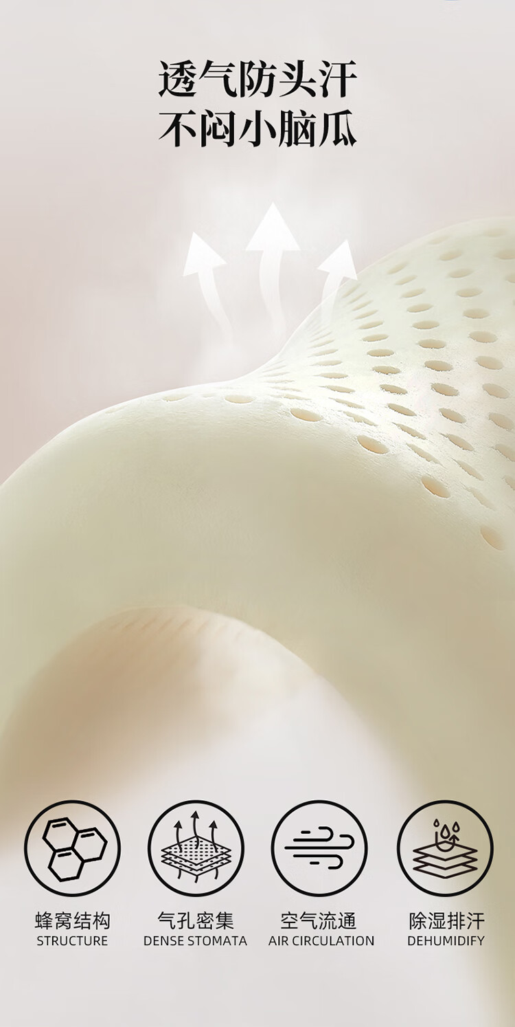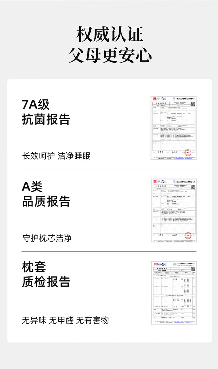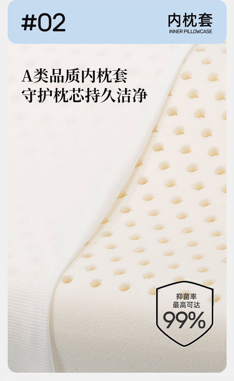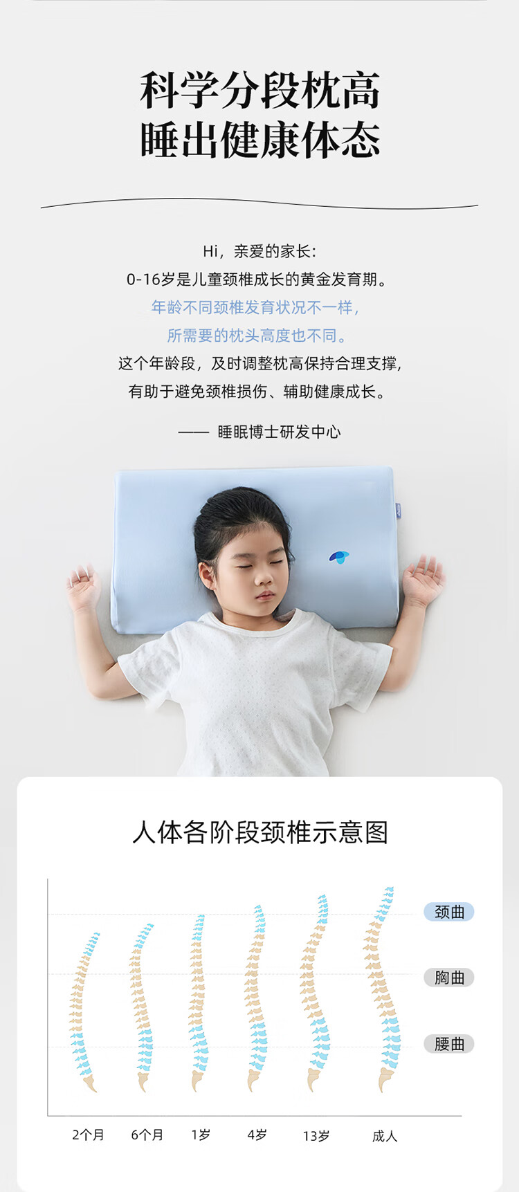 7A级纯棉抗菌枕套贴心呵护娇嫩肌肤;科学分段枕高助力宝宝健康成长;人体工学设计翻来滚去都贴合