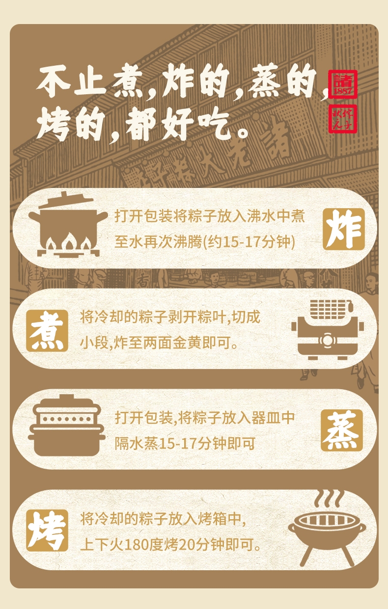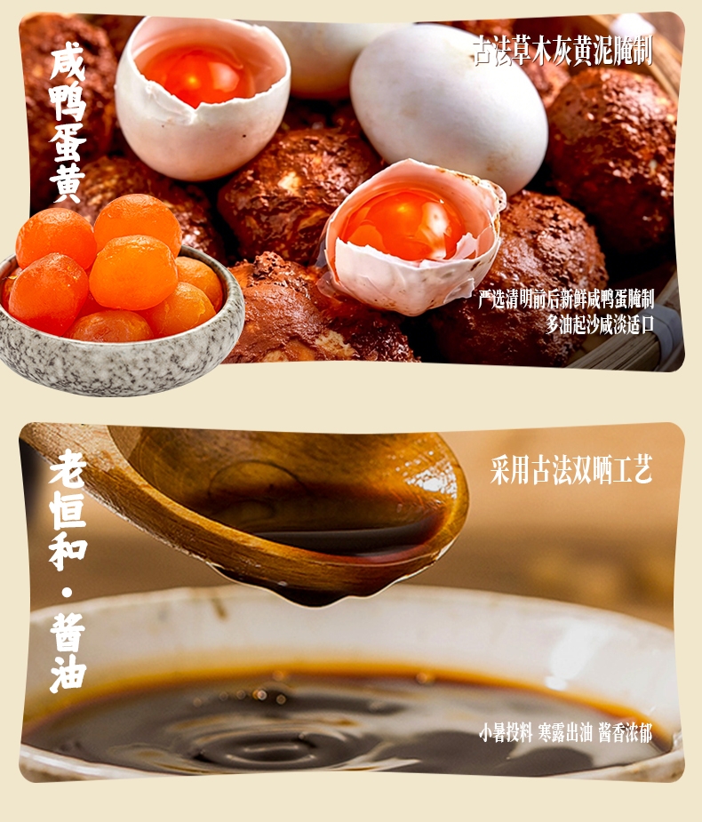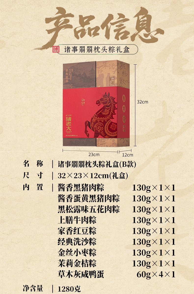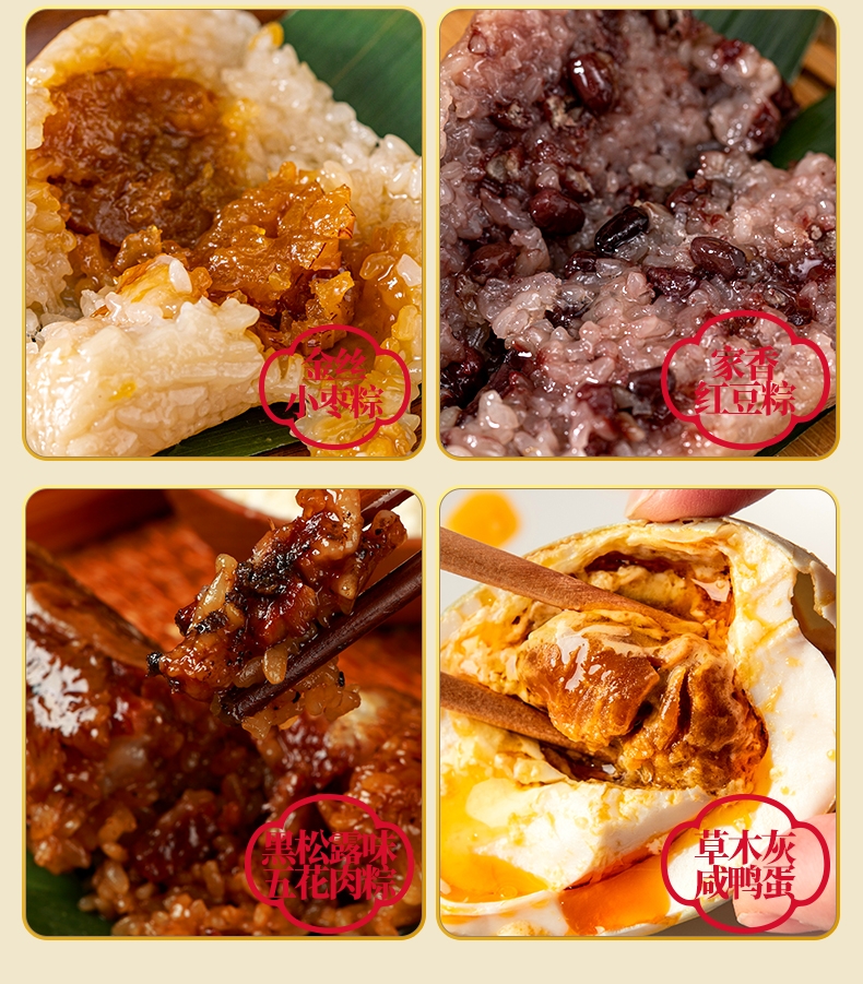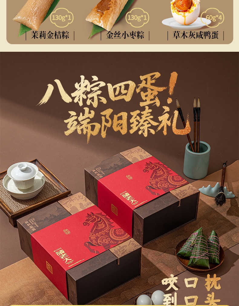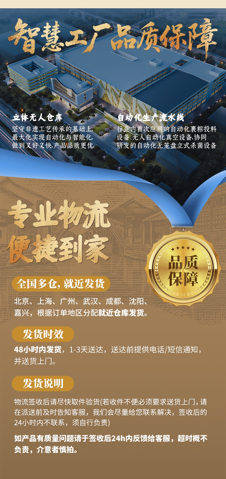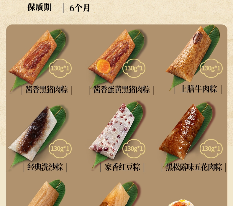 配置清单:130克*1真空酱香黑猪肉粽 130克*1真空酱香蛋黄黑猪肉粽 130克*1真空黑松露味五花肉粽 130克*1真空上膳牛肉粽 130克*1真空经典洗沙粽 130克*1真空家香红豆粽 130克*1真空金丝小枣粽 130克*1真空茉莉金桔粽 60克*4真空草木灰咸鸭蛋