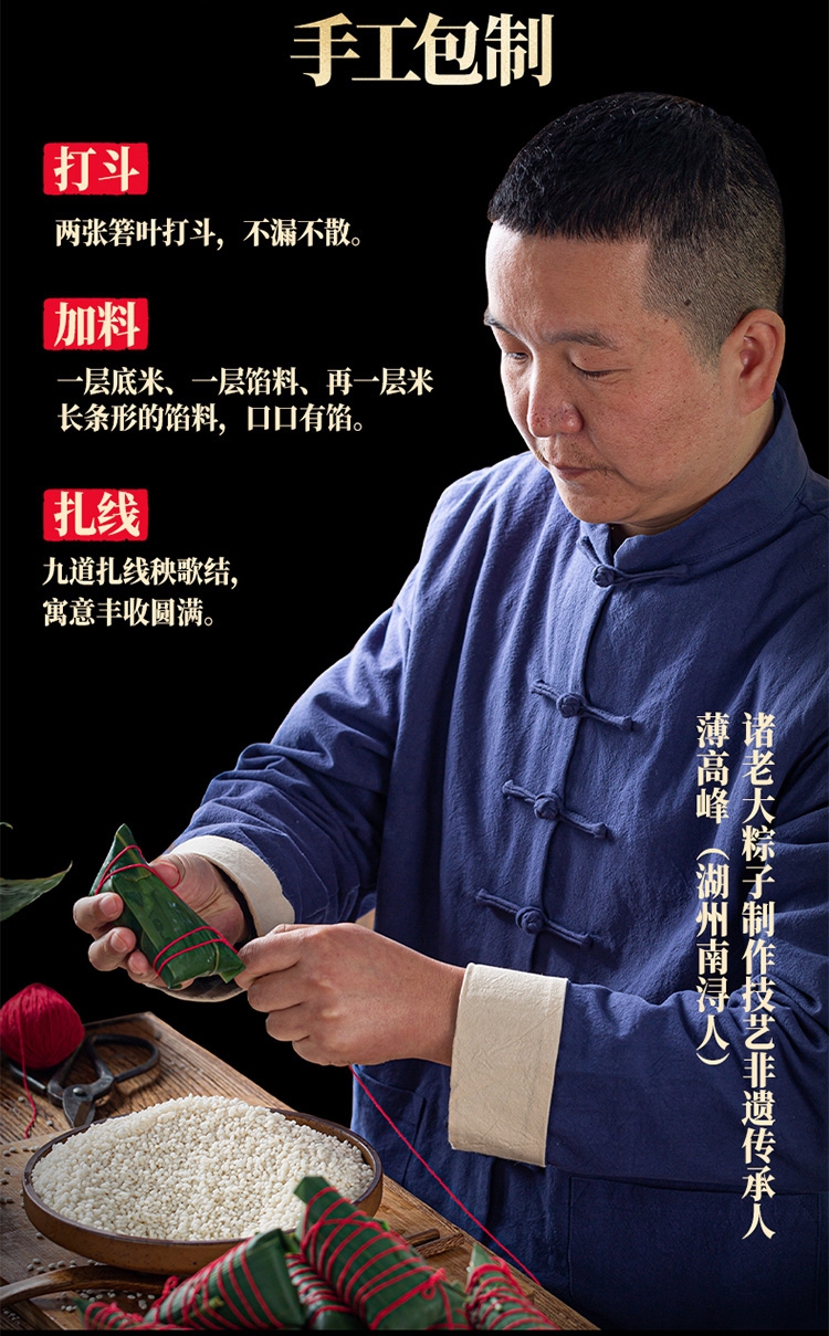 选用优质糯米、新鲜肉类、海鲜等食材,确保粽子的口感;采用传统手工制作工艺,确保粽子的形状、口感和风味符;严格遵守食品安全标准,确保产品的卫生和安全