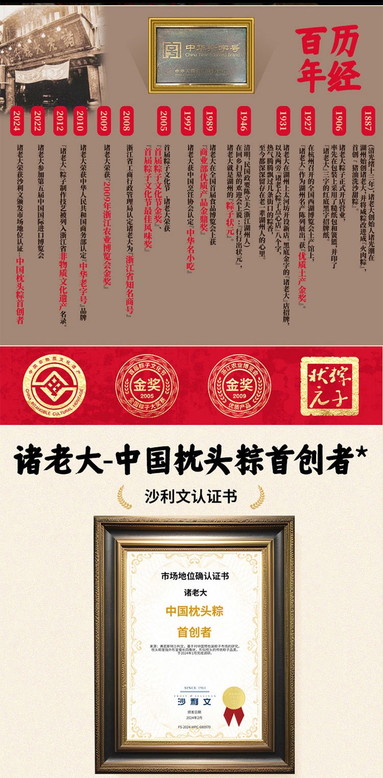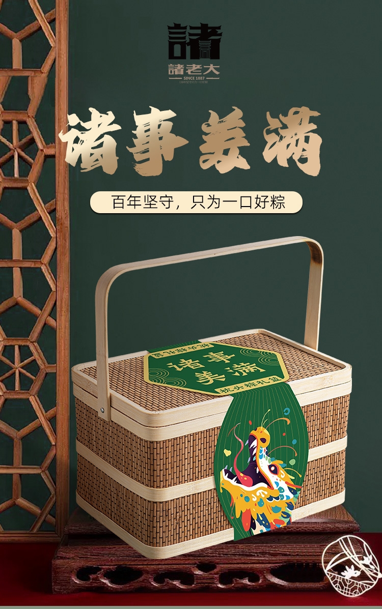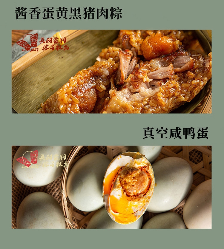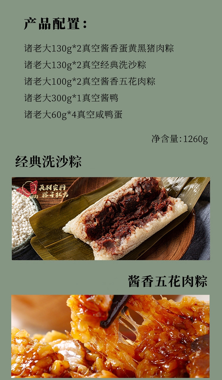 配置清单:诸老大130克*2真空酱香蛋黄黑猪肉粽 诸老大130克*2真空经典洗沙粽 诸老大100克*2真空酱香五花肉粽 诸老大300克*1真空酱鸭 诸老大60克*4真空咸鸭蛋