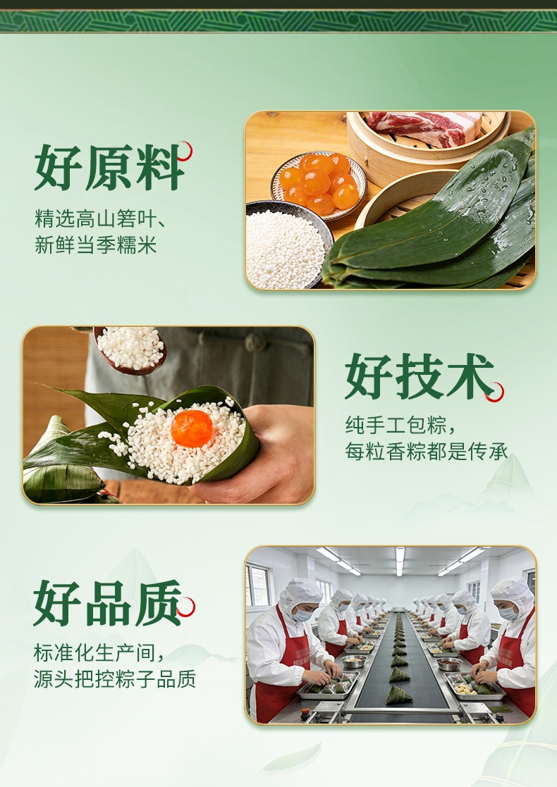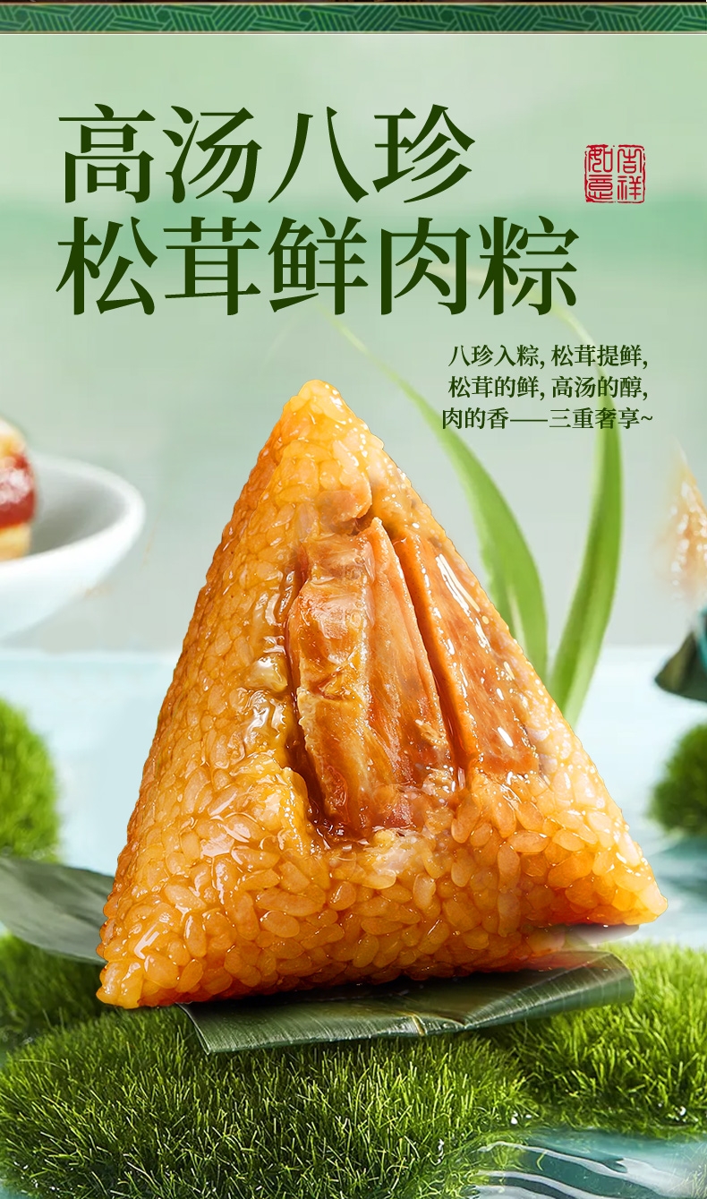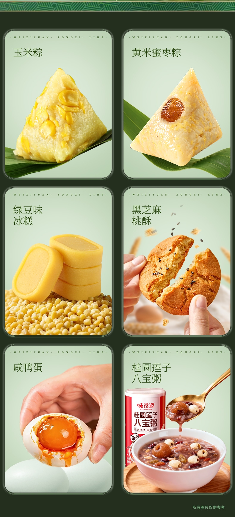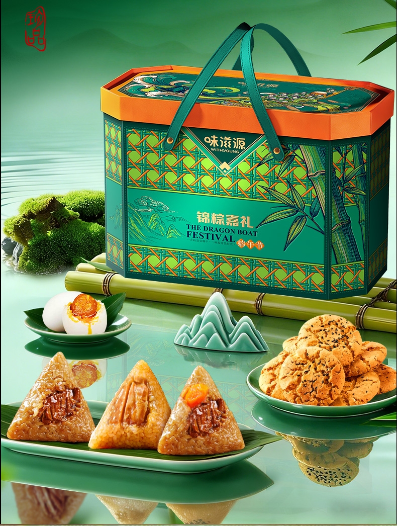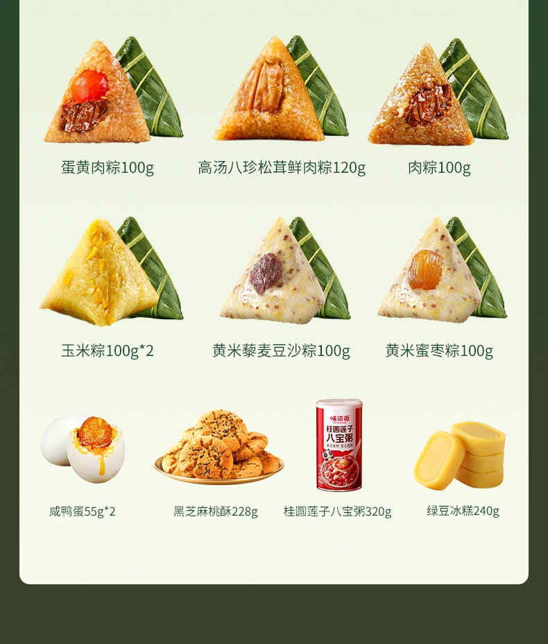 配置清单:味滋源 高汤八珍松茸鲜肉粽120g 味滋源 蛋黄肉粽100g 味滋源 鲜肉粽单枚100g 味滋源 黄米藜麦豆沙粽100g 味滋源 黄米蜜枣粽100g 味滋源 玉米粽100g*2 味滋源 咸鸭蛋55g*2 味滋源 绿豆冰糕240g 味滋源 桂圆莲子八宝粥320g 味滋源 芝麻桃酥228g