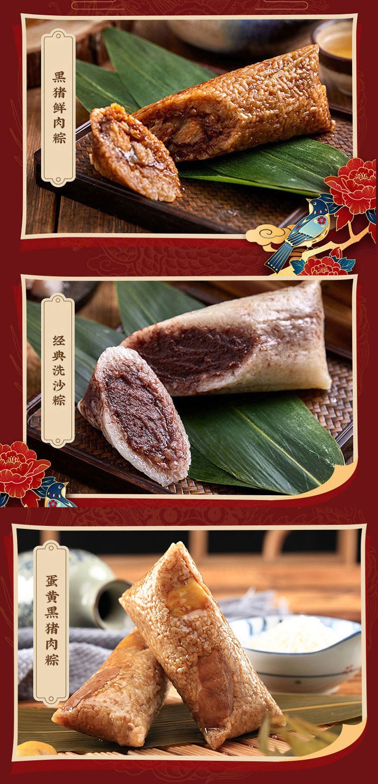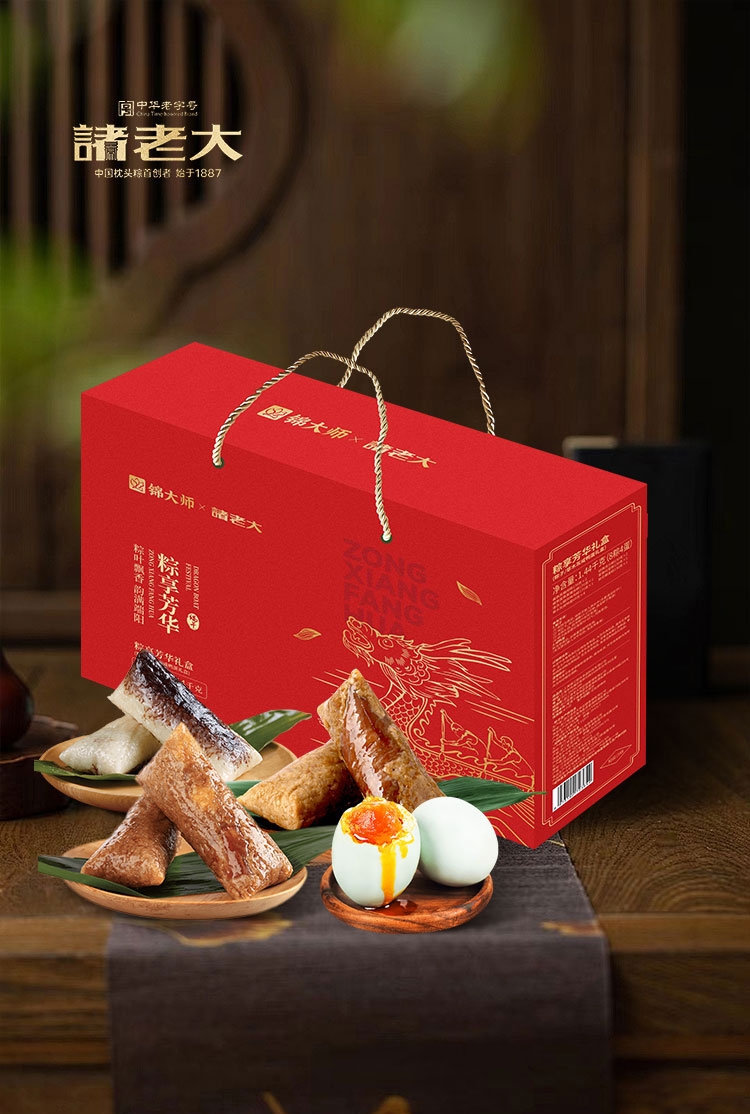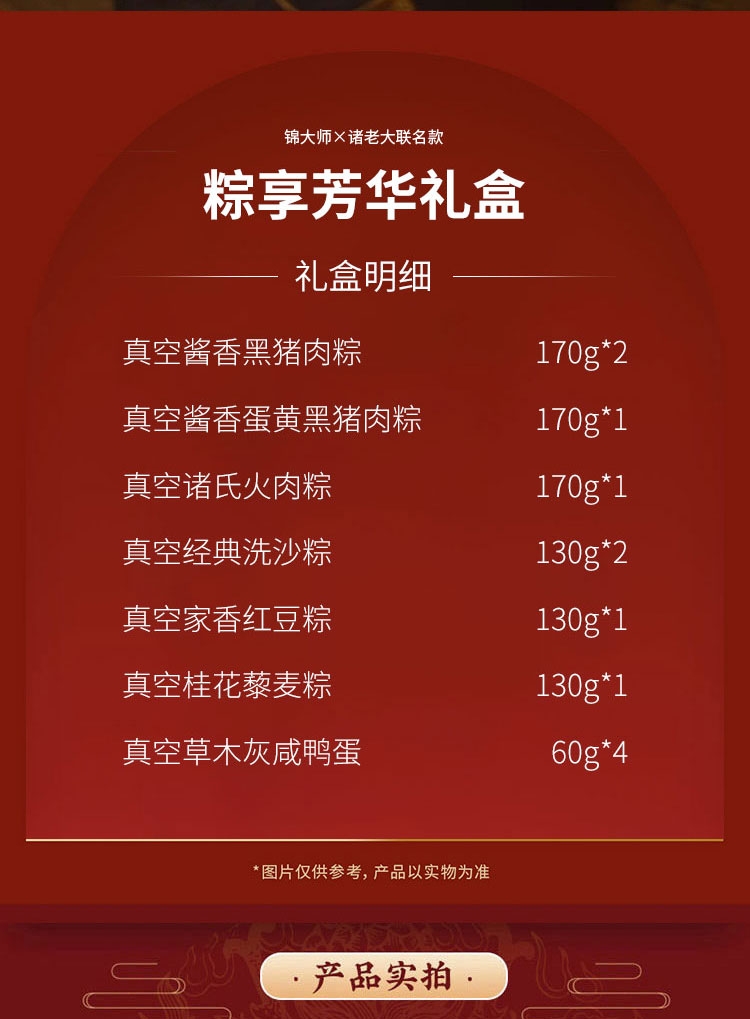 配置清单:170克*1*2真空酱香黑猪肉粽 170克*1真空酱香蛋黄黑猪肉粽 170克*1真空诸氏火肉粽 130克*1*2真空经典洗沙粽 130克*1真空家香红豆粽 130克*1真空桂花藜麦粽 60克*4真空草木灰咸鸭蛋