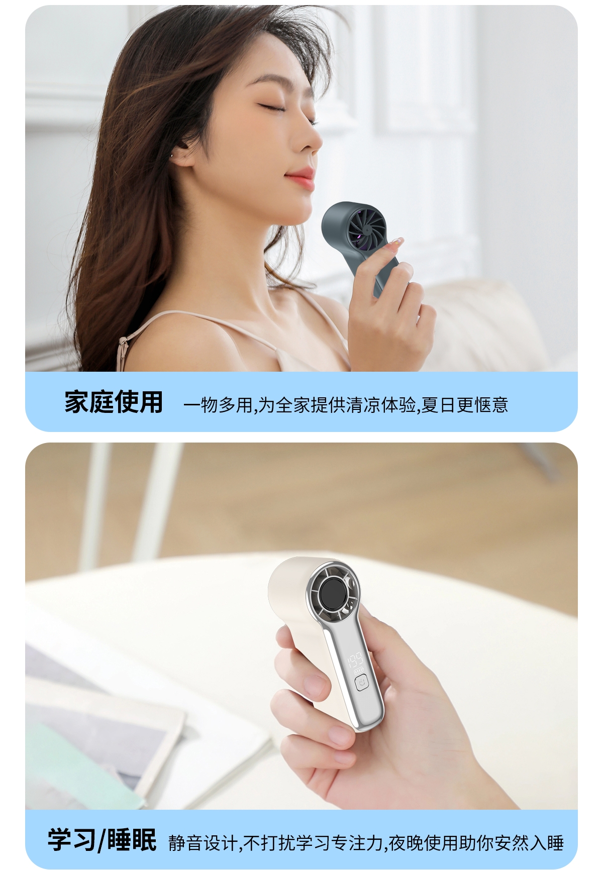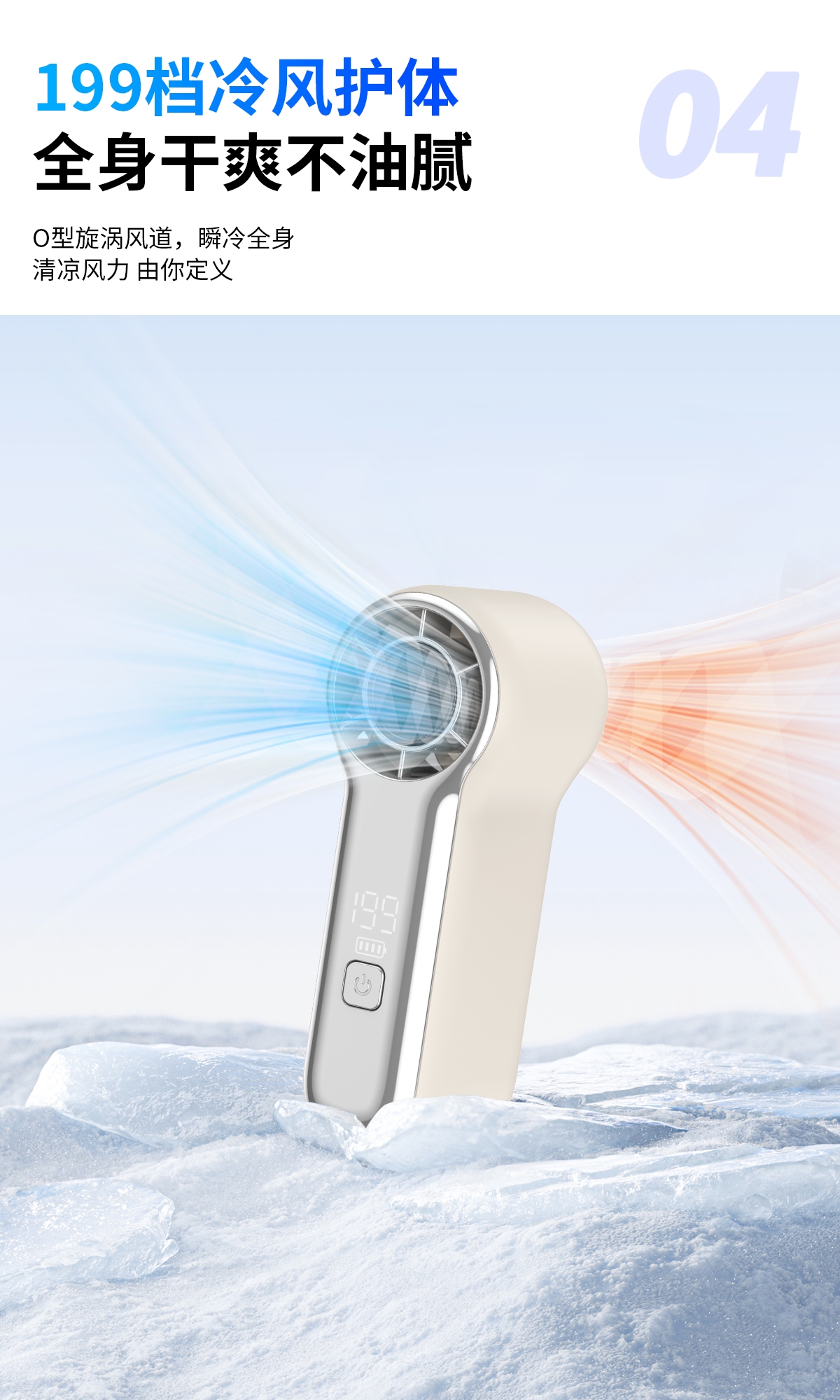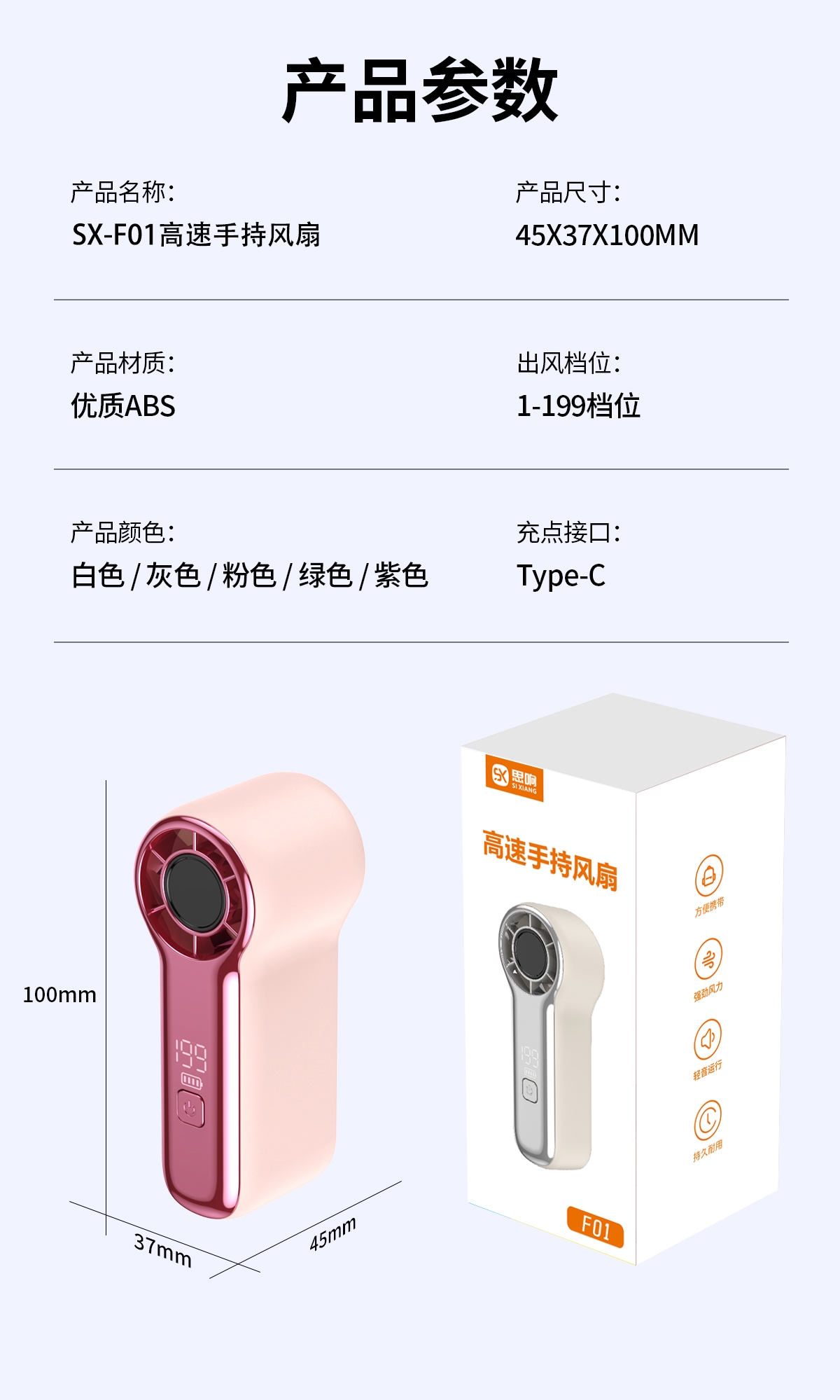 产品风量1-199档可调,风力强劲;简洁时尚;产品小巧携带方便,可定制企业LOGO