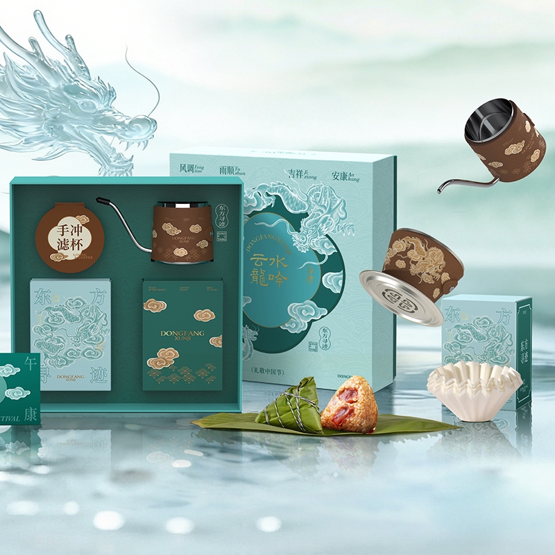 配置:① 太空银手冲滤杯×1只 ② 不锈钢手冲壶×1把 ③ 滤·壶PU隔热套×1套 ④ 蛋糕杯滤纸×1盒 ⑤ 发芽糙米粽×2只(100g/只) ⑥ 端午礼卡×1份 ⑦ 云水龙吟礼盒×1套(含袋)