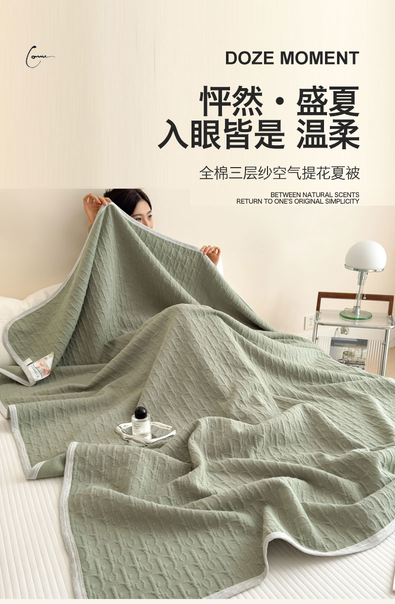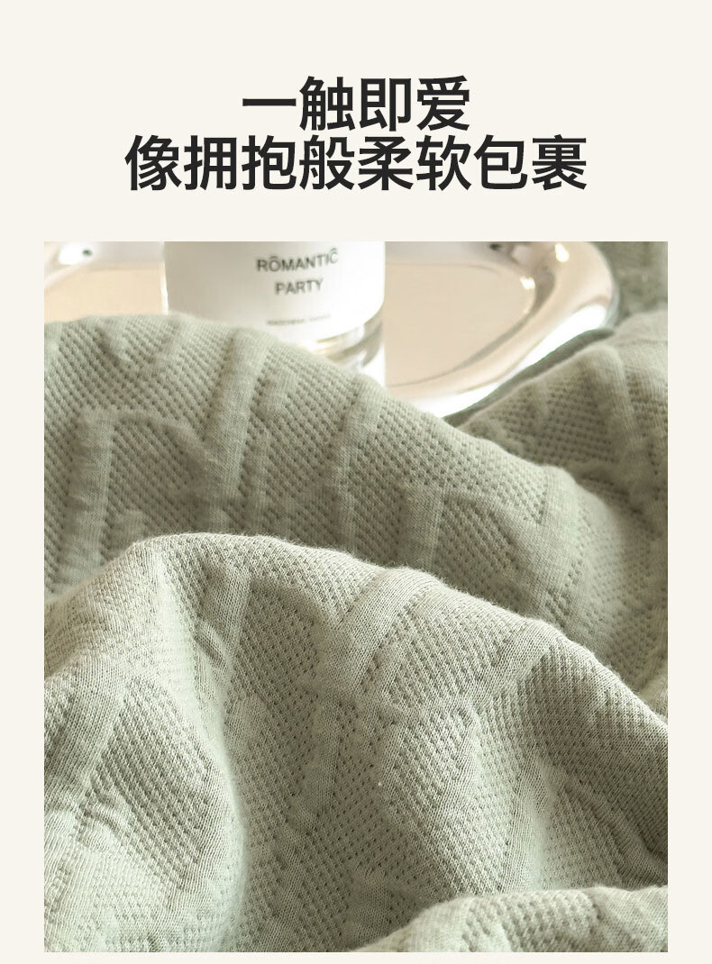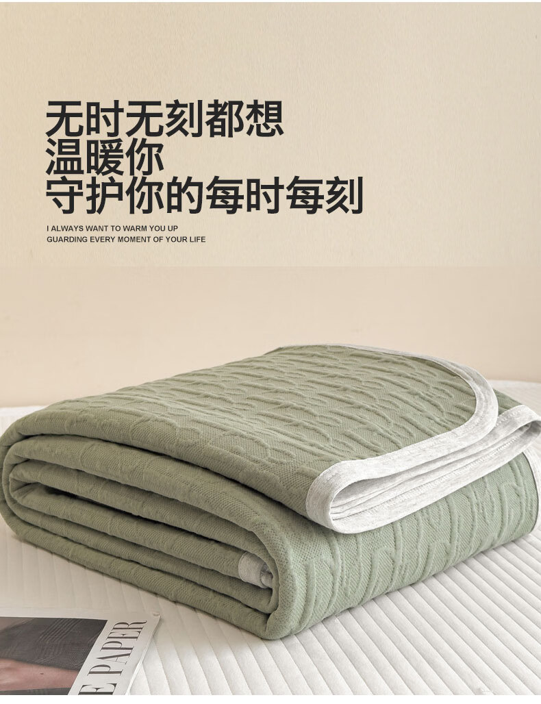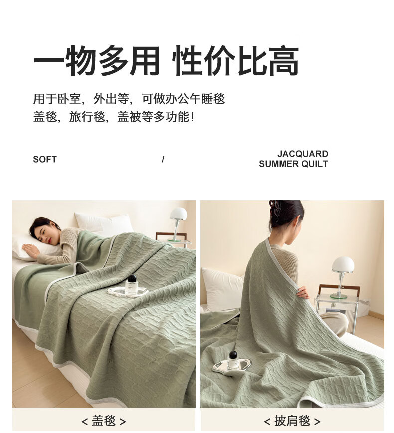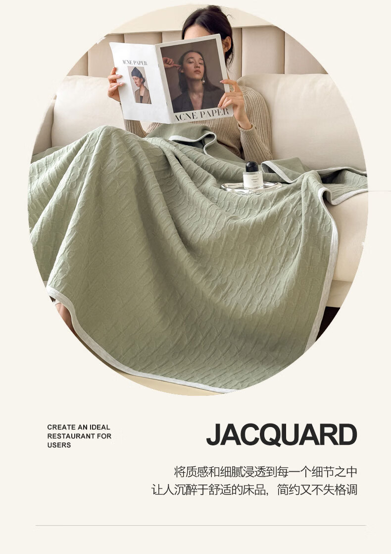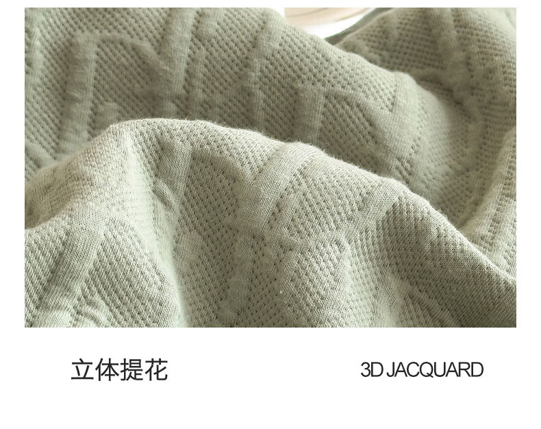 采用100%高克重全棉面料,通过提花工艺;形成立体纹理空气层结构让它兼具透气性与蓬松感,;触感柔软亲肤。功能多用,居家、车载、办公皆宜。