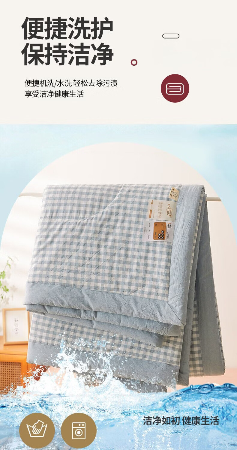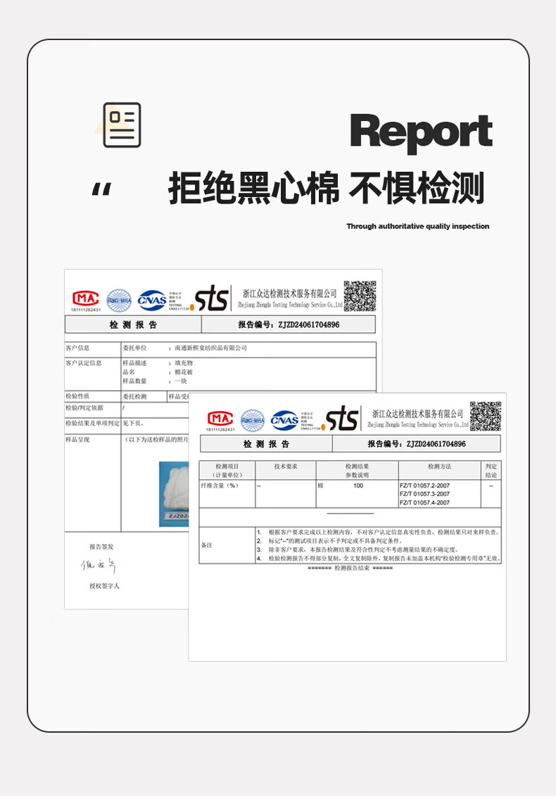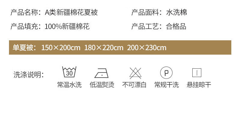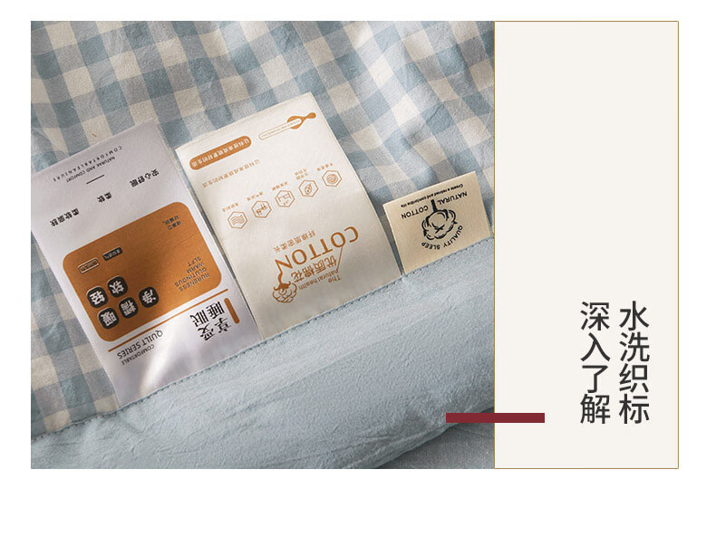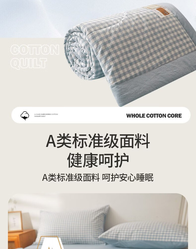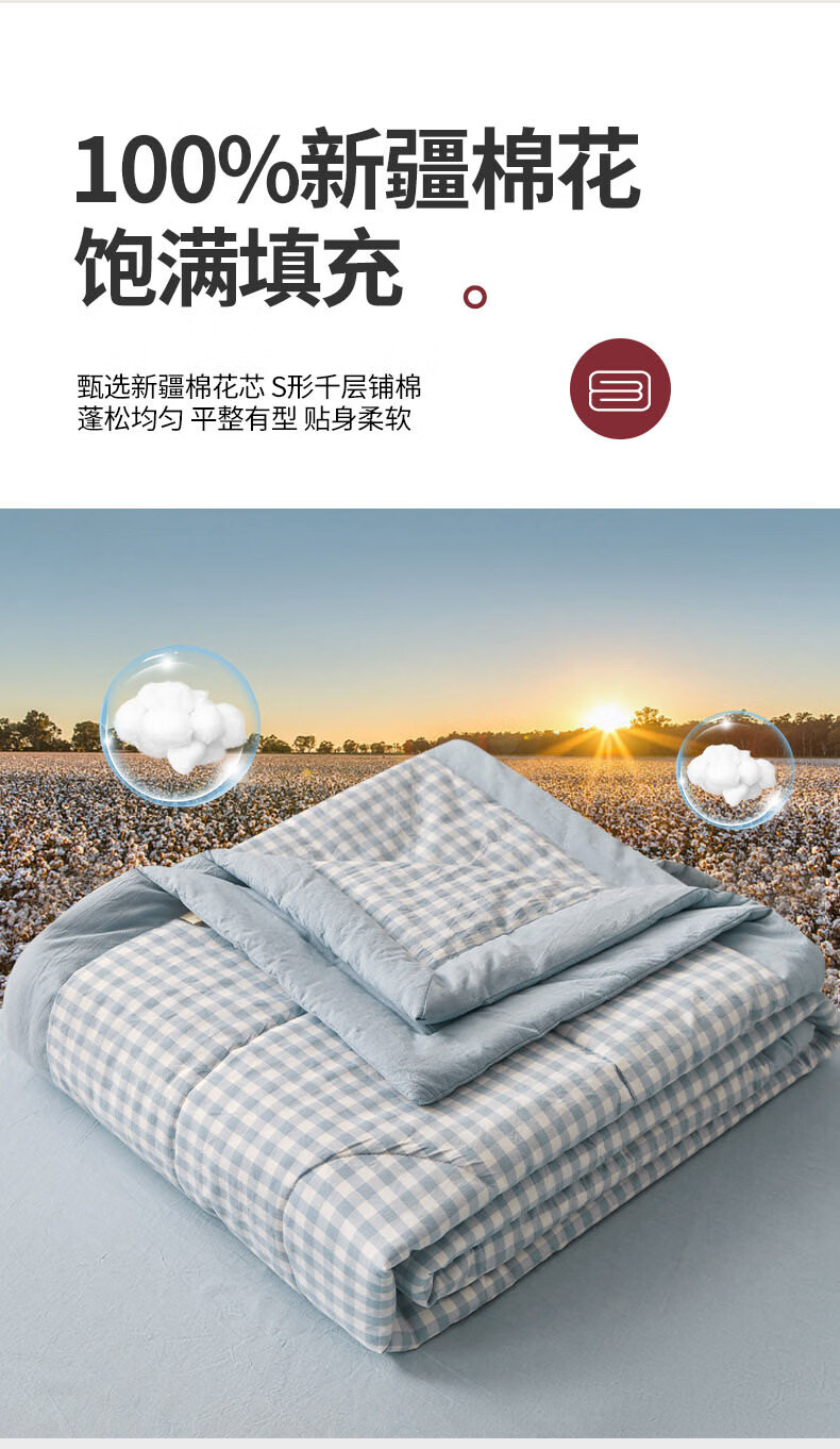 甄选A类水洗棉面料,无荧光等有害物质,呵护安心睡眠;填充整张100%新疆棉花,蓬松性好,亲肤细腻;新一代活性印染工艺,颜色靓丽,不易起球,不易褪色